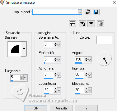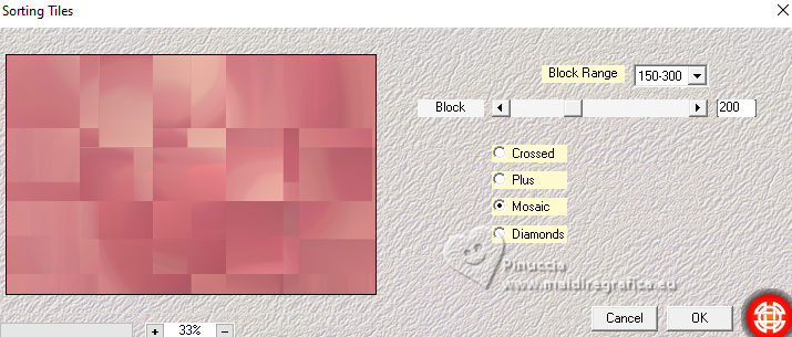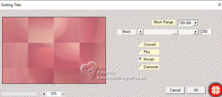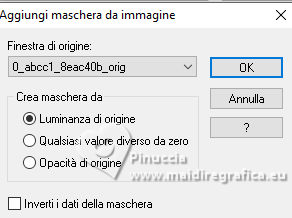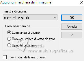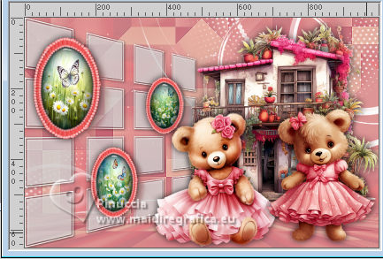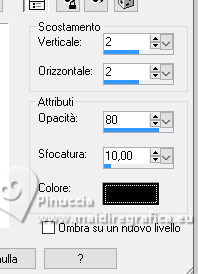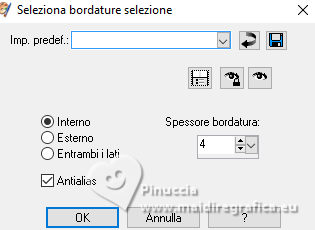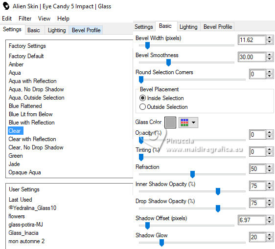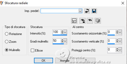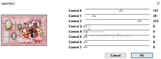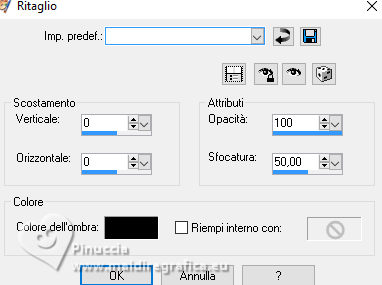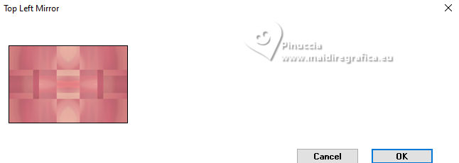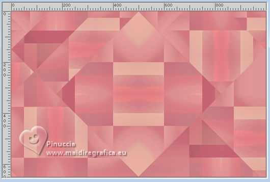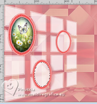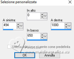 qui puoi trovare qualche risposta ai tuoi dubbi. Se l'argomento che ti interessa non è presente, ti prego di segnalarmelo. Questo tutorial è stato realizzato con PSPX3 e tradotto con PSPX9, ma può essere realizzato anche con le altre versioni di PSP. Dalla versione X4, il comando Immagine>Rifletti è stato sostituito con Immagine>Capovolgi in orizzontale, e il comando Immagine>Capovolgi con Immagine>Capovolgi in verticale. Nelle versioni X5 e X6, le funzioni sono state migliorate rendendo disponibile il menu Oggetti. Con la nuova versione X7, sono tornati Rifletti>Capovolgi, ma con nuove varianti. Vedi la scheda sull'argomento qui Grazie ai creatori dei tubes che mettono a disposizione il loro lavoro in vari gruppi di condivisione. Rispetta il lavoro degli autori, non cambiare il nome del file e non cancellare il watermark. traduzione francese qui traduzione inglese qui Le vostre versioni qui![]() Occorrente: Materiale qui I tubes sono di Adrienne (in questa pagina trovi i links ai siti dei creatori di tubes) Filtri: in caso di dubbi, ricorda di consultare la mia sezione filtri qui Filters Unlimited 2.0 qui Mehdi - Sorting Tiles qui Mura's Meister - Perspective Tiling qui Simple - Top Left Mirror, Blintz qui Alien Skin Eye Candy 5 Impact - Glass qui [AFS IMPORT] - sqborder2 qui AAA Frames - Foto Frame qui I filtri Simple e AFS IMPORT si possono usare da soli o importati in Filters Unlimited (come fare vedi qui) Se un filtro fornito appare con questa icona ![]() non esitare a cambiare modalità di miscelatura e opacità secondo i colori utilizzati. ![]() Apri le maschere in PSP e minimizzale con il resto del materiale. 1. Scegli 3 colori dai tuoi tubes ![]() Imposta il colore di primo piano con il colore 1 e il colore di sfondo con il colore 2. ![]() Apri una nuova immagine trasparente 1000 x 650 pixels. Riempi l'immagine trasparente con il colore di sfondo (colore 2)Livelli>Nuovo livello raster. Selezione>Seleziona tutto. Apri l'immagine di sfondo Wine Country Paper (2) ![]() Modifica>Copia. Torna al tuo lavoro e vai a Modifica>Incolla nella selezione. Selezione>Deseleziona. Se necessario, cambia la modalità di miscelatura di questo livello in Luminanza (esistente). Livelli>Unisci>Unisci giù. Effetti>Effetti di immagine>Motivo unico con i settaggi standard. ![]() 2. Regola>Sfocatura>Sfocatura radiale. ![]() Effetti>Plugins>Mehdi – Sorting Tiles ![]() Ripeti Effetti>Plugins>Mehdi – Sorting Tiles ![]() Effetti>Effetti di riflesso>Specchio rotante. ![]() Immagine>Rifletti. Effetti>Plugins>Simple - Top Left Mirror. ![]() 3. Effetti>Plugins>Simple - Blintz. Immagine>Rifletti. Di nuovo Effetti>Plugins>Simple - Blintz. Immagine>Ruota a sinistra - 2 volte Ancora Effetti>Plugins>Simple – Blintz Di nuovo Immagine>Ruota a sinistra - 2 volte. Dovresti avere questo ![]() 4. Effetti>Effetti di bordo>Aumenta. Livelli>Duplica. Effetti>Plugins>Mura's Meister - Perspective Tiling. ![]() Effetti>Effetti di riflesso>Specchio rotante. ![]() Imposta il colore di primo piano con il colore bianco. Livelli>Nuovo livello raster. Riempi il livello con il colore bianco.Livelli>Nuovo livello maschera>da immagine. Apri il menu sotto la finestra di origine e vedrai la lista dei files aperti. Seleziona la maschera 0_abcc1_8eac40b_orig ![]() Effetti>Effetti di bordo>Aumenta. Livelli>Unisci>Unisci gruppo. 5. Attiva lo strumento Selezione ![]() (non importa il tipo di selezione impostato, perché con la selezione personalizzata si ottiene sempre un rettangolo) clicca sull'icona Selezione personalizzata ![]() e imposta i seguenti settaggi. ![]() Premi sulla tastiera il tasto CANC ![]() Selezione>Deseleziona. Apri frame©ILR ![]() Modifica>Copia. Torna al tuo lavoro e vai a Modifica>Incolla come nuovo livello. Tasto K per attivare lo strumento Puntatore ![]() e imposta Posizione X: 21,00 e Posizione: 56,00. ![]() Attiva lo strumento Bacchetta magica ![]() e clicca nella cornice più grande per selezionarla. ![]() Livelli>Nuovo livello raster. Apri ButterfliesDaisiesBGJPG1 ![]() Modifica>Copia. Torna al tuo lavoro e vai a Modifica>Incolla nella selezione. Regola>Messa a fuoco>Metti a fuoco. 6. Livelli>Nuovo livello raster. Effetti>Effetti 3D>Ritaglio. ![]() Effetti>Plugins>Alien Skin Eye Candy 5 Impact – Glass seleziona il preset Clear, con i seguenti settaggi. ![]() Selezione>Deseleziona. Livelli>Unisci>Unisci giù. Attiva nuovamente il livello Raster 2. Clicca con la Bacchetta magica nella cornice inferiore.![]() 7. Livelli>Nuovo livello raster. Apri la seconda immagine ButterflyDaisiesBJPG13 ![]() Modifica>Copia. Torna al tuo lavoro e vai a Modifica>Incolla nella selezione. Regola>Messa a fuoco>Metti a fuoco. Livelli>Nuovo livello raster. Effetti>Effetti 3D>Ritaglio, con i settaggi precedenti. Effetti>Plugins>Alien Skin Eye Candy 5 Impact – Glass - Clear. Selezione>Deseleziona. Livelli>Unisci>Unisci giù. 8. Attiva nuovamente il livello Raster 2. Clicca con la bacchetta magica nella cornice a destra.Livelli>Nuovo livello raster. Apri la terza immagine ButterfliesDaisiesBGJPG3 ![]() Modifica>Copia. Torna al tuo lavoro e vai a Modifica>Incolla nella selezione. Regola>Messa a fuoco>Metti a fuoco. Livelli>Nuovo livello raster. Effetti>Effetti 3D>Ritaglio, con i settaggi precedenti. Effetti>Plugins>Alien Skin Eye Candy 5 Impact – Glass - Clear Selezione>Deseleziona. Livelli>Unisci>Unisci giù. Attiva il livello superiore. Livelli>Unisci>Unisci giù - 3 volte. Effetti>Effetti 3D>Sfalsa ombra. ![]() 9. Attiva il livello della maschera. Effetti>Effetti 3D>Sfalsa ombra. ![]() Attiva il livello inferiore. Livelli>Nuovo livello raster. Riempi il livello con il colore bianco.Livelli>Nuovo livello maschera>da immagine. Apri il menu sotto la finestra di origine e seleziona la maschera mask_vjf_originale ![]() Effetti>Effetti di bordo>Aumenta. Livelli>Unisci>Unisci gruppo. 10. Attiva il livello superiore. Apri il tube della casa Wine Country Element(2) ![]() Modifica>Copia. Torna al tuo lavoro e vai a Modifica>Incolla c
