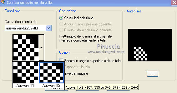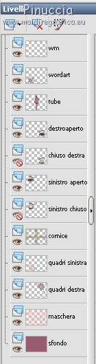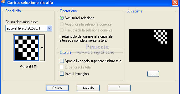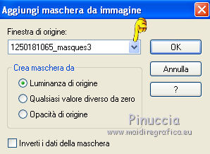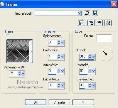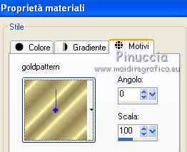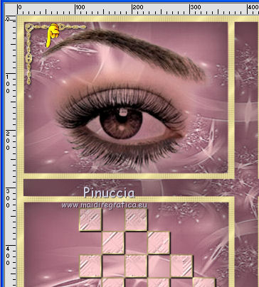 qui puoi trovare qualche risposta ai tuoi dubbi. Se l'argomento che ti interessa non è presente, ti prego di segnalarmelo. Questo tutorial è stato creato con PSP X2, ma può essere eseguito anche con le altre versioni di PSP. Per tradurlo, ho usato PSP X. Grazie ai creatori dei tubes che mettono a disposizione il loro lavoro in vari gruppi di condivisione. Rispetta il lavoro degli autori, non cambiare il nome del file e non cancellare il watermark. Occorrente: Materiale qui Per il poser grazie Gerda. Filtri: Xero - Improver qui Animation Shop qui Metti la trama "138" nella cartella Trame. Apri il motivo goldpattern e minimizzalo. Lo troverai nella lista dei motivi disponibili quando ti servirà. Apri la maschera in PSP e minimizzala con il resto del materiale. 1. Apri "auswahlen-tut202". Duplicala usando la combinazione di tasti maiuscola+D e chiudi l'originale. La copia sarà la base del tuo lavoro. L'immagine non è vuota, ma contiene le selezioni salvate sul canale alfa. Scegli due colori dal tuo tube. Imposta il colore di primo piano con il colore chiaro, e il colore di sfondo con il colore scuro. Riempi l'immagine trasparente con il colore di sfondo.Livelli>Nuovo livello raster. Riempi con il colore di primo piano.Livelli>Nuovo livello maschera>Da immagine. Apri il menu sotto la finestra di origine e vedrai la lista dei files aperti. Seleziona la maschera "1250181065_masques3", con i seguenti settaggi. ![]() Livelli>Unisci>Unisci gruppo. Effetti>Effetti di bordo>Aumenta. 2. Livelli>Nuovo livello raster. Selezione>Carica/Salva selezione>Carica selezione da canale alfa. La selezione Auswahl#1 è subito disponibile. Devi soltanto cliccare Carica. ![]() Passa il colore di primo piano a Motivi, e - tra Immagini Aperte - seleziona il motivo oro. ![]() Riempi la selezione con il motivo oro.Selezione>Modifica>Contrai - 2 pixels. ![]() Riempi con il colore di sfondo.Effetti>Effetti di trama>Trama - seleziona la trama "138" con i seguenti settaggi. ![]() Selezione>Deseleziona. Effetti>Effetti 3D>Sfalsa ombra. ![]() Livelli>Nuovo livello raster. Selezione>Carica/Salva selezione>Carica selezione da canale alfa. Apri il menu delle selezioni e carica Auswahl#2. ![]() Riempi la selezione con il motivo oro.Selezione>Modifica>Contrai - 2 pixels. Riempi con il colore di primo piano.Effetti>Effetti di trama>Trama, con i settaggi precedenti. Selezione>Deseleziona. Effetti>Effetti 3D>Sfalsa ombra, con i settaggi precedenti. 3. Apri "rahmen_tut202" e vai a Modifica>Copia. Torna al tuo lavoro e vai a Modifica>Incolla come nuovo livello. Apri "winkle eye" e copia il livello inferiore. Torna al tuo lavoro e vai a Modifica>Incolla come nuovo livello. Spostalo nel riquadro in alto a sinistra.(se stai usando altri colori, adatta il livello ai tuoi colori. Sul Viraggio vedi qui) Rinomina questo livello "sinistro chiuso". Livelli>Duplica. Immagine>Rifletti. Sposta l'occhio nel riquadro in basso a destra.Rinomina questo livello "destro chiuso". 4. Attiva nuovamente "winkle eye" e copia il livello superiore. Torna al tuo lavoro e vai a Modifica>Incolla come nuovo livello. Sposta l'occhio nel riquadro in alto a sinistra,facendolo combaciare con l'occhio chiuso (prendi come riferimento le sopracciglia). ![]() Rinomina questo livello "sinistro aperto". Livelli>Duplica. Immagine>Rifletti. Sposta questo occhio nel riquadro in basso a destra.Rinomina questo livello "destro aperto". Chiudi i livelli "sinistro chiuso" e "destro chiuso". Rimani posizionato sul livello superiore. 5. Apri il tube del personaggio e vai a Modifica>Copia. Torna al tuo lavoro e vai a Modifica>Incolla come nuovo livello. Immagine>Ridimensiona, all'80%, tutti i livelli non selezionato. Effetti>Plugins>Xero - Improver, clicca su Landscape e ok. ![]() Effetti>Effetti 3D>Sfalsa ombra. ![]() Scrivi un tuo testo o copia e incolla il wordart che trovi nel materiale. Aggiungi il tuo nome e/o il tuo watermark su un nuovo livello, senza dimenticare il copyright delle immagini usate. Questa dovrebbe essere la tua paletta dei livelli. ![]() 8. Animazione. Modifica>Copia Unione. Apri Animation Shop e vai a Modifica>Incolla>Incolla come nuova animazione. In PSP. Chiudi "sinistro aperto" e apri "sinistro chiuso". ![]() Modifica>Copia Unione. In Animation Shop: Modifica>Incolla>Incolla dopo il fotogramma corrente. In PSP Chiudi "sinistro chiuso" e apri "sinistro aperto". ![]() Modifica>Copia Unione. In Animation Shop: Modifica>Incolla>Incolla dopo il fotogramma corrente. In PSP. Chiudi "destro aperto" e apri "destro chiuso". ![]() Modifica>Copia Unione. In Animation Shop: Modifica>Incolla>Incolla dopo il fotogramma corrente. In PSP. Chiudi "destro chiuso" e apri "destro aperto". ![]() Modifica>Copia Unione. In Animation Shop: Modifica>Incolla>Incolla dopo il fotogramma corrente. In PSP. Chiudi "destro aperto" e "sinistro aperto". Apri "destro chiuso" e "sinistro chiuso. ![]() Modifica>Copia Unione. In Animation Shop: Modifica>Incolla>Incolla dopo il fotogramma corrente. Tenendo premuto il tasto Ctrl, clicca sui fotogrammi 1, 3 e 5 (soltanto questi fotogrammi saranno selezionati e avranno la cornice blu). Animazione>Proprietà fotogramma, e imposta la velocità a 300. ![]() Clicca sui fotogrammi 2, 4 e 6. Animazione>Proprietà fotogramma, e imposta la velocità a 5. ![]() Controlla il risultato cliccando su Visualizza e salva in formato gif.![]() Se hai problemi o dubbi, o trovi un link non funzionante, o anche soltanto per un saluto, scrivimi. 15 Settembre 2012 |
