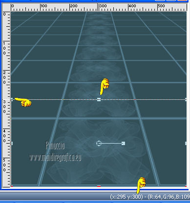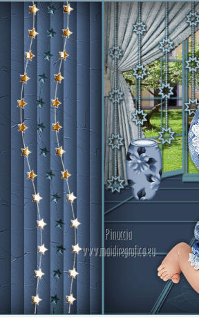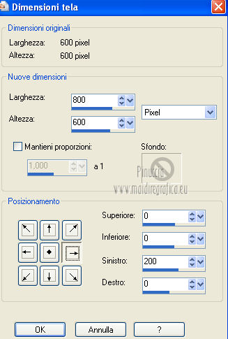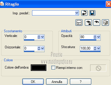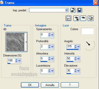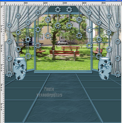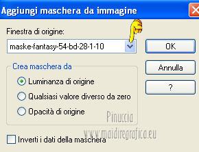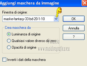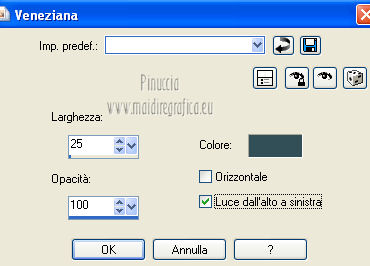 qui puoi trovare qualche risposta ai tuoi dubbi. Se l'argomento che ti interessa non è presente, ti prego di segnalarmelo. Questo tutorial è stato creato con PSP X5, ma può essere eseguito anche con le altre versioni di PSP. Per tradurlo, ho usato PSP X. Grazie ai creatori dei tubes che mettono a disposizione il loro lavoro in vari gruppi di condivisione. Rispetta il lavoro degli autori, non cambiare il nome del file e non cancellare il watermark. Occorrente: Un tube a scelta. Il resto del materiale qui Per il mio esempio ho usato un tube di LexHa. Per la foto e le maschere grazie Bärbel Il testo "Lotta" si riferisce al poser usato dall'autrice del tutorial originale. Filtri Xero - Improver qui Metti la trama "49" nella cartella Trame. Apri le maschere in PSP e minimizzale con il resto del materiale. 1. Scegli due colori dal tuo tube. Imposta il colore di primo piano con il colore chiaro, e il colore di sfondo con il colore scuro. Apri una nuova immagine trasparente 600 x 600 pixels, e riempila con il colore di sfondo.Livelli>Nuovo livello raster. Riempi con il colore di primo piano.Livelli>Nuovo livello maschera>Da immagine. Apri il menu sotto la finestra di origine e vedrai la lista dei files aperti. Seleziona la maschera "maske-fantasy-33-bd-20-1-10", con i seguenti settaggi: ![]() Livelli>Unisci>Unisci gruppo. Premi il tasto K per attivare lo strumento Puntatore ![]() se stai usando PSP 9 il tasto D (valido per tutte le versioni) per attivare lo strumento Deformazione ![]() in modalità Scala spingi il nodo centrale in alto, fino a 300 pixels. ![]() Premi sulla tastiera il tasto M per deselezionare la griglia dello strumento. Effetti>Effetti 3D>Sfalsa ombra. ![]() 2. Livelli>Nuovo livello raster. Riempi con il colore di primo piano.Livelli>Nuovo livello maschera>Da immagine. Apri il menu sotto la finestra di origine e vedrai la lista dei files aperti. Seleziona la maschera "maske-fantasy-54-b-28-1-10", con i seguenti settaggi: ![]() Livelli>Unisci>Unisci gruppo. Ancora tasto K/D per attivare Puntatore/Deformazione, e spingi il nodo inferiore centrale verso l'alto come nell'esempio. ![]() Effetti>Effetti 3D>Sfalsa ombra, con i settaggi precedenti. Attiva lo strument Selezione a mano libera ![]() e traccia una selezione intorno alla "finestra" della maschera. ![]() Livelli>Nuovo livello raster. Livelli>Disponi>Sposta giù (sotto il livello della maschera). Apri l'immagine di sfondo e vai a Modifica>Copia. Torna al tuo lavoro e vai a Modifica>Incolla nella selezione. Selezione>Deseleziona. Attiva il livello superiore. Apri "lace curtans" e vai a Modifica>Copia. Torna al tuo lavoro e vai a Modifica>Incolla come nuovo livello. Sposta il tube contro il bordo superiore.3. Apri "sternenvorhang" e vai a Modifica>Copia. Torna al tuo lavoro e vai a Modifica>Incolla come nuovo livello. Sposta anche questo tube contro il bordo superiore.Effetti>Effetti 3D>Sfalsa ombra, con i settaggi precedenti. Apri "vases-001-sandi". Scegli un vaso e attiva il livello corrispondente. Modifica>Copia. Torna al tuo lavoro e vai a Modifica>Incolla come nuovo livello. Immagine>Ridimensiona, al 50%, tutti i livelli non selezionato. Spostalo in basso a destra.Livelli>Duplica. Immagine>Rifletti. ![]() Apri il tuo tube e vai a Modifica>Copia. Torna al tuo lavoro e vai a Modifica>Incolla come nuovo livello. Immagine>Ridimensiona, se e quanto necessario, tutti i livelli non selezionato. Effetti>Plugins>Xero - Improver. ![]() Effetti>Effetti 3D>Sfalsa ombra. ![]() Livelli>Nuovo livello raster. Selezione>Seleziona tutto. Riempi con il colore di primo piano.Selezione>Modifica>Contrai - 2 pixels. Effetti>Effetti 3D>Ritaglio. ![]() Selezione>Deseleziona. 4. Attiva il livello inferiore. Immagine>Dimensioni tela ![]() Attiva lo strumento Bacchetta magica ![]() e clicca nello spazio trasparente per selezionarlo. Livelli>Nuovo livello raster. Livelli>Disponi>Sposta giù. Riempi la selezione con il colore di primo piano.Effetti>Effetti di trama>Trama - seleziona la trama "49" con i seguenti settaggi. ![]() Effetti>Effetti di trama>Veneziana - con il tuo colore di sfondo. ![]() Livelli>Nuovo livello raster. Riempi con il colore di primo piano.Selezione>Modifica>Contrai - 2 pixels. Effetti>Effetti 3D>Ritaglio, con i settaggi precedenti. Selezione>Deseleziona. Apri "sternenschnur" e vai a Modifica>Copia. Torna al tuo lavoro e vai a Modifica>Incolla come nuovo livello. Spostalo al centro dell'effetto Veneziana.![]() Scrivi un testo sull'immagine. Aggiungi il tuo nome e/o il tuo watemark senza dimenticare eventuali copyright delle immagini usate. Livelli>Unisci>Unisci tutto e salva in formato jpg. ![]() Se hai problemi o dubbi, o trovi un link non funzionante, o anche soltanto per un saluto, scrivimi. 10 Ottobre 2012 |