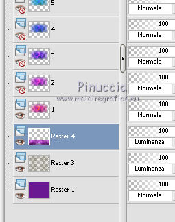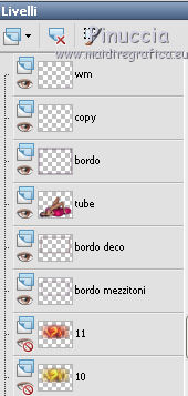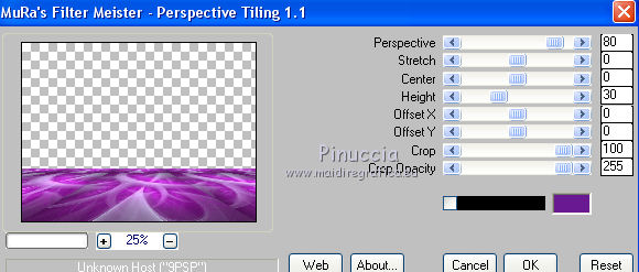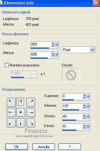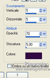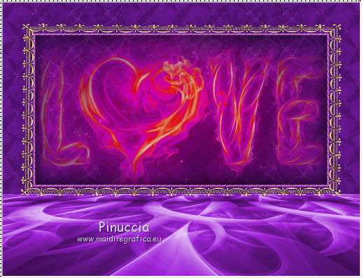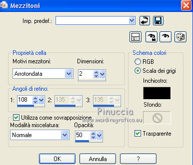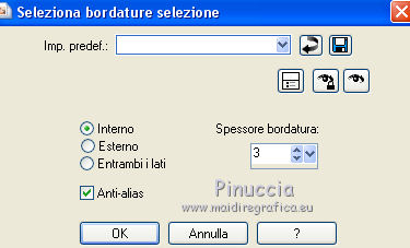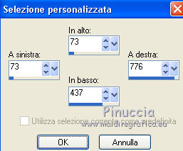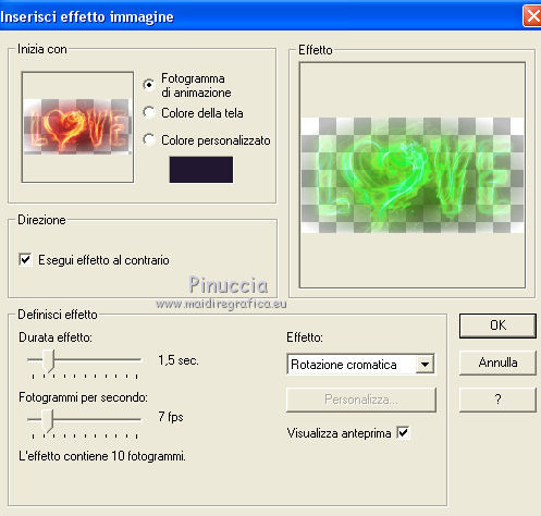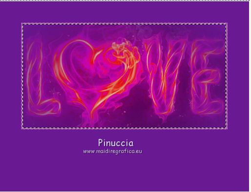 qui puoi trovare qualche risposta ai tuoi dubbi. Se l'argomento che ti interessa non è presente, ti prego di segnalarmelo. Questo tutorial è stato creato con PSP X5, ma può essere eseguito anche con le altre versioni di PSP. Per tradurlo, ho usato PSP X. Se stai usando le nuove versioni di PSP, a proposito delle funzioni Rifletti/Capovolgi, vedi la mia scheda qui Grazie ai creatori dei tubes che mettono a disposizione il loro lavoro in vari gruppi di condivisione. Rispetta il lavoro degli autori, non cambiare il nome del file e non cancellare il watermark. Occorrente: Un tube a scelta. Il resto del materiale qui Per il tube grazie Angela V. Per il frattale grazie Bärbel Filtri: Xero - Improver qui Mura's Meister - Perspective Tiling qui Animation Shop qui Il materiale fornito può essere colorizzato. Prendi nota dei valori di Tonalità (H) e Saturazione (S) del colore scelto, Regola>Tonalità e Saturazione>Viraggio, e trascrivi i valori annotati nelle rispettive caselle. ![]() Se il risultato visibile nella finestra di anteprima non ti soddisfa, puoi giocare con il valore di Saturazione. ***** 1. Apri Animation Shop. Apri il tube "K@rine_dreams_Msted_Love". Effetti>Inserisci effetto immagine e imposta i seguenti settaggi. ![]() Modifica>Seleziona tutto. In PSP: Modifica>Incolla come nuova immagine, e avrai un'immagine composta da 11 fotogrammi, che sarà la base del tuo lavoro. Rinomina i livelli dal basso in alto da 1 a 11 e lascia visibile soltanto il livello "1". ![]() 2. Scegli due colori dai tuoi tubes. Imposta il colore di primo piano con il colore chiaro, e il colore di sfondo con il colore scuro. Livelli>Nuovo livello raster. Livelli>Disponi>Porta sotto. Immagine>Dimensioni tela - 850 x 600 pixels. ![]() Di nuovo Immagine>Dimensioni tela - 850 x 650 pixels. ![]() Riempi il livello con il colore di sfondo.Attiva lo strumento Selezione ![]() clicca sull'icona Selezione personalizzata ![]() e imposta i seguenti settaggi. ![]() Selezione>Inverti. Attiva uno alla volta i livelli da "1" a "11" (non occorre aprire i livelli chiusi) e premi ogni volta sulla tastiera il tasto CANC ![]() Attiva il livello superiore. Livelli>Nuovo livello raster. Selezione>Inverti. 3. Selezione>Modifica>Seleziona bordature selezione. ![]() Riempi con il colore di primo piano.Effetti>Effetti artistici>Mezzitoni. ![]() Effetti>Effetti di bordo>Aumenta. Selezione>Deseleziona. Attiva lo strumento Bacchetta magica ![]() ![]() Clicca al centro della cornice per selezionarla. ![]() Effetti>Effetti 3D>Ritaglio. ![]() Selezione>Deseleziona. 4. Attiva il livello inferiore. Livelli>Nuovo livello raster. Apri "karo-5-bd-17-11-13" e vai a Modifica>Copia. Torna al tuo lavoro e vai a Modifica>Incolla nella selezione. Cambia la modalità di miscelatura di questo livello in Luminanza. Effetti>Effetti di bordo>Aumenta. Mantieni selezionato. Livelli>Nuovo livello raster. Apri "Hintergrund-1-bd-27-10-13" e vai a Modifica>Copia. Torna al tuo lavoro e vai a Modifica>Incolla nella selezione. Selezione>Deseleziona. Effetti>Plugins>Mura's Meister - Perspective Tiling. ![]() Cambia la modalità di miscelatura di questo livello in Luminanza o Colorizza (Regola>Tonalità e Saturazione>Viraggio). ![]() 5. Attiva il livello superiore. Apri "075_BKD_DecorativeFrame" e copia il livello 3. Torna al tuo lavoro e vai a Modifica>Incolla come nuovo livello. Effetti>Effetti artistici>Mezzitoni. Posiziona correttamente la cornice sul bordo.![]() Effetti>Effetti 3D>Sfalsa ombra, con un colore molto scuro scelto dal tuo lavoro. ![]() Ripeti l'Effetto Sfalsa ombra, cambiando verticale e orizzontale con -5. Dovresti avere questo. ![]() Ripeti Selezione personalizzata ![]() ![]() Attiva il secondo livello dal basso. Premi sulla tastiera il tasto CANC. Selezione>Deseleziona. 6. Apri il tuo tube e vai a Modifica>Copia. Torna al tuo lavoro e vai a Modifica>Incolla come nuovo livello. Immagine>Ridimensiona, se e quanto necessario, tutti i livelli non selezionato. Posiziona correttamente il tube.Effetti>Plugins>Xero - Improver. ![]() Effetti>Effetti 3D>Sfalsa ombra. ![]() Livelli>Nuovo livello raster. Selezione>Seleziona tutto. Riempi con il colore di primo piano.Selezione>Modifica>Contrai - 5 pixels. ![]() Effetti>Effetti 3D>Ritaglio, con i settaggi precedenti. ![]() Selezione>Inverti. Effetti>Effetti artistici>Mezzitoni, con i settaggi precedenti. Effetti>Effetti di bordo>Aumenta. Selezione>Deseleziona. Aggiungi il tuo nome e/o il tuo watermark su un nuovo livello, senza dimenticare eventuali copyright delle immagini usate. ![]() ![]() 7. Animazione. Modifica>Copia Unione. Apri Animation Shop e vai a Modifica>incolla>Incolla come nuova animazione. Torna in PSP. Chiudi il livello "1" e apri il livello "2". Modifica>Copia Unione. In Animation Shop Modifica>Incolla>Incolla dopo il fotogramma corrente. In PSP. Chiudi il livello "2" e apri il livello "3". Modifica>Copia Unione. In Animation Shop Modifica>Incolla>Incolla dopo il fotogramma corrente. E così via fino al livello 11. Alla fine avrai un'animazione composta da 11 fotogrammi. Modifica>Seleziona tutto. Animazione>Proprietà fotogramma, e imposta la velocità a 25. ![]() Controlla il risultato cliccando su Visualizza e salva in formato gif.![]() Se hai problemi o dubbi, o trovi un link non funzionante, o anche soltanto per un saluto, scrivimi. 12 Febbraio 2014 |