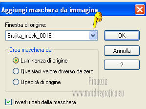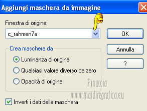 qui puoi trovare qualche risposta ai tuoi dubbi. Se l'argomento che ti interessa non è presente, ti prego di segnalarmelo. Questo tutorial è stato creato con PSP X2, ma può essere eseguito anche con le altre versioni di PSP. Per tradurlo, ho usato PSP X. Grazie ai creatori dei tubes che mettono a disposizione il loro lavoro in vari gruppi di condivisione. Rispetta il lavoro degli autori, non cambiare il nome del file e non cancellare il watermark. Occorrente: Tubes a scelta. Il resto del materiale qui Per i poser usati grazie Marion Per i frattali grazie Bäbel Filtri: Xero - Improver qui Animation Shop qui Apri le maschere in PSP e minimizzale con il resto del materiale. Gli elementi del materiale sono abbinati ai miei colori. Se usi altri colori, usa il Viraggio (come fare vedi qui) 1. Scegli due colori dai tuoi tubes. Imposta il colore di primo piano con il colore chiaro, e il colore di sfondo con il colore scuro. I miei colori: ![]() Apri una nuova immagine trasparente 800 x 600 pixels, e riempila con il colore di sfondo.Livelli>Nuovo livello raster. Riempi con il colore di primo piano.Livelli>Nuovo livello maschera>Da immagine. Apri il menu sotto la finestra di origine e vedrai la lista dei files aperti. Seleziona la maschera "brujita_mask_0016", con i seguenti settaggi: ![]() Livelli>Unisci>Unisci gruppo. Livelli>Duplica. Immagine>Rifletti. Livelli>Unisci>Unisci giù. Effetti>Effetti di bordo>Aumenta. Effetti>Effetti 3D>Sfalsa ombra. ![]() Livelli>Nuovo livello raster. Selezione>Seleziona tutto. Apri "Apop-67-bd-2-10-12" e vai a Modifica>Copia. Torna al tuo lavoro e vai a Modifica>Incolla nella selezione. Selezione>Deseleziona. 2. Livelli>Nuovo livello raster. Riempi con il colore di primo piano.Livelli>Nuovo livello maschera>Da immagine. Apri il menu sotto la finestra di origine e seleziona la maschera "c-rahmen7a", con i seguenti settaggi: ![]() Livelli>Unisci>Unisci gruppo. Effetti>Effetti di bordo>Aumenta. Effetti>Effetti 3D>Sfalsa ombra. ![]() Apri "ID-Apo-86-bd-21-7-12" e vai a Modifica>Copia. Torna al tuo lavoro e vai a Modifica>Incolla come nuovo livello. Immagine>Ridimensiona, al 75%, tutti i livelli non selezionato. Effetti>Effetti 3D>Sfalsa ombra. ![]() Sposta l'elemento in basso.3. Apri "testapo" e vai a Modifica>Copia. Torna al tuo lavoro e vai a Modifica>Incolla come nuovo livello. Spostalo sopra l'elemento precedente.![]() Apri il file di testo e vai a Modifica>Copia. Torna al tuo lavoro e vai a Modifica>Incolla come nuovo livello. Spostalo sopra l'immagine centrale.Se vuoi scrivere un tuo testo: attiva lo strumento Forme predefinite Ellisse ![]() chiudi il livello di sfondo (il colore di primo piano non ha importanza), e traccia la forma intorno al frattale al centro ![]() ![]() Passando il mouse sulla griglia dello strumento, quando appare l'icona dello strumento Spostamento, puoi correggere la posizione. ![]() Usando i nodi centrali, puoi correggere le dimensioni. ![]() Quando sei soddisfatto, attiva lo strumento Testo ![]() (non dimenticare di riaprire il colore di sfondo e di scegliere un colore per il testo), passa il mouse sul bordo della forma e quando vedi la A sottolineata da una piccola luna ![]() clicca con il tasto sinistro del mouse per attivare la finestra del testo. Scrivi il tuo testo, controllando il risultato sul tuo lavoro. Selezionando il testo, puoi cambiare font, colori o settaggi Quando sei soddisfatto, Applica. ![]() Apri il livello vettore nella paletta dei materiali e chiudilo ![]() Livelli>Converti in livello raster, e la forma che ti è servita da guida per il testo non sarà più visibile. Effetti>Effetti 3D>Sfalsa ombra. ![]() Di nuovo Effetti>Effetti 3D>Sfalsa ombra. ![]() Apri il tuo tube e vai a Modifica>Copia. Torna al tuo lavoro e vai a Modifica>Incolla come nuovo livello. Immagine>Ridimensiona, se e quanto selezionato. Effetti>Plugins>Xero - Improver. ![]() Effetti>Effetti 3D>Sfalsa ombra. ![]() Sposta il tube a destra o a sinistra, come preferisci.Apri il tuo secondo tube e ripeti gli stessi passaggi del primo. Aggiungi il tuo nome e/o il tuo watermark su un nuovo livello, senza dimenticare il copyright delle immagini usate. Se non vuoi realizzare l'animazione: Livelli>Unisci>Unisci tutto, e salva in formato jpg. 6. Per l'animazione, prima di unire i livelli chiudi il livello "Testapo" (il frattale centrale). Modifica>Copia Unione. Apri Animation Shop e vai a Modifica>Incolla>Incolla come nuova animazione. Modifica>Duplica, e ripeti finchè non avrai 11 fotogrammi. Clicca sul primo fotogramma per selezionarlo e vai a Modifica>Seleziona. Apri l'animazione "Apo©bd_Ani©ILR", anche questa composta da 11 fotogrammi. Modifica>Seleziona tutto. Modifica>Copia. Attiva il tuo lavoro e vai a Modifica>Incolla>Incolla nel fotogramma selezionato. Posiziona l'animazione al centro (dove in PSP c'era il frattale). ![]() Controlla il risultato cliccando su Visualizza e salva in formato gif.![]() Se hai problemi o dubbi, o trovi un link non funzionante, o anche soltanto per un saluto, scrivimi. 9 Novembre 2012 |