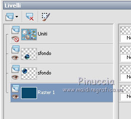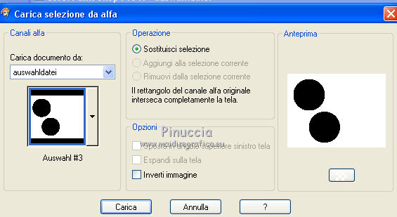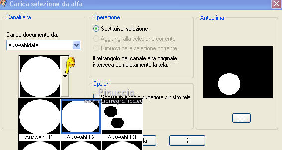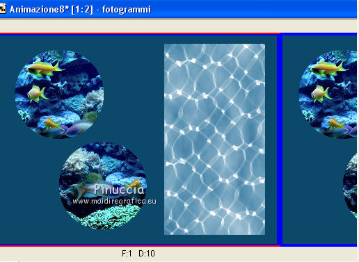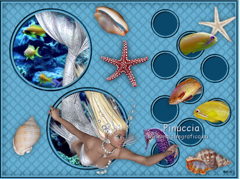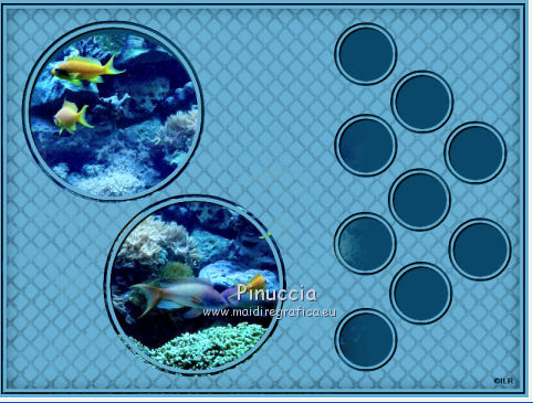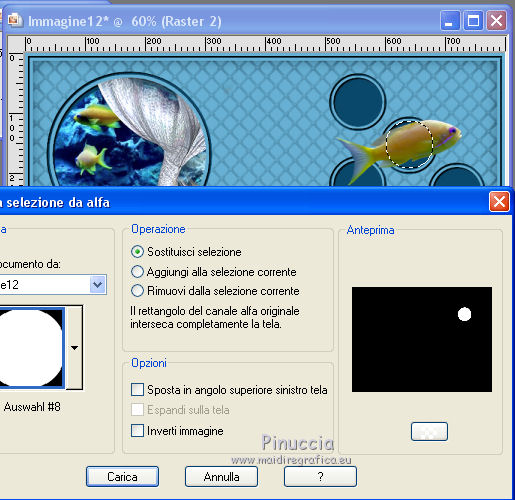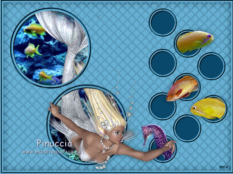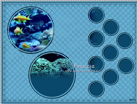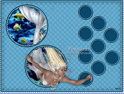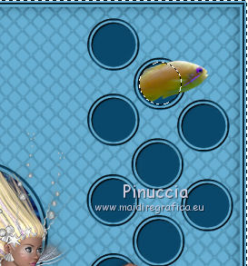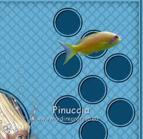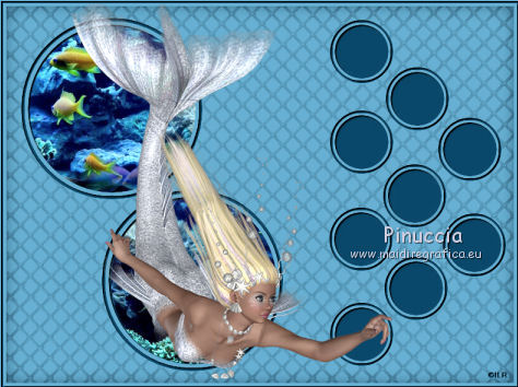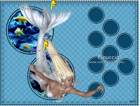 qui puoi trovare qualche risposta ai tuoi dubbi. Se l'argomento che ti interessa non è presente, ti prego di segnalarmelo. Questo tutorial è stato creato con PSP X2, ma può essere eseguito anche con le altre versioni di PSP. Per tradurlo, ho usato PSP X. Se stai usando le nuove versioni di PSP, a proposito delle funzioni Rifletti/Capovolgi, vedi la mia scheda qui Grazie ai creatori dei tubes che mettono a disposizione il loro lavoro in vari gruppi di condivisione. Rispetta il lavoro degli autori, non cambiare il nome del file e non cancellare il watermark. Occorrente: Tubes ed elementi a scelta. Il resto del materiale (maschera e animazione) qui Grazie per il poser Gerda per i tubes dei pesci Bärbel Puoi scaricare gli elementi marini usati nel tutorial qui Filtri: Xero - Improver qui Animation Shop qui Apri la maschera in PSP e minimizzala con il resto del materiale, tranne l'animazione che userai in Animation Shop. 1. Scegli due colori dai tuoi tubes, imposta il colore di primo piano con il colore chiaro, e il colore di sfondo con il colore scuro. I miei colori. ![]() Apri auswahldatei, che sarà la base del tuo lavoro. L'immagine non è vuota, ma contiene le selezioni salvate sul canale alfa. Riempi l'immagine trasparente con il colore di sfondo.Livelli>Nuovo livello raster. Riempi con il colore di primo piano.Livelli>Nuovo livello maschera>Da immagine. Apri il menu sotto la finestra di origine e vedrai la lista dei files aperti. Seleziona la maschera "maske80©ILR", con i seguenti settaggi. ![]() Livelli>Unisci>Unisci gruppo. Livelli>Duplica. Livelli>Unisci>Unisci giù. Effetti>Effetti 3D>Sfalsa ombra. ![]() 2. Attiva il livello di sfondo. Apri il tuo tube di sfondo e vai a Modifica>Copia. Torna al tuo lavoro e vai a Modifica>Incolla come nuovo livello. Immagine>Ridimensiona, se e quanto necessario, tutti i livelli non selezionato. Posiziona il tube,scegliendo quello che vuoi rimanga visibile sul cerchio superiore. ![]() Selezione>Carica/Salva selezione>Carica selezione da canale alfa. La selezione Auswahl#1 è subito disponibile. Devi soltanto cliccare Carica. ![]() Selezione>Inverti. Premi sulla tastiera il tasto CANC ![]() Selezione>Deseleziona. Modifica>Incolla come nuovo livello (il tuo tube dovrebbe essere ancora in memoria). Posiziona il tube sotto il cerchio in basso,lasciando visibile una parte differente. ![]() Selezione>Carica/Salva selezione>Carica selezione da canale alfa. Apri il menu delle selezioni e carica auswahl#2. ![]() Selezione>Inverti. Premi sulla tastiera il tasto CANC. Selezione>Deseleziona. 3. Attiva il livello superiore. Apri il tube della sirena e vai a Modifica>Copia. Torna al tuo lavoro e vai a Modifica>Incolla come nuovo livello. Immagine>Ridimensiona, se e quanto necessario, tutti i livelli non selezionato. Spostalo a sinistra, pressappoco come nell'esempio.![]() Selezione>Carica/Salva selezione>Carica selezione da canale alfa. Apri il menu delle selezioni e carica auswahl#3. ![]() Attiva lo strumento Gomma ![]() e cancella la parte di tube tra i due cerchi e sopra il cerchio superiore. ![]() Dovresti avere questo. ![]() Selezione>Deseleziona. 4. Effetti>Plugins>Xero - Improver. ![]() Effetti>Effetti 3D>Sfalsa ombra. ![]() 5. Adesso puoi aggiungere gli elementi decorativi della tua tag. Puoi inserirli liberamente nello sfondo o nei cerchi a destra. Per selezionare i cerchi puoi usare le selezioni salvate sul canale alfa. Questa è la mappa delle selezioni. ![]() Ecco l'esempio-guida per inserire gli elementi. Apri il tuo pesce e vai a Modifica>Copia. Torna al tuo lavoro e vai a Modifica>Incolla come nuovo livello. Immagine>Ridimensiona, se e quanto necessario, tutti i livelli non selezionato. Posiziona il tube nel cerchio scelto.![]() Controlla nella mappa il numero della selezione alfa relativa al cerchio e carica la selezione (per l'esempio la numero 8). ![]() Selezione>Inverti. Cancella la parte del tube che non deve essere visibile.![]() Selezione>Deseleziona. Effetti>Effetti 3D>Sfalsa ombra, con i settaggi precedenti. Effetti>Plugins>Xero - Improver, con i settaggi precedenti. Procedi allo stesso modo per i cerchi e i tubes scelti. Il mio esempio (il livello del pesce in basso è stato portato sotto il livello della sirena). ![]() Termina di decorare il lavoro con gli elementi che preferisci. Non dimenticare l'Effetto Sfalsa ombra e il filtro Improver. Il mio esempio. ![]() Controlla che tutto sia correttamente posizionato. Quando sei soddisfatto, attiva il livello superiore. Aggiungi il tuo nome e/o il tuo watermark su un nuovo livello, senza dimenticare eventuali copyright delle immagini usate. Chiudi i tre livelli inferiori e attiva il livello della maschera. ![]() Modifica>Copia Unione. Chiudi questo livello, riapri i livelli chiusi e attiva il livello inferiore. ![]() Livelli>Unisci>Unisci visibile. Modifica>Copia. 4. Apri Animation Shop e vai a Modifica>Incolla>Incolla come nuova animazione. Modifica>Duplica e ripeti finchè non avrai 10 fotogrammi. Clicca sul primo fotogramma per selezionarlo e vai a Modifica>Seleziona tutto. Apri l'animazione Wasserani, anche questa composta da 10 fotogrammi. Modifica>Seleziona tutto. Modifica>Copia. Attiva il tuo lavoro e vai a Modifica>Incolla>Incolla nel fotogramma selezionato. Posiziona l'animazione a destra, come nell'esempio. ![]() Torna in PSP, apri e attiva il livello superiore. Modifica>Copia. Torna in Animation Shop e vai a Modifica>Incolla>Incolla come nuova animazione. Modifica>Duplica e ripeti finchè non avrai 10 fotogrammi. Modifica>Seleziona tutto. Modifica>Copia. Attiva il tuo lavoro e vai a Modifica>Incolla>Incolla nel fotogramma selezionato. Posiziona correttamente l'immagine al centro. Controlla il risultato cliccando su Visualizza ![]() Se il risultato non ti soddisfa annulla l'azione cliccando sull'icona corrispondente nella barra degli strumenti ![]() o vai a Modifica>Annulla azione Incolla e ripeti. Quando sei soddisfatto, salva in formato gif. Se vuoi ridurre il peso della tua a