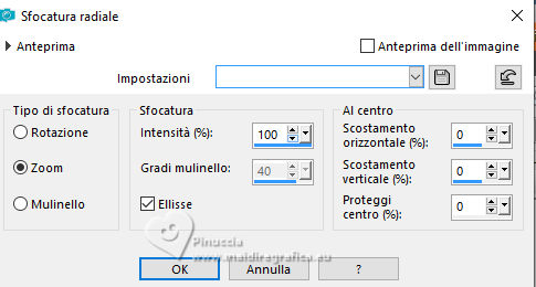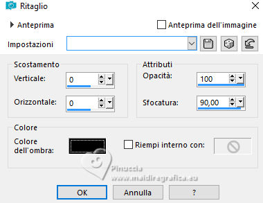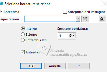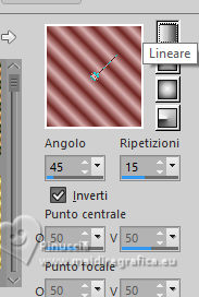 qui puoi trovare qualche risposta ai tuoi dubbi. Se l'argomento che ti interessa non è presente, ti prego di segnalarmelo. Questo tutorial è stato realizzato con PSP2019 e tradotto con PSPX9 e PSP2020, ma può essere realizzato anche con le altre versioni di PSP. Dalla versione X4, il comando Immagine>Rifletti è stato sostituito con Immagine>Capovolgi in orizzontale, e il comando Immagine>Capovolgi con Immagine>Capovolgi in verticale. Nelle versioni X5 e X6, le funzioni sono state migliorate rendendo disponibile il menu Oggetti. Con la nuova versione X7, sono tornati Rifletti>Capovolgi, ma con nuove varianti. Vedi la scheda sull'argomento qui Grazie ai creatori dei tubes che mettono a disposizione il loro lavoro in vari gruppi di condivisione. Rispetta il lavoro degli autori, non cambiare il nome del file e non cancellare il watermark. traduzione francese qui traduzione inglese qui Le vostre versioni qui![]() Occorrente: ![]() Per il materiale tratto dallo scrap Merry Christmas grazie Adrienne. (in questa pagina trovi i links ai siti dei creatori di tubes) ![]() in caso di dubbi, ricorda di consultare la mia sezione filtri qui Alien Skin Eye Candy 5 Impact - Glass qui Mura's Meister - Perspective Tiling qui ![]() non esitare a cambiare modalità di miscelatura e opacità secondo i colori utilizzati. Nelle ultime versioni di PSP non c'é il gradiente di primo piano/sfondo (Corel_06_029) Puoi usare i gradienti delle versioni precedenti. Trovi qui i gradienti Corel X. ![]() Apri la maschera in PSP e minimizzala con il resto del materiale. 1. Scegli dai tuoi tube un colore chiaro e un colore scuro. ![]() Apri una nuova immagine trasparente 1000 x 650 pixels. Riempi l'immagine trasparente con il colore scuro.Livelli>Nuovo livello raster. Selezione>Seleziona tutto. Apri Merry Christmas Paper (2) ![]() Modifica>Copia. Torna al tuo lavoro e vai a Modifica>Incolla nella selezione. Selezione>Deseleziona. Cambia la modalità di miscelatura di questo livello in Luminanza (esistente). Livelli>Unisci>Unisci giù. Effetti>Effetti di immagine>Motivo unico, con i settaggi standard. ![]() 2. Regola>Sfocatura>Sfocatura radiale. ![]() Effetti>Effetti di riflesso>Specchio rotante. ![]() Apri CJ_Silver Frames 291 Blue ![]() Modifica>Copia. Torna al tuo lavoro e vai a Modifica>Incolla come nuovo livello. Colorizza con il tuo colore chiaro con lo strumento Trasforma in destinazione ![]() o Cambia colore ![]() Attiva lo strumento Bacchetta magica e clicca nel cerchio per selezionarlo. ![]() Livelli>Nuovo livello raster. Livelli>Disponi/Sposta giù. 3. Attiva nuovamente l'immagine di sfondo Merry Christmas Paper (2) e vai a Modifica>Copia. Torna al tuo lavoro e vai a Modifica>Incolla nella selezione. Livelli>Nuovo livello raster. Effetti>Effetti 3D>Ritaglio. ![]() Effetti>Plugins>Alien Skin Eye Candy 5 Impact - Glass Glass color: colore bianco ![]() Selezione>Deseleziona. Livelli>Unisci>Unisci giù. Attiva il livello superiore. Effetti>Effetti 3D>Sfalsa ombra. ![]() Livelli>Unisci>Unisci giù. ![]() 4. Attiva il livello Raster 1. Livelli>Duplica. Immagine>Dimensioni tela - 1000 x 750 pixels. ![]() Effetti>Plugins>Mura's Meister - Perspective Tiling. ![]() Effetti>Effetti 3D>Sfalsa ombra. ![]() Attiva nuovamente il livello superiore. Immagine>Ridimensiona, all'85%, tutti i livelli non selezionato. Tasto K per attivare lo strumento Puntatore e imposta Posizione X: 74,00 e Posizione Y: -6,00. ![]() 5. Apri Merry Christmas Element (99) ![]() Modifica>Copia. Torna al tuo lavoro e vai a Modifica>Incolla come nuovo livello. Immagine>Ridimensiona, all'80%, tutti i livelli non selezionato. Regola>Messa a fuoco>Metti a fuoco. Sposta il tube in basso a sinistra.Effetti>Effetti 3D>Sfalsa ombra. ![]() Apri Merry Christmas Element (115) ![]() Modifica>Copia. Torna al tuo lavoro e vai a Modifica>Incolla come nuovo livello. Immagine>Ridimensiona, al 60%, tutti i livelli non selezionato. Regola>Messa a fuoco>Metti a fuoco. Spostalo a sinistra davanti ai pacchetti.![]() Effetti>Effetti 3D>Sfalsa ombra, con i settaggi precedenti. 6. Apri il tube principale Pretty in Pink Tube (1) ![]() Modifica>Copia. Torna al tuo lavoro e vai a Modifica>Incolla come nuovo livello. Per il tube fornito: Immagine>Rifletti. Immagine>Ridimensiona, se necessario, con il tube fornito ho ridimensionato al 65%, tutti i livelli non selezionato. Regola>Messa a fuoco>Metti a fuoco. Sposta il tube a destra.![]() Effetti>Effetti 3D>Sfalsa ombra. ![]() Attiva il livello Raster 1. Livelli>Nuovo livello raster. Riempi il livello con il colore chiaro.Livelli>Nuovo livello maschera>Da immagine. Apri il menu sotto la finestra di origine e vedrai la lista dei files aperti. Seleziona la maschera Narahs_Masks_1727 ![]() Effetti>Effetti di bordo>Aumenta di più. Livelli>Unisci>Unisci gruppo. 7. Selezione>Seleziona tutto. Immagine>Aggiungi bordatura, 2 pixels, simmetriche, colore scuro. Effetti>Effetti 3D>Ritaglio. ![]() Selezione>Seleziona tutto. Immagine>Aggiungi bordatura, 40 pixels, simmetriche, colore chiaro. Selezione>Inverti. Passa il colore di primo piano a Gradiente di primo piano/sfondo, stile Lineare. ![]() Riempi la selezione con il gradiente.8. Effetti>Plugins>AAA Frames - Foto Frame. ![]() Selezione>Inverti. Selezione>Modifica>Seleziona bordature selezione. ![]() Imposta il colore di primo piano con il colore bianco. Livelli>Nuovo livello raster. Riempi il livello con il colore bianco.Selezione>Deseleziona. Firma il tuo lavoro su un nuovo livello. Livelli>Unisci>Unisci tutto e salva in formato jpg. Per i tubes di questo esempio grazie Adrienne ![]() ![]() Se hai problemi o dubbi, o trovi un link non funzionante, o anche soltanto per un saluto, scrivimi. 3 Novembre 2023 |