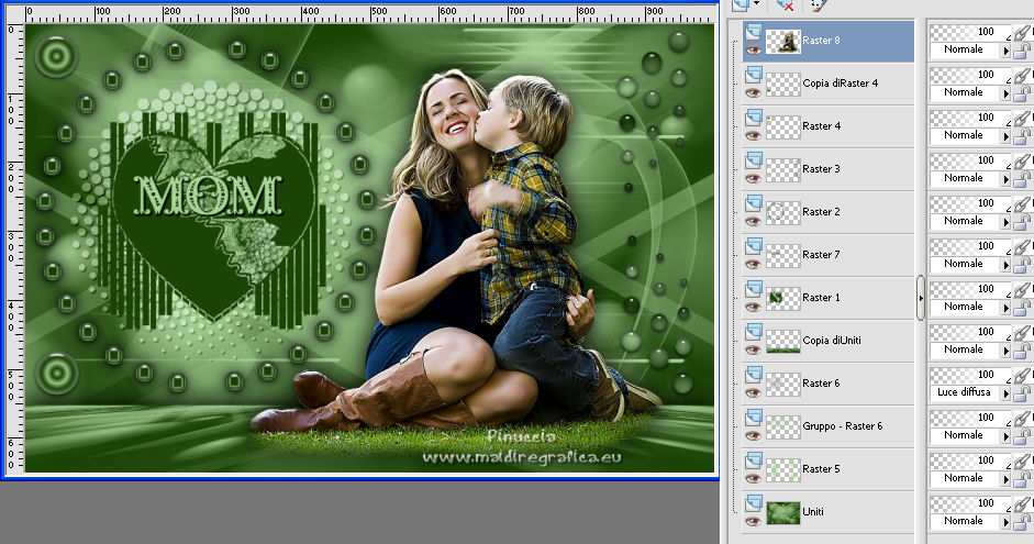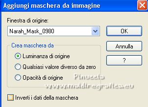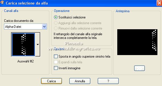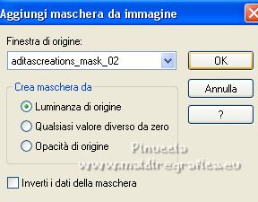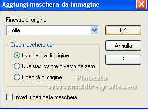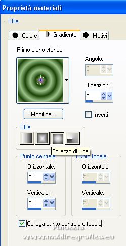 qui puoi trovare qualche risposta ai tuoi dubbi. Se l'argomento che ti interessa non è presente, ti prego di segnalarmelo. Questo tutorial è stato realizzato con Corel2020 e tradotto con PSPX e PSP7, ma può essere realizzato anche con le altre versioni di PSP. Dalla versione X4, il comando Immagine>Rifletti è stato sostituito con Immagine>Capovolgi in orizzontale, e il comando Immagine>Capovolgi con Immagine>Capovolgi in verticale. Nelle versioni X5 e X6, le funzioni sono state migliorate rendendo disponibile il menu Oggetti. Con la nuova versione X7, sono tornati Rifletti>Capovolgi, ma con nuove varianti. Vedi la scheda sull'argomento qui Grazie ai creatori dei tubes che mettono a disposizione il loro lavoro in vari gruppi di condivisione. Rispetta il lavoro degli autori, non cambiare il nome del file e non cancellare il watermark. traduzione francese qui Le vostre versioni qui![]() Occorrente: Un tube a scelta (il tube usato dall'autore è sotto licenza). Il resto del materiale qui Per il tube usato grazie Tocha Per due maschere grazie Narah e Adita (in questa pagina trovi i links ai siti dei creatori di tubes) Filtri: in caso di dubbi, ricorda di consultare la mia sezione filtri qui Mura's Meister - Perspective Tiling qui Alien Skin Eye Candy 5 Impact - Glass qui Xero - Fritillary qui AAA Frames - Foto Frame qui ![]() non esitare a cambiare modalità di miscelatura e opacità secondo i colori utilizzati. Nelle ultime versioni di PSP non c'è il gradiente di primo piano/sfondo (Corel_06_029) Puoi usare i gradienti delle versioni precedenti. Trovi qui i gradienti Corel X. Apri le maschere in PSP e minimizzale con il resto del materiale. 1. Scegli dai tuoi tubes un colore chiaro e un colore scuro. I miei colori ![]() Apri Alpha-Datei e minimizza. Questo renderà disponibili sul tuo lavoro le selezioni salvate sul canale alfa. Apri una nuova immagine trasparente 1000 x 650 pixels, e riempila con il colore scuro.Livelli>Nuovo livello raster. Riempi il livello con il colore chiaro.Livelli>Nuovo livello maschera>Da immagine. Apri il menu sotto la finestra di origine e vedrai la lista dei files aperti. Seleziona la maschera "Bolle". ![]() Effetti>Effetti di bordo>Aumenta. Livelli>Unisci>Unisci gruppo. 2. Livelli>Nuovo livello raster. Riempi il livello con il colore chiaro.Livelli>Nuovo livello maschera>Da immagine. Apri il menu sotto la finestra di origine e seleziona la maschera aditascreations_mask_02. ![]() Effetti>Effetti di bordo>Aumenta. Livelli>Unisci>Unisci gruppo. Livelli>Duplica. Immagine>Rifletti. Livelli>Unisci>Unisci giù. Livelli>Unisci>Unisci visibile. Livelli>Duplica. 3. Effetti>Plugins>Mura's Meister - Perspective Tiling. ![]() Effetti>Effetti 3D>Sfalsa ombra. ![]() Apri una nuova immagine trasparente 350 x 350 pixels, e riempila con il colore scuro.Livelli>Nuovo livello maschera>Da immagine. Apri il menu sotto la finestra di origine e seleziona la maschera APheart4. ![]() Effetti>Effetti di bordo>Aumenta. Livelli>Unisci>Unisci gruppo. 4. Modifica>Copia. Torna al tuo lavoro e vai a Modifica>Incolla come nuovo livello. Tasto K per attivare lo strumento Puntatore ![]() e imposta Posizione x: 98,00 e Posizione Y: 120,00. ![]() Selezione>Carica/Salva selezione>Carica selezione da canale alfa. La selezione Auswahl #1 è subito disponibile. Devi soltanto cliccare Carica. ![]() Livelli>Nuovo livello raster. Riempi la selezione con il colore scuro.Selezione>Modifica>Contrai - 2 pixels. Riempi con il colore chiaro.5. Selezione>Modifica>Contrai - 2 pixels. Riempi con il colore scuro.Selezione>Modifica>Contrai - 2 pixels. Riempi con il colore chiaro.Selezione>Modifica>Contrai - 2 pixels. Riempi con il colore scuro.Selezione>Carica/Salva selezione>Carica selezione da canale alfa. Carica nuovamente la selezione Auswahl #1. ![]() Effetti>Plugins>Alien Skin Eye Candy 5 Impact - Glass Preset Clear con i seguenti settaggi ![]() Selezione>Deseleziona. 6. Livelli>Duplica. Immagine>Rifletti. Tasto K per attivare lo strumento Puntatore ![]() e imposta Posizione x: 283,00 e Posizione Y: 18,00. ![]() Livelli>Unisci>Unisci giù. Effetti>Effetti 3D>Sfalsa ombra. ![]() Selezione>Carica/Salva selezione>Carica selezione da canale alfa. Apri il menu delle selezione e carica la selezione Auswahl #2 ![]() Livelli>Nuovo livello raster. Passa il colore di primo piano a Gradiente di primo piano/Sfondo, stile Sprazzo di luce. ![]() Riempi la selezione con il gradiente.7. Effetti>Plugins>Alien skin Eye Candy 5 Impact - Glass - Clear. Selezione>Deseleziona. Selezione>Carica/Salva selezione>Carica selezione da canale alfa. Apri il menu delle selezione e carica la selezione Auswahl #3 ![]() Livelli>Nuovo livello raster. Riempi la selezione con il gradiente.Effetti>Plugins>Alien skin Eye Candy 5 Impact - Glass - Clear. Selezione>Deseleziona. 8. Livelli>Duplica. Tasto K per attivare lo strumento Puntatore ![]() e imposta Posizione x: 7,00 e Posizione Y: 469,00. ![]() Attiva il livello inferiore. Apri deko1 e vai a Modifica>Copia. Torna al tuo lavoro e vai a Modifica>Incolla come nuovo livello. Livelli>Nuovo livello raster. Passa il colore di primo piano a Colore. Riempi il livello con il colore chiaro.Livelli>Nuovo livello maschera>Da immagine. Apri il menu sotto la finestra di origine e seleziona la maschera Narah_Mask_0980. ![]() Effetti>Effetti di bordo>Aumenta. Livelli>Unisci>Unisci gruppo. 9. Apri il tube kreisel e vai a Modifica>Copia. Torna al tuo lavoro e vai a Modifica>Incolla come nuovo livello. Tasto K per attivare lo strumento Puntatore ![]() e imposta Posizione x: 65,00 e Posizione Y: 81,00. ![]() Effetti>Effetti 3D>Sfalsa ombra. ![]() Cambia la modalità di miscelatura di questo livello in Luce diffusa. 10. Attiva il livello Raster (il livello con il cuore). ![]() Apri il testo Text e vai a Modifica>Copia. Torna al tuo lavoro e vai a Modifica>Incolla come nuovo livello. Tasto K per attivare lo strumento Puntatore ![]() e imposta Posizione x: 156,00 e Posizione Y: 218,00. ![]() Effetti>Effetti 3D>Sf