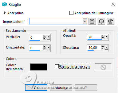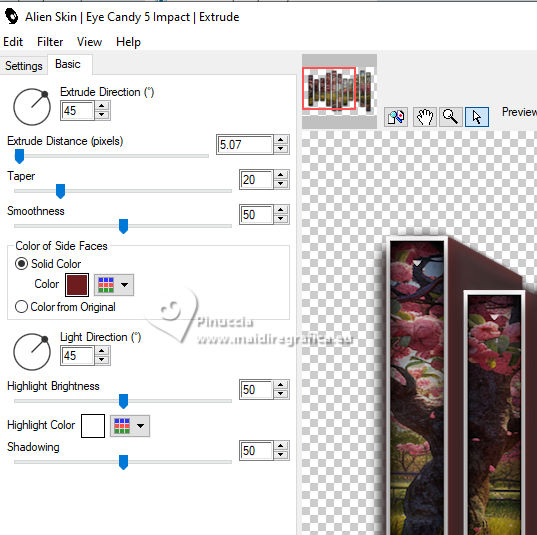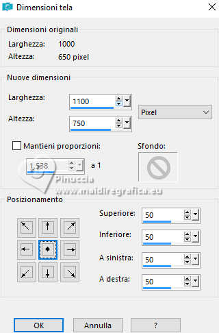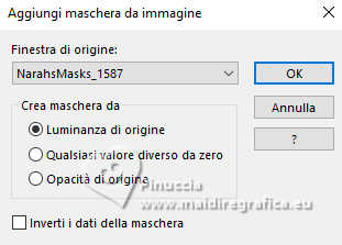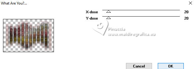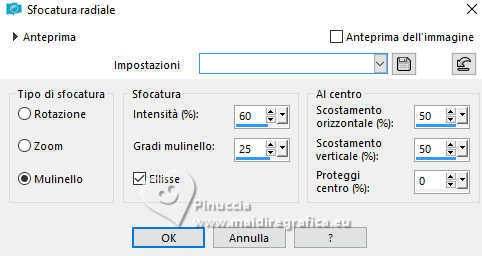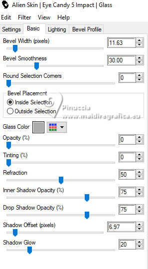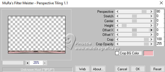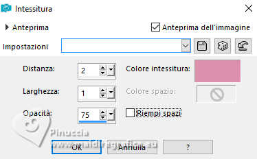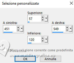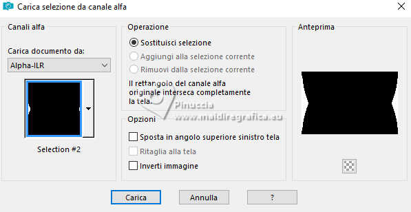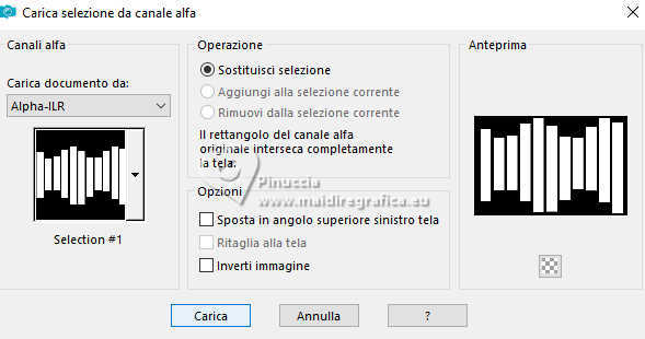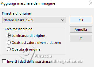 qui puoi trovare qualche risposta ai tuoi dubbi. Se l'argomento che ti interessa non è presente, ti prego di segnalarmelo. Questo tutorial è stato realizzato con PSP2019 e tradotto con PSPX9, PSP 2019 e PSP2020, ma può essere realizzato anche con le altre versioni di PSP. Dalla versione X4, il comando Immagine>Rifletti è stato sostituito con Immagine>Capovolgi in orizzontale, e il comando Immagine>Capovolgi con Immagine>Capovolgi in verticale. Nelle versioni X5 e X6, le funzioni sono state migliorate rendendo disponibile il menu Oggetti. Con la nuova versione X7, sono tornati Rifletti>Capovolgi, ma con nuove varianti. Vedi la scheda sull'argomento qui Grazie ai creatori dei tubes che mettono a disposizione il loro lavoro in vari gruppi di condivisione. Rispetta il lavoro degli autori, non cambiare il nome del file e non cancellare il watermark. traduzione francese qui traduzione inglese qui Le vostre versioni qui![]() Occorrente: Tube a scelta (i tubes usati da Inge-Lore non sono free) Il resto del materiale ![]() Per il tube del mio esempio ho usato un'immagine fornita da Mentali, che ringrazio. (in questa pagina trovi i links ai siti dei creatori di tubes) ![]() in caso di dubbi, ricorda di consultare la mia sezione filtri qui Filters Unlimited 2.0 qui Flaming Pear - Flexify 2 qui Toadies - What are you qui Mura's Meister - Perspective Tiling qui Alien Skin Eye Candy 5 Impact - Glass, Extrude qui I filtri Toadies si possono usare da soli o importati in Filters Unlimited (come fare vedi qui) Se un filtro fornito appare con questa icona ![]() non esitare a cambiare modalità di miscelatura e opacità secondo i colori utilizzati. ![]() Apri le maschere in PSP e minimizzale con il resto del materiale. 1. Scegli dai tuoi tubes un colore chiaro e un colore scuro ![]() Apri AlphaILR Finestra>Duplica o sulla tastiera maiuscola+D per fare una copia. ![]() Chiudi l'originale. La copia, che sarà la base del tuo lavoro, non é vuota, ma contiene le selezioni salvate sul canale alfa. Selezione>Seleziona tutto. Apri l'immagine di sfondo Apple Blossom Paper(9) ![]() Modifica>Copia. Torna al tuo lavoro e vai a Modifica>Incolla nella selezione. Selezione>Deseleziona. Regola>Sfocatura>Sfocatura radiale. ![]() 2. Livelli>Duplica. Immagine>Rifletti>Rifletti orizzontalmente. Immagine>Rifletti>Rifletti verticalmente. Abbassa l'opacità di questo livello al 50%. Livelli>Unisci>Unisci giù. Effetti>Effetti di bordo>Aumenta di più. Selezione>Carica/Salva selezione>Carica selezione da canale alfa. La selezione Selection #1 é subito disponibile. Devi soltanto cliccare Carica. ![]() 3. Imposta il colore di primo piano con il colore bianco #ffffff. Livelli>Nuovo livello raster. Riempi il livello con il colore bianco.Selezione>Modifica>Contrai - 5 pixels. Premi sulla tastiera il tasto CANC ![]() Livelli>Nuovo livello raster. Modifica>Incolla nella selezione (l'immagine di sfondo è sempre in memoria). Livelli>Nuovo livello raster. Effetti>Effetti 3D>Ritaglio. ![]() Effetti>Plugins>Alien Skin Eye Candy 5 Impact – Glass. ![]() Selezione>Deseleziona. Livelli>Unisci>Unisci giù - 2 volte. 4. Immagine>Ridimensiona, al 90%, tutti i livelli non selezionato. Livelli>Duplica. Effetti>Plugins>Toadies - What are you, con i settaggi standard. ![]() Livelli>Disponi>Sposta giù. Effetti>Effetti di bordo>Aumenta. Attiva il livello superiore. Effetti>Plugins>Alien Skin Eye Candy 5 Impact - Extrude. Solid Color: il tuo colore scuro ![]() Effetti>Effetti 3D>Sfalsa ombra, colore nero. ![]() 5. Attiva il livello Raster 1. Livelli>Nuovo livello raster. Riempi il livello con il colore bianco.Livelli>Nuovo livello maschera>Da immagine. Apri il menu sotto la finestra di origine e vedrai la lista dei files aperti. Seleziona la maschera NarahsMasks_1789 ![]() Effetti>Effetti di bordo>Aumenta di più. Livelli>Unisci>Unisci gruppo. Immagine>Rifletti>Rifletti orizzontalmente. 6. Imposta il colore di primo piano con il colore chiaro. Livelli>Nuovo livello raster. Riempi il livello con il colore chiaro.Livelli>Nuovo livello maschera>Da immagine. Apri il menu sotto la finestra di origine e seleziona la maschera NarahsMasks_1587 ![]() Effetti>Effetti di bordo>Aumenta. Livelli>Unisci>Unisci gruppo. Effetti>Effetti di immagine>Motivo unico, con i settaggi standard. ![]() Livelli>Disponi>Sposta giù. 7. Attiva il livello superiore. Modifica>Copia Speciale>Copia Unione. Modifica>Incolla come nuovo livello. nelle versioni più recenti di PSP, con un solo comando: Livelli>Unisci>Unisci visibile a nuovo livello Effetti>Plugins>Mura's Meister>Perspective Tiling. ![]() Effetti>Effetti di riflesso>Specchio rotante. ![]() Livelli>Duplica. Immagine>Rifletti>Rifletti verticalmente (Immagine>Capovolgi). Livelli>Unisci>Unisci giù. Effetti>Effetti 3D>Sfalsa ombra, colore nero. ![]() 8. Livelli>Duplica. Effetti>Plugins>Flaming Pear - Flexify 2. ![]() Attiva lo strumento Selezione ![]() (non importa il tipo di selezione impostato, perché con la selezione personalizzata si ottiene sempre un rettangolo) clicca sull'icona Selezione personalizzata ![]() e imposta i seguenti settaggi. ![]() Premi sulla tastiera il tasto CANC. Selezione>Deseleziona. Tasto K per attivare lo strumento Puntatore ![]() lascia Posizione X: 0,00 e imposta Posizione Y: 149,00. ![]() in modalità Scala ![]() spingi il nodo superiore centrale fino al bordo ![]() Livelli>Duplica. Immagine>Rifletti>Rifletti verticalmente (Immagine>Capovolgi). Livelli>Unisci>Unisci giù. 9. Selezione>Carica/Salva selezione>Carica selezione da canale alfa. Apri il menu delle selezioni e carica la selezione Selection #2 ![]() Livelli>Nuovo livello raster. Livelli>Disponi>Sposta giù. Riempi il livello con il colore scuro.Effetti>Effetti di trama>Intessitura colore intessitura: colore chiaro ![]() Selezione>Modifica>Contrai - 5 pixels. Attiva il livello superiore. Effetti>Effetti 3D>Ritaglio. ![]() Selezione>Deseleziona. 10. Selezione>Carica/Salva selezione>Carica selezione da canale alfa. Apri il menu delle
