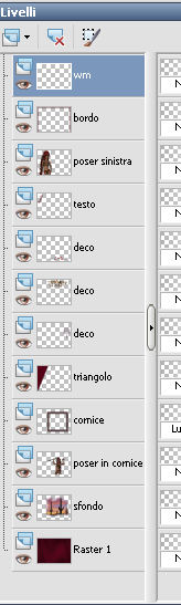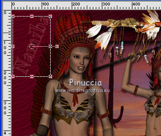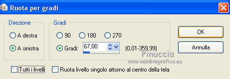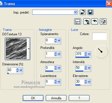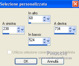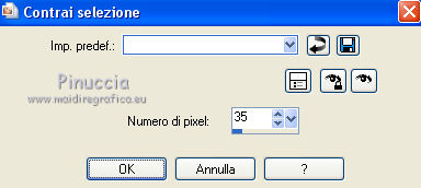 qui puoi trovare qualche risposta ai tuoi dubbi. Se l'argomento che ti interessa non è presente, ti prego di segnalarmelo. Questo tutorial è stato creato con PSP X2, ma può essere eseguito anche con le altre versioni di PSP. Per tradurlo, ho usato PSP X. Se stai usando le nuove versioni di PSP, a proposito delle funzioni Rifletti/Capovolgi, vedi la mia scheda qui Grazie ai creatori dei tubes che mettono a disposizione il loro lavoro in vari gruppi di condivisione. Rispetta il lavoro degli autori, non cambiare il nome del file e non cancellare il watermark. Occorrente: Tubes a scelta: due personaggi, un'immagine di sfondo e tubes accessori. Il resto del materiale qui Per i poser usati usato grazie Marion. Filtri se hai problemi con i filtri consulta la mia sezione filtri qui Filters Unlimited 2.0 qui Xero - Improver qui Graphics Plus - Cross Shadow qui Il filtro Graphics Plus si può usare da solo o importato in Filters Unlimited. (come fare vedi qui) ma possono funzionare anche da soli Se un filtro fornito appare con questa icona Metti la trama "DD Texture 13" nella cartella Trame. Metti il motivo "aweave_11" nella cartella Motivi. 1. Scegli due colori dai tuoi tubes, imposta il colore di primo piano con il colore chiaro, e il colore di sfondo con il colore scuro. I miei colori. ![]() Apri una nuova immagine trasparente 800 x 600 pixels e riempila con il colore di sfondo.Effetti>Effetti di trama>Trama - seleziona la trama DD Texture 13, con i seguenti settaggi. ![]() Effetti>Plugins>Graphics Plus - cross Shadow. ![]() Livelli>Nuovo livello raster. Attiva lo strumento Selezione ,clicca sull'icona Selezione personalizzata ![]() e imposta i seguenti settaggi: ![]() Passa il colore di primo piano a Motivi e seleziona la trama "aweave_11", con i seguenti settaggi. ![]() Riempi la selezione con la trama.Selezione>Modifica>Contrai - 35 pixels. ![]() Premi sulla tastiera il tasto CANC ![]() Selezione>Deseleziona. Effetti>Effetti 3D>Sfalsa ombra. ![]() Ripeti l'Effetto Sfalsa ombra, cambiando verticale e orizzontale con -10. Se vuoi, colorizza la cornice, o cambia la modalità di miscelatura del livello in Luce netta (dipende dai tuoi colori). 2. Apri "Dreieck" e vai a Modifica>Copia. Torna al tuo lavoro e vai a Modifica>Incolla come nuovo livello. Sposta la forma nell'angolo in alto a sinistra.Attiva lo strumento Bacchetta magica ![]() e clicca nel triangolo per selezionarlo. Riempi la selezione con il tuo colore di primo piano.Effetti>Effetti di trama>Trama, con i settaggi precedenti. Selezione>Deseleziona. Effetti>Effetti 3D>Sfalsa ombra. ![]() Apri il tuo tube di sfondo e vai a Modifica>Copia. Torna al tuo lavoro e vai a Modifica>Incolla come nuovo livello. Immagine>Ridimensiona, se e quanto necessario, tutti i livelli non selezionato. Posiziona il tube nella cornice.Nella paletta dei liveli porta questo livello sotto quello della cornice. Abbassa l'opacità al 60% circa (in base al tuo tube). 3. Apri il tube del tuo primo personaggio, e vai a Modifica>Copia. Torna al tuo lavoro e vai a Modifica>Incolla come nuovo livello. Immagine>Ridimensiona, se e quanto necessario, tutti i livelli non selezionato. Posiziona il tube al centro della cornice.Effetti>Plugins>Xero - Improver. ![]() Effetti>Effetti 3D>Sfalsa ombra. ![]() Apri il tuo secondo tube (per la parte sinistra della tag) e vai a Modifica>Copia. Torna al tuo lavoro e vai a Modifica>Incolla come nuovo livello. Immagine>Ridimensiona, se e quanto necessario, tutti i livelli non selezionato. Posiziona a sinistra.Effetti>Plugins>Xero - Improver, con i settaggi precedenti. Effetti>Effetti 3D>Sfalsa ombra, con i settaggi precedenti. Copia e incolla i tuoi tubes accessori. Immagine>Ridimensiona, quanto necessario, tutti i livelli non selezionato. Posiziona i tubes a tuo piacimento.Effetti>Plugins>Xero - Improver, con i settaggi precedenti. Effetti>Effetti 3D>Sfalsa ombra, con i settaggi precedenti. 4. Attiva lo strumento testo ![]() scegli un font e scrivi il tuo testo. Immagine>Ruota per gradi - 67 gradi a sinistra. ![]() Spostalo sul triangolo a sinistra,![]() Livelli>Converti in livello raster. Effetti>Effetti 3D>Sfalsa ombra, con i settaggi precedenti. Porta il livello sotto quello del poser. Attiva il livello superriore. Livelli>Nuovo livello raster. Selezione>Seleziona tutto. Riempi con il colore di primo piano.Selezione>Modifica>Contrai - 3 pixels. Riempi con il colore di sfondo.Selezione>Modifica>Contrai - 2 pixels. Riempi con il colore di primo piano.Selezione>Modifica>Contrai - 3 pixels. Effetti>Effetti 3D>Ritaglio. ![]() Selezione>Deseleziona. Aggiungi il tuo nome e/o il tuo watermark su un nuovo livello, senza dimenticare il copyright delle immagini usate. ![]() Livelli>Unisci>Unisci tutto e salva in formato jpg. ![]() Se hai problemi o dubbi, o trovi un link non funzionante, o anche soltanto per un saluto, scrivimi. 29 Luglio 2013 |