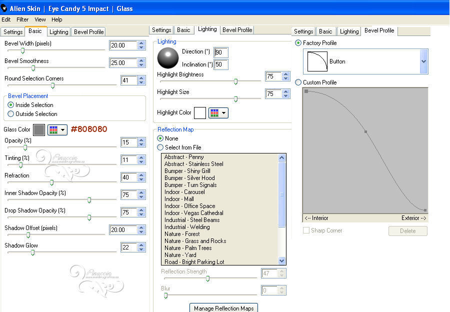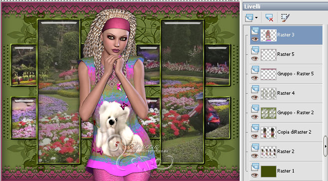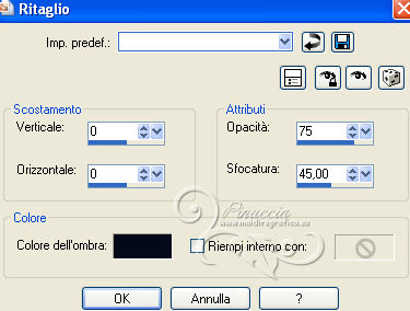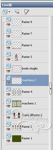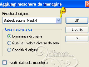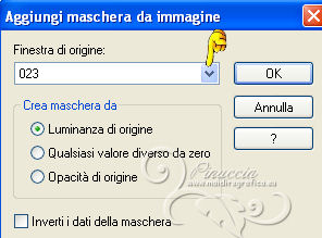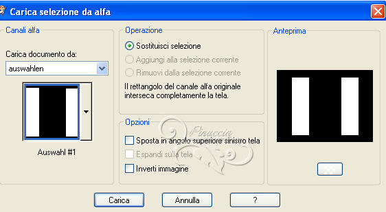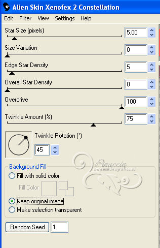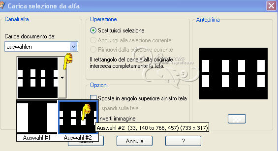 qui puoi trovare qualche risposta ai tuoi dubbi. Se l'argomento che ti interessa non è presente, ti prego di segnalarmelo. Questo tutorial è stato creato con PSP X2, ma può essere eseguito anche con le altre versioni di PSP. Per tradurlo, ho usato PSP X. Grazie ai creatori dei tubes che mettono a disposizione il loro lavoro in vari gruppi di condivisione. Rispetta il lavoro degli autori, non cambiare il nome del file e non cancellare il watermark. Occorrente: A scelta un paesaggio di almeno 800 pixels di larghezza, e il tube di un personaggio. Il resto del materiale qui Per il poser usato grazie Moni S. Per il paesaggio grazie Bärbel Filtri Xero - Improver qui Alien Skin Xenofex 2.0 - Constellation qui Alien Skin Eye Candy 5 Impact - Glass qui Animation Shop qui ![]() Metti il preset Cliccando sul file una o due volte (a seconda delle tue impostazioni), automaticamente il preset si installerà nella cartella corretta. perchè uno o due clic vedi qui Apri le maschere in PSP e minimizzale con il resto del materiale. 1. Scegli due colori dal tuo tube. Imposta il colore di primo piano con il colore chiaro, e il colore di sfondo con il colore scuro. I miei colori. ![]() Apri "auswahlen". Questa immagine, che ha le dimensioni 800 x 600 pixels, sarà la base del tuo lavoro. L'immagine non è vuota, ma contiene le selezioni salvate sul canale alfa. Riempi l' immagine trasparente con il colore scuro.Livelli>Nuovo livello raster. Riempi con il colore chiaro di primo piano.Livelli>Nuovo livello maschera>Da immagine. Apri il menu sotto la finestra di origine e vedrai la lista dei files aperti. Seleziona la maschera "BabesDesignz_Mask4", con i seguenti settaggi: ![]() Livelli>Unisci>Unisci gruppo. Effetti>Effetti di bordo>Aumenta. Effetti>Effetti 3D>Sfalsa ombra. ![]() 2. Apri l'immagine del paesaggio e vai a Modifica>Copia. Torna al tuo lavoro e vai a Modifica>Incolla come nuovo livello. Livelli>Disponi>Sposta giù (sotto il livello della maschera) Livelli>Duplica. Selezione>Carica/Salva selezione>Carica selezione da canale alfa. La selezione Auswahl#1 è subito disponibile. Devi soltanto cliccare Carica. ![]() Selezione>Inverti. Premi sulla tastiera il tasto CANC ![]() Selezione>Inverti. Attiva il livello superiore. Livelli>Nuovo livello raster. Effetti>Plugins>Alien Skin Eye Candy 5 Impact - Glass. Seleziona il preset glas_ILR e ok. ![]() Questi i settaggi, che puoi impostare manualmente, in caso di problemi con il preset. ![]() Livelli>Nuovo livello raster. Selezione>Modifica>Seleziona bordature selezione. ![]() Passa il colore di primo piano a Gradiente, con i seguenti settaggi. ![]() Riempi la selezione con il gradiente.Effetti>Effetti 3D>Smusso a incasso. ![]() Selezione>Deseleziona. Livelli>Unisci>Unisci giù. 3. Attiva il livello dell'immagine. ![]() Selezione>Carica/Salva selezione>Carica selezione da canale alfa. Apri il menu delle selezioni e carica Auswahl#2. ![]() Selezione>Inverti. Premi sulla tastiera il tasto CANC. Selezione>Inverti. Attiva nuovamente il livello della maschera. ![]() Livelli>Nuovo livello raster. Effetti>Plugins>Alien Skin Eye Candy 5 Impact - Glass, con i settaggi precedenti. Livelli>Nuovo livello raster. Selezione>Modifica>Seleziona bordature selezione, con i settaggi precedenti. Riempi con il gradiente.Effetti>Effetti 3D>Smusso a incasso. Selezione>Deseleziona. Attiva il livello superiore. Livelli>Unisci>Unisci giù - 2 volte. 4. Rimani posizionato sul livello superiore. Apri il tuo tube e vai a Modifica>Copia. Torna al tuo lavoro e vai a Modifica>Incolla come nuovo livello. Immagine>Ridimensiona, se e quanto necessario, tutti i livelli non selezionato. Sposta il tube al centro.Effetti>Plugins>Xero - Improver. ![]() Effetti>Effetti 3D>Sfalsa ombra. ![]() Livelli>Nuovo livello raster. Riempi con il gradiente, o con un colore scelto dal tube.Livelli>Nuovo livello maschera>Da immagine. Apri il menu sotto la finestra di origine, e seleziona la maschera 023, con i seguenti settaggi. ![]() Livelli>Unisci>Unisci gruppo. 5. Effetti>Effetti di bordo>Aumenta. Effetti>Effetti 3D>Sfalsa ombra. ![]() Ripeti l'Effetto Sfalsa ombra, cambiando verticale con -5. Livelli>Nuovo livello raster. Riempi con un colore scelto dal tube.Per il mio esempio ho scelto un colore dal tube. Selezione>Seleziona tutto. Selezione>Modifica>Contrai - 3 pixels. ![]() Effetti>Effetti 3D>Ritaglio. ![]() Selezione>Deseleziona. Porta il livello del tube in cima alla paletta dei livelli. ![]() Scrivi il tuo testo e applica un Effetto Sfalsa ombra a tua scelta. Aggiungi il tuo nome e/o il tuo watermark su un nuovo livello, senza dimenticare eventuali copyright delle immagini usate. Questa dovrebbe essere la tua paletta dei livelli. ![]() 6. Attiva il livello della seconda maschera e rinomina questo livello "1". Livelli>Duplica, e rinomina il livello "2". Livelli>Duplica, e rinomina il livello "3". Effetti>Plugins>Alien Skin Xenofex 2.0 - Constellation. ![]() Chiudi il livello e attiva il livello "2". Effetti>Plugins>Alien Skin Xenofex 2.0 - Constellation, clicca su Random Seed e ok. Chiudi questo livello e attiva il livello "1". Effetti>Plugins>Alien Skin Xenofex 2.0 - Constellation, clicca su Random Seed e ok. Lascia il livello visibile. 7. Modifica>Copia Unione. Apri Animation Shop e vai a Modifica>Incolla>Incolla come nuova animazione. Torna in PSP. Chiudi il livello "1" e apri il livello "2". Modifica>Copia Unione. Torna in Animation Shop e vai a Modifica>Incolla>Incolla dopo il fotogramma corrente. Di nuovo in PSP. Chiudi il livello "2" e apri il livello "3". Modifica>Copia Unione. In Animation Shop: Modifica>Incolla>Incolla dopo il fotogramma corrente. Controlla il risultato cliccando su Visualizza e salva in formato jpg.![]() Se hai problemi o dubbi, o trovi un link non funzionante, o anche soltanto per un saluto, scrivimi. 6 Maggio 2013 |