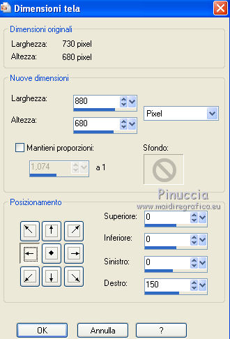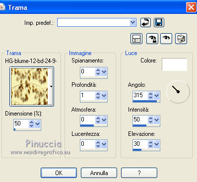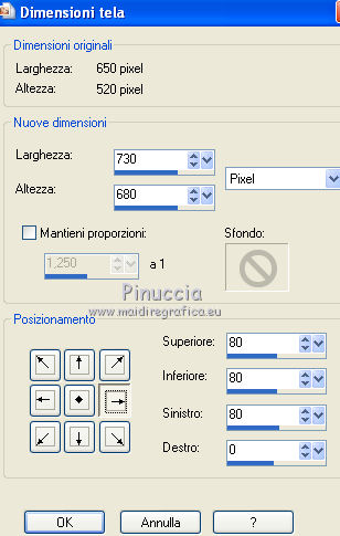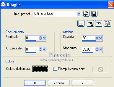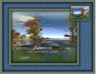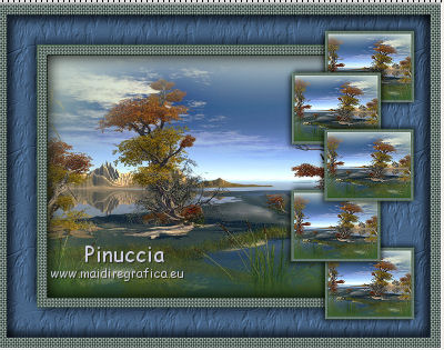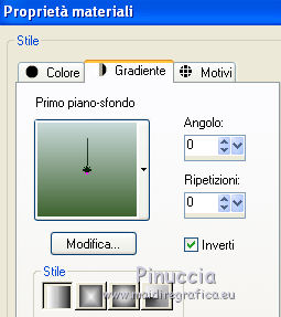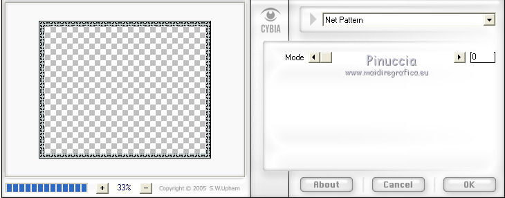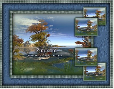 qui puoi trovare qualche risposta ai tuoi dubbi. Se l'argomento che ti interessa non è presente, ti prego di segnalarmelo. Questo tutorial è stato creato con PSP X2, ma può essere eseguito anche con le altre versioni di PSP. Per tradurlo, ho usato PSP X. Il materiale viene da vari gruppi di condivisione. Il copyright appartiene ai rispettivi autori. Grazie ai creatori dei tubes che mettono a disposizione il loro lavoro in vari gruppi di condivisione. Rispetta il lavoro degli autori, non cambiare il nome del file e non cancellare il watermark. Occorrente: Tube a scelta. Il resto del materiale qui Per il poser utilizzato grazie Sissy Filtri: Cybia Screenworks qui ![]() Metti la trama HG-blume-12-bd-24-9-09 nella cartella Trame. 1. Scegli dal tube del paesaggio, un colore chiaro per il colore di primo piano, e un colore scuro per il colore di sfondo. Passa il colore di primo piano a Gradiente, con i seguenti settaggi. ![]() Apri una nuova immagine trasparente 900 x 600 pixels, e riempila con il colore gradiente.Apri il tube di sfondo calguishilgerRolf05012012 e vai a Modifica>Copia. Torna al tuo lavoro e vai a Modifica>Incolla come nuovo livello. Immagine>Aggiungi bordatura - 2 pixels, simmetriche, con il colore di sfondo. Immagine>Aggiungi bordatura, 20 pixels, simmetriche, con il colore di primo piano. Immagine>Aggiungi bordatura, 2 pixels, simmetriche, con il colore di sfondo. Attiva lo strumento Bacchetta magica ![]() e clicca sul bordo chiaro per selezionarlo. Livelli>Nuovo livello raster. Riempi nuovamente con il colore di primo piano.Effetti>Plugins>Cybia - Screenworks - Net Pattern. ![]() Cambia la modalità di miscelatura di questo livello in Moltiplica. Selezione>Deseleziona. Clicca con la bacchetta magica al centro dell'immagine.Effetti>Effetti 3D>Ritaglio. ![]() Selezione>Deseleziona. Livelli>Unisci>Unisci visibile. 2. Immagine>Ridimensiona, a 650 pixels di larghezza, tutti i livelli selezionato. Duplica l'immagine usando la combinazione di tasti maiuscola+D e minimizza questa copia per il momento. Torna al tuo lavoro originale. Immagine>Dimensioni tela - 730 x 680 pixels. ![]() Di nuovo: Immagine>Dimensioni tela - 880 x 680 pixels. ![]() Clicca nel bordo trasparente con la bacchetta magica per selezionarlo.Livelli>Nuovo livello raster. Riempi con il colore di sfondo,o con un terzo colore scelto dall'immagine di sfondo o dal tuo tube. Effetti>Effetti di trama>Trama - seleziona la trama HG-blume-12-bd-24-9-09 con i seguenti settaggi. ![]() Selezione>Inverti. Effetti>Effetti 3D>Sfalsa ombra. ![]() Ripeti l'Effetto Sfalsa ombra, cambiando verticale e orizzontale con -10. 3. Selezione>Seleziona tutto. Selezione>Modifica>Contrai - 20 pixels. ![]() Selezione>Inverti. Riempi con il colore di primo piano.Livelli>Nuovo livello raster. Riempi nuovamente con il colore di primo piano.Effetti>Plugins>Cybia - Screenworks - Net Pattern. ![]() Cambia la modalità di miscelatura di questo livello in Moltiplica. Effetti>Effetti 3D>Sfalsa ombra, con i settaggi precedenti, compresa la ripetizione a -10. Selezione>Deseleziona. Attiva la copia che hai minimizzato al punto precedente. Immagine>Ridimensiona, al 30%, tutti i livelli selezionato. una piccola nota su questo ridimensionamento. A causa del filtro usato per il bordo, un ridimensionamento così alto, porta a un risultato non troppo piacevole, come puoi vedere dall'esempio. ![]() Per evitare questo risultato, ho ridimensionato gradualmente l'immagine: 6 volte all'80% e due volte al 95%. E ho ottenuto questo: ![]() Modifica>Copia. Torna al tuo lavoro e vai a Modifica>Incolla come nuovo livello. Clicca all'esterno dell'immagine con la bacchetta magica ![]() Selezione>Inverti. Effetti>Effetti 3D>Sfalsa ombra. ![]() Ripeti l'Effetto Sfalsa ombra, cambiando verticale e orizzontale con -5. Selezione>Deseleziona. Immagine>Rifletti. Sposta il quadro nell'angolo in alto a destra.![]() Livelli>Duplica. Sposta questo quadro nell'angolo in basso a destra.![]() Livelli>Duplica, 2 volte, e posiziona i due quadri come nell'esempio.![]() Di nuovo Livelli>Duplica, e sposta questo quadro al centro.![]() 4. Apri "Calguisbirdtree22022012" e vai a Modifica>Copia. Torna al tuo lavoro e vai a Modifica>Incolla come nuovo livello. Spostalo nell'angolo in alto a destra.Effetti>Effetti 3D>Sfalsa ombra, con i settaggi precedenti. Attiva il livello del bordo esterno. Livelli>Disponi>Porta in alto. Apri il tuo tube e viai a Modifica>Copia. Torna al tuo lavoro e vai a Modifica>Incolla come nuovo livello. Immagine>Ridimensiona, se e quanto necessario. Effetti>Effetti 3D>Sfalsa ombra. ![]() Posiziona il tube a sinistra, o dove preferisci.Apri il tube calguisbambouzen e vai a Modifica>Copia. Torna al tuo lavoro e vai a Modifica>Incolla come nuovo livello. Immagine>Ridimensiona, al 90%, tutti i livelli non selezionato. Spostalo sul bordo a sinistra.Effetti>Effetti 3D>Sfalsa ombra, con i settaggi precedenti. Aggiungi il tuo nome e/o il tuo watermark su un nuovo livello, senza dimenticare eventuali copyright delle immagini usate. Livelli>Unisci>Unisci tutto. Immagine>Ridimensiona, a 800 pixels di larghezza, tutti i livelli selezionato. Salva in formato jpg. ![]() Se hai problemi o dubbi, o trovi un link non funzionante, o anche soltanto per un saluto, scrivimi 2 Marzo 2012 |