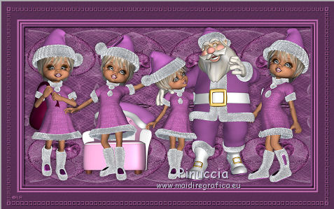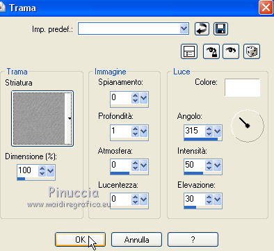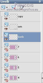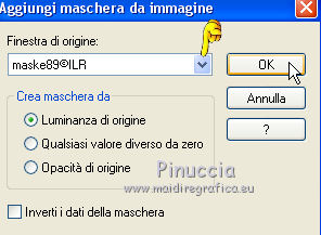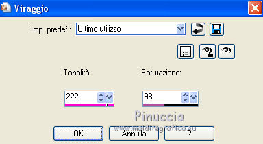 qui puoi trovare qualche risposta ai tuoi dubbi. Se l'argomento che ti interessa non è presente, ti prego di segnalarmelo. Questo tutorial è stato creato con PSP X2, ma può essere eseguito anche con le altre versioni di PSP. Per tradurlo, ho usato PSP X. Se stai usando le nuove versioni di PSP, a proposito delle funzioni Rifletti/Capovolgi, vedi la mia scheda qui Grazie ai creatori dei tubes che mettono a disposizione il loro lavoro in vari gruppi di condivisione. Rispetta il lavoro degli autori, non cambiare il nome del file e non cancellare il watermark. Occorrente: Tubes a scelta. Il resto del materiale qui Per i poser usati grazie Gerda e per il frattale grazie Bärbel Filtri: Xero - Improver qui Animation Shop qui Apri la maschera in PSP e minimizzala con il resto del materiale. 1. Scegli due colori dai tuoi tubes imposta il colore chiaro come colore di primo piano, e il colore scuro come colore di sfondo. Apri "Anirahmen©ILR". Duplica l'immagine usando la combinazione di tasti maiuscola+D e chiudi l'originale. La copia sarà la base del tuo lavoro. Se stai usando altri colori, apri i livelli chiusi e colorizzali con i valori corrispondenti al colore scelto. (Sul Viraggio, vedi qui). Non dimenticare, poi, di richiudere i livelli. Attiva il livello inferiore e riempilo con il colore di sfondo.Effetti>Effetti di trama>Trama - seleziona una trama a tua scelta. Questi i miei settaggi. ![]() 2. Livelli>Nuovo livello raster. Riempi con il colore di primo piano.Livelli>Nuovo livello maschera>Da immagine. Apri il menu sotto la finestra di origine e vedrai la lista dei files aperti. Seleziona la maschera "maske89©ILR", con i seguenti settaggi. ![]() Livelli>Unisci>Unisci gruppo. Effetti>Effetti 3D>Sfalsa ombra. ![]() Attiva il livello Raster 2. Apri "Apophysis-5-bd-28-8-13" e vai a Modifica>Copia. Torna al tuo lavoro e vai a Modifica>Incolla come nuovo livello. Colorizza per adattarlo ai tuoi colori: Regola>Tonalità e saturazione>Viraggio. I miei settaggi. ![]() 3. Apri "m-filter-Apo-97-bd-15-1-12 e vai a Modifica>Copia. Torna al tuo lavoro e vai a Modifica>Incolla come nuovo livello. Colorizza per adattarlo ai tuoi colori. Copia e incolla i tuoi tubes. Immagine>Ridimensiona, se e quanto necessario, tutti i livelli non selezionato. Effetti>Plugins>Xero - Improver. ![]() Effetti>Effetti 3D>Sfalsa ombra. ![]() Posiziona i tubes a tuo piacimento.Per il mio esempio. ![]() 4. Attiva il livello superiore. Livelli>Nuovo livello raster. Selezione>Seleziona tutto. Riempi con il colore di primo piano.Selezione>Modifica>Contrai - 5 pixels. ![]() Premi sulla tastiera il tasto CANC ![]() Selezione>Inverti. Effetti>Effetti 3D>Smusso a incasso. ![]() Selezione>Deseleziona. Aggiungi il tuo nome e/o il tuo watermark su un nuovo livello, senza dimenticare eventuali copyright delle immagini usate. Apri il livello "1". ![]() ![]() 5. Animazione. Modifica>Copia Unione. Apri Animation Shop e vai a Modifica>Incolla>Incolla come nuova animazione. Torna in PSP. Chiudi il livello "1" e apri il livello "2". Modifica>Copia Unione. In Animation Shop Modifica>Incolla>Incolla dopo il fotogramma corrente. In PSP. Chiudi il livello "2" e apri il livello "3". Modifica>Copia Unione. In Animation Shop Modifica>Incolla>Incolla dopo il fotogramma corrente. E così via, fino al livello "7". 6. Ed ecco la tua animazione composta da 7 fotogrammi. Modifica>Seleziona tutto. Animazione>Proprietà fotogramma, e imposta la velocità a 100. Modifica>Copia (stai copiando tutti i fotogrammi selezionati). Clicca sull'ultimo fotogramma per selezionarlo, soltanto questo deve essere selezionato e avere la cornice blu. ![]() Modifica>Incolla>Incolla dopo il fotogramma corrente. Animazione>Inverti fotogrammi. Elimina l'ultimo fotogramma e il fotogramma 8. Controlla il risultato cliccando su Visualizza e salva in formato gif.![]() Se hai problemi o dubbi, o trovi un link non funzionante, o anche soltanto per un saluto, scrivimi. 1 Dicembre 2013 |