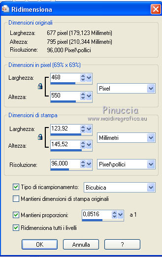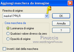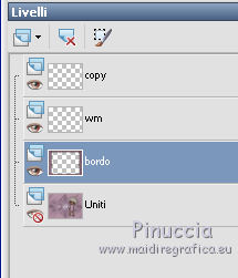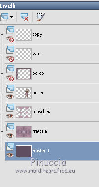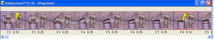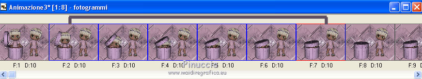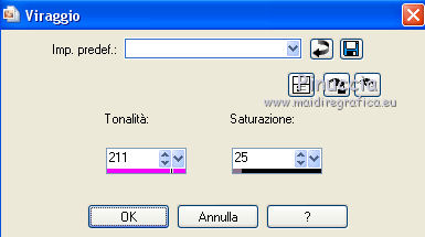 qui puoi trovare qualche risposta ai tuoi dubbi. Se l'argomento che ti interessa non è presente, ti prego di segnalarmelo. Questo tutorial è stato creato con PSP X2, ma può essere eseguito anche con le altre versioni di PSP. Per tradurlo, ho usato PSP X. Se stai usando le nuove versioni di PSP, a proposito delle funzioni Rifletti/Capovolgi, vedi la mia scheda qui Grazie ai creatori dei tubes che mettono a disposizione il loro lavoro in vari gruppi di condivisione. Rispetta il lavoro degli autori, non cambiare il nome del file e non cancellare il watermark. Occorrente: Due tubes a scelta. Il resto del materiale qui Grazie per il poser Lill Per il frattale Bärbel L'animazione è una creazione di Ingelore con i poser di Lill. Filtri: Xero - Improver qui Animation Shop qui Apri la maschera in PSP e minimizzala con il resto del materiale. Preparazione. Scegli due colori dal tuo materiale e imposta il colore di primo piano con il colore chiaro, e il colore di sfondo con il colore scuro. Prendi nota dei valori di Tonalità (H) e Saturazione (S) del tuo colore di sfondo ![]() Quando vorrai colorizzare i tuoi elementi, trascrivi i valori annotati nelle rispettive caselle. Regola>Tonalità e saturazione>Viraggio. ![]() 1. Apri Render©LillAni©ILR. Duplica l'immagine usando la combinazione di tasti maiuscola+D e chiudi l'originale. Elimina il livello superiore. Apri e attiva il livello "1". Apri il tuo primo tube e vai a Modifica>Copia. Torna al tuo lavoro e vai a Modifica>Incolla come nuovo livello. Immagine>Ridimensiona, se e quanto necessario, tutti i livelli non selezionato. Posiziona il tube davanti alla scatola.per esporre questa preparazione, ho utilizzato le schermate di Ingelore ![]() Attiva il livello della scatola. Selezione>Seleziona tutto. Selezione>Mobile (Selezione>Immobilizza non è necessario). Attiva il livello del poser. Attiva lo strumento Gomma ![]() e cancella quello che non deve essere visibile, per dare l'impressione che il tube sia dentro la scatola. ![]() Selezione>Deseleziona. Dovresti avere questo. ![]() 2. Chiudi entrambi i livelli. Apri e attiva il livello "2". Apri il poser successivo e vai a Modifica>Copia. Torna al tuo lavoro e vai a Modifica>Incolla come nuovo livello. Immagine>Ridimensiona, se e quanto necessario, tutti i livelli non selezionato. Posiziona il tube nella scatola,leggermente più in basso del primo. ![]() Attiva nuovamente il livello della scatola. Selezione>Seleziona tutto. Selezione>Mobile (Selezione>Immobilizza non è necessario). Attiva il livello del poser, e cancella la parte del poser che non si dovrà vedere.![]() Selezione>Deseleziona. Dovresti avere questo. ![]() 3. Chiudi i due livelli, apri e attiva il livello "3". Copia e incolla il poser successivo. Ridimensiona, se e quanto necessario, e posiziona il tube nella scatola.Attiva il livello della scatola. Selezione>Seleziona tutto. Selezione>Mobile. Cancella dal livello del poser la parte che non si dovrà vedere. Selezione>Deseleziona. E via di seguito, ripeti il passaggio per i successivi livelli, finchè non avrai un poser in ogni scatola. 4. Quando hai finito: Immagine>Ridimensiona, a 550 pixels di altezza, tutti i livelli selezionato. ![]() Attiva uno alla volta i livelli dei poser e uniscili con il sottostante livello della scatola (Livelli>Unisci>Unisci giù). Su tutti i livelli: Effetti>Plugins>Xero - Improver. ![]() Effetti>Effetti 3D>Sfalsa ombra. ![]() Assicurati che tutti i livelli siano visibili. Salva il lavoro in formato Animation Shop*PSP. ![]() 5. Apri una nuova immagine trasparente 800 x 600 pixels, e riempila con il colore di sfondo.Livelli>Nuovo livello raster. Riempi con il colore di primo piano.Apri "fraktal-151-bd-2-5-13" e vai a Modifica>Copia. Torna al tuo lavoro e vai a Modifica>Incolla come nuovo livello. Regola>Tonalità e saturazione>Viraggio e trascrivi i valori annotati del tuo colore di sfondo. ![]() Unisci>Unisci giù. Livelli>Nuovo livello raster. Riempi con il colore di primo piano.Livelli>Nuovo livello maschera>Da immagine. Apri il menu sotto la finestra di origine e vedrai la lista dei files aperti. Seleziona la maschera "mask17©ILR". ![]() Livelli>Unisci>Unisci gruppo. Effetti>Effetti di bordo>Aumenta. Effetti>Effetti 3D>Sfalsa ombra. ![]() 6. Apri il tuo tube e vai a Modifica>Copia. Torna al tuo lavoro e vai a Modifica>Incolla come nuovo livello. Immagine>Ridimensiona, se e quanto necessario, tutti i livelli non selezionato. Posiziona il tube a destra.Effetti>Plugins>Xero - Improver. ![]() Effetti>Effetti 3D>Sfalsa ombra. ![]() Apri Rahmen©ILR e vai a Modifica>Copia. Torna al tuo lavoro e vai a Modifica>Incolla come nuovo livello. Aggiungi il tuo nome e/o il tuo watermark su un nuovo livello, senza dimenticare eventuali copyright delle immagini usate. Chiudi i tre livelli superiori e attiva il livello inferiore. ![]() Livelli>Unisci>Unisci visibile. Modifica>Copia. 7. Apri Animation Shop e vai a Modifica>Incolla>Incolla come nuova animazione. Modifica>Duplica, e ripeti finchè non avrai 8 fotogrammi. Clicca sul primo fotogramma per selezionarlo e vai a Modifica>Seleziona tutto. Apri l'animazione Render©LillAni©ILR, anche questa composta da 8 fotogrammi. Modifica>Seleziona tutto. Modifica>Copia. Attiva il tuo lavoro e posiziona l'animazione in basso a sinistra. Rimani sul tuo lavoro, che è già tutto selezionato. Modifica>Copia. Clicca sull'ultimo fotogramma per selezionarlo (soltanto questo deve essere selezionato e avere la cornice blu). Modifica>Incolla>Incolla dopo il fotogramma corrente. Animazione>Inverti fotogrammi. Clicca sul fotogramma 9 e premi sulla tastiera il tasto CANC. Clicca sull'ultimo fotogramma e premi sulla tastiera il tasto CANC. Adesso la tua animazione è composta da 14 fotogrammi. Torna in PSP. Chiudi il livello Uniti, visualizza e attiva uno dei livelli superiori. ![]() Modifica>Copia Unione. Torna in Animation Shop e vai a Modifica>Incolla>Incolla come nuova animazione. Modifica>Duplica e ripeti finchè non avrai 14