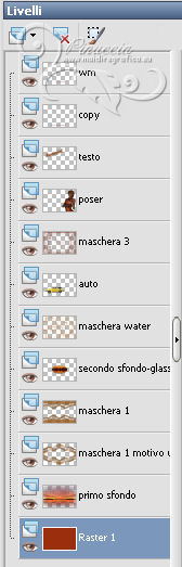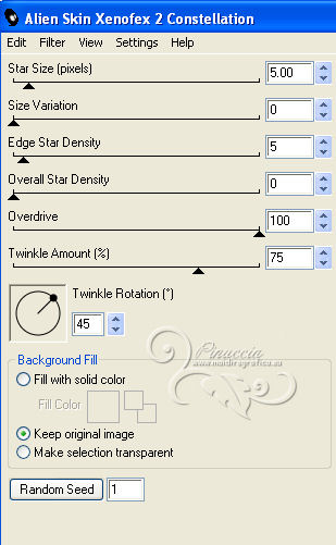qui puoi trovare qualche risposta ai tuoi dubbi. Se l'argomento che ti interessa non è presente, ti prego di segnalarmelo. Questo tutorial è stato creato con PSP X2, ma può essere eseguito anche con le altre versioni di PSP. Per tradurlo, ho usato PSP X. Grazie ai creatori dei tubes che mettono a disposizione il loro lavoro in vari gruppi di condivisione. Rispetta il lavoro degli autori, non cambiare il nome del file e non cancellare il watermark. Occorrente: A scelta due paesaggi e il tube di un personaggio. Il resto del materiale qui Per il poser usato grazie Marion I tubes dei paesaggi sono di Luna e Beatriz. Filtri Xero - Improver qui Alien Skin Xenofex 2.0 - Constellation qui Alien Skin Eye Candy 5 Impact - Glass qui Animation Shop qui ![]() Metti il preset Cliccando sul file una o due volte (a seconda delle tue impostazioni), automaticamente il preset si installerà nella cartella corretta. perchè uno o due clic vedi qui Apri le maschere in PSP e minimizzale con il resto del materiale. 1. Scegli due colori dal tuo tube. Imposta il colore di primo piano con il colore chiaro, e il colore di sfondo con il colore scuro. I miei colori. ![]() Apri una nuova immagine trasparente 900 x 600 pixels, e riempila con il colore di sfondo.Apri il tuo tube di sfondo e vai a Modifica>Copia. Torna al tuo lavoro e vai a Modifica>Incolla come nuovo livello. Sposta il tube a destra o a sinistra, al centro.Livelli>Duplica. Immagine>Rifletti. Posiziona correttamente le due immagini.Quando sei soddisfatto: Livelli>Unisci>Unisci giù. Questo il mio risultato. ![]() Livelli>Nuovo livello raster. Riempi con il colore di primo piano.Livelli>Nuovo livello maschera>Da immagine. Apri il menu sotto la finestra di origine e vedrai la lista dei files aperti. Seleziona la maschera "worisch005", con i seguenti settaggi: ![]() Livelli>Unisci>Unisci gruppo. 2. Effetti>Effetti di bordo>Aumenta. Effetti>Effetti 3D>Sfalsa ombra. ![]() Livelli>Duplica. Effetti>Effetti di immagine>Motivo unico, con i settaggi standard. ![]() Livelli>Disponi>Sposta giù. Attiva il livello superiore. Attiva lo strumento Selezione ellisse.![]() Traccia una selezione al centro ![]() Se vuoi cambiare le dimensioni della selezione, vai a Selezione>Modifica selezione e l'area diventerà rossa ![]() Poi attiva lo strumento Puntatore ![]() deformazione se stai usando PSP 9,e la selezione sarà ingabbiata dalla griglia dello strumento. ![]() Usa i nodi centrali per cambiare la dimensione della tua selezione. Quando sei soddisfatto, vai nuovamente a Selezione>Modifica Selezione e non avrai più il colore rosso, e premi sulla tastiera il tasto A per deselezionare lo strumento Puntatore. 3. Apri il tuo secondo sfondo e vai a Modifica>Copia. Torna al tuo lavoro e vai a Modifica>Incolla come nuovo livello. Posiziona il tube nell'area selezionata.Selezione>Inverti. Premi sulla tastiera il tasto CANC ![]() Di nuovo Selezione>Inverti. Effetti>Plugins>Alien Skin Eye Candy 5 Impact - Glass. Seleziona il preset glas_ILR e ok. ![]() Questi i settaggi che, in caso di problemi con il preset, puoi impostare manualmente. ![]() Selezione>Deseleziona. Livelli>Nuovo livello raster. Riempi con il colore di primo piano.Livelli>Nuovo livello maschera>Da immagine. Apri il menu sotto la finestra di origine, e seleziona l'immagine "WATER". ![]() Livelli>Unisci>Unisci gruppo. Effetti>Effetti di bordo>Aumenta. 4. Apri il tube dell'automobile e vai a Modifica>Copia. Torna al tuo lavoro e vai a Modifica>Incolla come nuovo livello. Immagine>Ridimensiona, quanto necessario, tutti i livelli non selezionato. Sposta l'auto a sinistra, o dove preferisci.Effetti>Effetti 3D>Sfalsa ombra. ![]() Livelli>Nuovo livello raster. Riempi con il colore di sfondo.Livelli>Nuovo livello maschera>Da immagine. Apri il menu sotto la finestra di origine, e seleziona la maschera ©hummel-jutta-mask16.3. ![]() Livelli>Unisci>Unisci gruppo. Effetti>Effetti di bordo>Aumenta. Effetti>Effetti 3D>Sfalsa ombra. ![]() Apri il tuo tube e vai a Modifica>Copia. Torna al tuo lavoro e vai a Modifica>Incolla come nuovo livello. Immagine>Ridimensiona, se e quanto necessario, tutti i livelli non selezionato. Sposta il tube a destra, o dove preferisci.Effetti>Plugins>Xero - Improver. ![]() Scrivi un testo, o usa il file di testo fornito con il materiale. Aggiungi il tuo nome e/o il tuo watermark su un nuovo livello, senza dimenticare eventuali copyright delle immagini usate. Questa dovrebbe essere la tua paletta dei livelli. ![]() 5. Attiva il livello della seconda maschera e rinomina questo livello "1". Livelli>Duplica, e rinomina il livello "2". Livelli>Duplica, e rinomina il livello "3". ![]() Rimani posizionato sul livello "3". Effetti>Plugins>Alien Skin Xenofex 2.0 - Constellation. ![]() Chiudi il livello e attiva il livello "2". Effetti>Plugins>Alien Skin Xenofex 2.0 - Constellation, clicca su Random Seed e ok. Chiudi questo livello e attiva il livello "1". Effetti>Plugins>Alien Skin Xenofex 2.0 - Constellation, clicca su Random Seed e ok. Lascia il livello visibile. 6. Modifica>Copia Unione. Apri Animation Shop e vai a Modifica>Incolla>Incolla come nuova animazione. Torna in PSP. Chiudi il livello "1" e apri il livello "2". Modifica>Copia Unione. Torna in Animation Shop e vai a Modifica>Incolla>Incolla dopo il fotogramma corrente. Di nuovo in PSP. Chiudi il livello "2" e apri il livello "3". Modifica>Copia Unione. In Animation Shop: Modifica>Incolla>Incolla dopo il fotogramma corrente. Controlla il risultato cliccando su Visualizza e salva in formato jpg.![]() Se hai problemi o dubbi, o trovi un link non funzionante, o anche soltanto per un saluto, scrivimi. 6 Maggio 2013 |