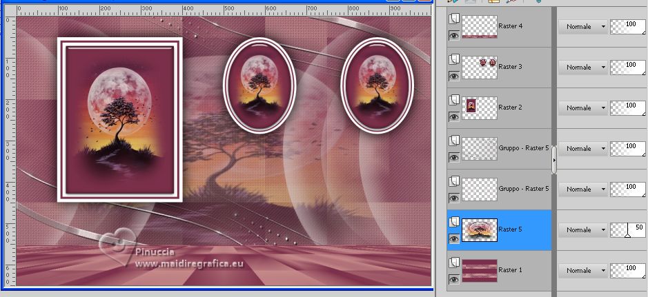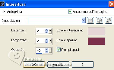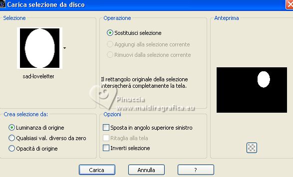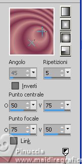 qui puoi trovare qualche risposta ai tuoi dubbi. Se l'argomento che ti interessa non è presente, ti prego di segnalarmelo. Questo tutorial è stato realizzato con PSPX3 e tradotto con PSPX7, ma può essere realizzato anche con le altre versioni di PSP. Dalla versione X4, il comando Immagine>Rifletti è stato sostituito con Immagine>Capovolgi in orizzontale, e il comando Immagine>Capovolgi con Immagine>Capovolgi in verticale. Nelle versioni X5 e X6, le funzioni sono state migliorate rendendo disponibile il menu Oggetti. Con la nuova versione X7, sono tornati Rifletti>Capovolgi, ma con nuove varianti. Vedi la scheda sull'argomento qui Grazie ai creatori dei tubes che mettono a disposizione il loro lavoro in vari gruppi di condivisione. Rispetta il lavoro degli autori, non cambiare il nome del file e non cancellare il watermark. traduzione francese qui traduzione inglese qui Le vostre versioni qui![]() Occorrente: Tubes a scelta (il tube usato dall'autore è sotto licenza). Il resto del materiale qui Grazie: per i tubes Colybrix, YK-Eva Elements e per le maschere Narah. Per il tube del mio esempio grazie AnaRidzi. (in questa pagina trovi i links ai siti dei creatori di tubes) Filtri: in caso di dubbi, ricorda di consultare la mia sezione filtri qui Filters Unlimited 2.0 qui Mehdi - Sorting Tiles qui Alien Skin Eye Candy 5 Impact - Glass qui Mura's Meister - Perspective Tiling qui Mura's Seamless - Emboss at Alpha qui AAA Frames - Foto Frame qui I filtri Mura's Seamless si possono usare da soli o importati in Filters Unlimited (come fare vedi qui) Se un filtro fornito appare con questa icona ![]() non esitare a cambiare modalità di miscelatura e opacità secondo i colori utilizzati. Nelle ultime versioni di PSP non c'é il gradiente di primo piano/sfondo (Corel_06_029) Puoi usare i gradienti delle versioni precedenti. Trovi qui i gradienti Corel X. ![]() Metti la selezione nella cartella Selezioni. Apri le maschere in PSP e minimizzale con il resto del materiale. 1. Scegli tre colori dal tuo materiale; per l'esempio: ![]() Imposta il colore di primo piano con il colore chiaro (3) #c68a8a, e il colore di sfondo con il colore scuro (2) #7c304a . ![]() Passa il colore di primo piano a Gradiente di primo piano/sfondo, stile Sprazzo di luce. ![]() Apri una nuova immagine trasparente 1000 x 650 pixels, e riempila con il gradiente.Effetti>Plugins>Mehdi - Sorting Tiles. ![]() Effetti>Effetti di riflesso>Specchio rotante, con i settaggi standard. ![]() Effetti>Effetti di riflesso>Specchio rotante. ![]() 2. Attiva lo strumento Selezione ![]() (non importa il tipo di selezione impostato, perché con la selezione personalizzata si ottiene sempre un rettangolo) clicca sull'icona Selezione personalizzata ![]() e imposta i seguenti settaggi. ![]() Effetti>Effetti di riflesso>Specchio rotante, con i settaggi standard. ![]() Imposta il colore di primo piano con il colore bianco. ![]() Livelli>Nuovo livello raster. Riempi il livello con il colore bianco.Selezione>Modifica>Contrai - 8 pixels. Riempi con il colore di sfondo (2) #7c304a.Selezione>Modifica>Contrai - 5 pixels. Riempi con il colore bianco.Selezione>Modifica>Contrai - 8 pixels. Riempi con il colore di sfondo (2) #7c304a.3. Livelli>Nuovo livello raster. Apri il misted paysg165-coly ![]() Cancella il watermark e vai a Modifica>Copia. Torna al tuo lavoro e vai a Modifica>Incolla nella selezione. Regola>Messa a fuoco>Metti a fuoco. Livelli>Nuovo livello raster. Effetti>Effetti 3D>Ritaglio, colore di sfondo. ![]() Livelli>Duplica. Livelli>Unisci>Unisci giù. Effetti>Plugins>Alien Skin Eye Candy 5 Impact - Glass seleziona il preset Clear e ok. ![]() Selezione>Deseleziona. Livelli>Unisci>Unisci giù - 2 volte. Effetti>Effetti 3D>Sfalsa ombra. ![]() 4. Selezione>Carica/Salva selezione>Carica selezione da disco. Cerca e carica la selezione sad-loveletter ![]() Livelli>Nuovo livello raster. Riempi il livello con il colore bianco.Selezione>Modifica>Contrai - 5 pixels. Riempi con il colore di sfondo (2) #7c304a.Selezione>Modifica>Contrai - 3 pixels. Riempi con il colore bianco.Selezione>Modifica>Contrai - 5 pixels. Riempi con il colore di sfondo (2) #7c304a.5. Livelli>Nuovo livello raster. Modifica>Incolla nella selezione (il misted del paesaggio è sempre in memoria). Livelli>Nuovo livello raster. Effetti>Effetti 3D>Ritaglio, con i settaggi precedenti. Livelli>Duplica. Livelli>Unisci>Unisci giù. Effetti>Plugins>Alien Skin Eye Candy 5 Impact - Glass - preset Clear. Selezione>Deseleziona. Livelli>Unisci>Unisci giù - 2 volte. 6. Tasto K per attivare lo strumento Puntatore ![]() e imposta posizione x: 498,00 e Posizione Y: 50,00. ![]() Livelli>Duplica Immagine>Rifletti. Imposta Posizione X: 782,00 e mantieni Posizione Y: 50,00. ![]() Livelli>Unisci>Unisci giù. Effetti>Effetti 3D>Sfalsa ombra, con i settaggi precedenti. Attiva il livello Raster 1. Livelli>Duplica. Livelli>Disponi>Porta in alto. Effetti>Plugins>Mura's Meister - Perspective Tiling. ![]() 7. Attiva nuovamente il livello Raster 1. Imposta il colore di primo piano con il colore 1 #e5d5d6. ![]() Livelli>Nuovo livello raster. Riempi il livello con il colore di primo piano (1) #e5d5d6.Livelli>Nuovo livello maschera>Da immagine. Apri il menu sotto la finestra di origine e vedrai la lista dei files aperti. Seleziona la maschera NarahsMasks_1653 ![]() Effetti>Effetti di bordo>Aumenta. Livelli>Unisci>Unisci gruppo. Livelli>Nuovo livello raster. Riempi il livello con il colore di primo piano (1) #e5d5d6.Livelli>Nuovo livello maschera>Da immagine. Apri il menu sotto la finestra di origine e seleziona la maschera NarahsMasks_1743 ![]() Effetti>Effetti di bordo>Aumenta. Livelli>Unisci>Unisci gruppo. Immagine>Rifletti. Effetti>Plugins>Mura's Seamless - Emboss at Alpha, con i settaggi standard. ![]() Effetti>Effetti 3D>Sfalsa ombra. ![]() 9. Attiva ancora il livello Raster 1. Effetti>Effetti di trama>Intessitura. colore intessitura: colore di primo piano (colore 1 #e5d5d6) colore spazio: colore di sfondo (color