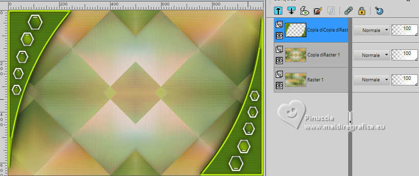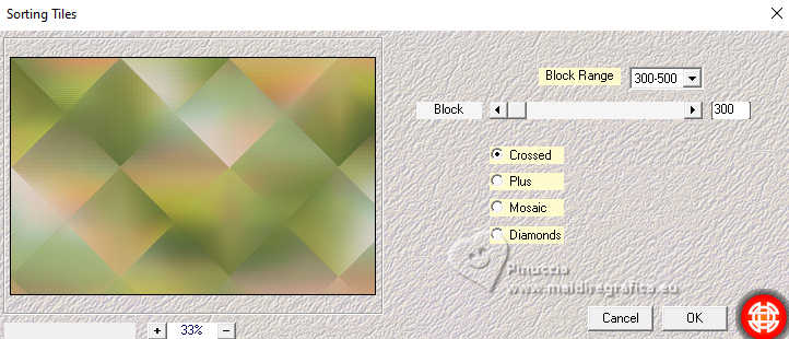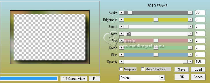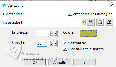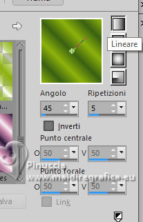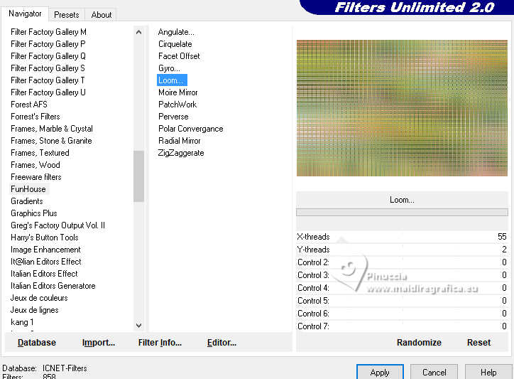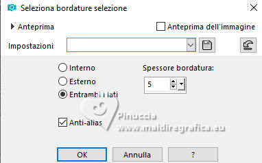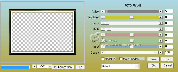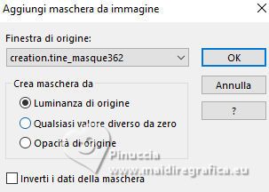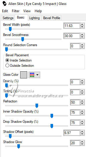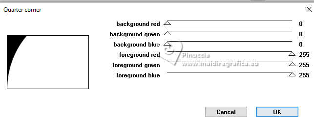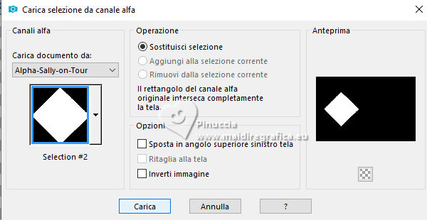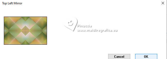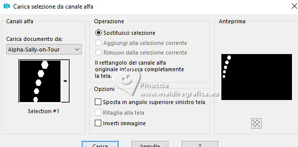 qui puoi trovare qualche risposta ai tuoi dubbi. Se l'argomento che ti interessa non è presente, ti prego di segnalarmelo. Questo tutorial è stato realizzato con PSP2019 e tradotto con PSPX9, PSP 2019 e PSP2020, ma può essere realizzato anche con le altre versioni di PSP. Dalla versione X4, il comando Immagine>Rifletti è stato sostituito con Immagine>Capovolgi in orizzontale, e il comando Immagine>Capovolgi con Immagine>Capovolgi in verticale. Nelle versioni X5 e X6, le funzioni sono state migliorate rendendo disponibile il menu Oggetti. Con la nuova versione X7, sono tornati Rifletti>Capovolgi, ma con nuove varianti. Vedi la scheda sull'argomento qui Grazie ai creatori dei tubes che mettono a disposizione il loro lavoro in vari gruppi di condivisione. Rispetta il lavoro degli autori, non cambiare il nome del file e non cancellare il watermark. traduzione francese qui traduzione inglese qui Le vostre versioni qui![]() Occorrente: Tube a scelta (i tubes usati da Inge-Lore non sono free) Il resto del materiale ![]() Per il tube del mio esempio grazie Tatty's Thingies. (in questa pagina trovi i links ai siti dei creatori di tubes) ![]() in caso di dubbi, ricorda di consultare la mia sezione filtri qui Filters Unlimited 2.0 qui Funhouse - Loom qui Mehdi - Sorting Tiles qui Simple - Top Left Mirror qui Simple - Quarter Corner (bonus) qui Mura's Meister - Perspective Tiling qui Alien Skin Eye Candy 5 Impact - Glass qui AAA Frames - Foto Frame qui I filtri Funhouse e Simple si possono usare da soli o importati in Filters Unlimited (come fare vedi qui) Se un filtro fornito appare con questa icona ![]() non esitare a cambiare modalità di miscelatura e opacità secondo i colori utilizzati. Nelle ultime versioni di PSP non c'é il gradiente di primo piano/sfondo (Corel_06_029) Puoi usare i gradienti delle versioni precedenti. Trovi qui i gradienti Corel X. ![]() Apri le maschere in PSP e minimizzale con il resto del materiale. 1. Scegli dai tuoi tubes un colore chiaro e un colore scuro ![]() Apri Alpha-Sally-on-Tour Finestra>Duplica o sulla tastiera maiuscola+D per fare una copia. ![]() Chiudi l'originale. La copia, che sarà la base del tuo lavoro, non é vuota, ma contiene le selezioni salvate sul canale alfa. Selezione>Seleziona tutto. Apri l'immagine di sfondo background 1 ![]() Modifica>Copia. Torna al tuo lavoro e vai a Modifica>Incolla nella selezione. Selezione>Deseleziona. Effetti>Effetti di immagine>Motivo unico, con i settaggi standard. ![]() Regola>Sfocatura>Sfocatura gaussiana - raggio 30. ![]() 2. Effetti>Plugins>Filters Unlimited 2.0 - Funhouse - Loom. ![]() Livelli>Duplica. Effetti>Plugins>Mehdi - Sorting Tiles. ![]() Effetti>Effetti di riflesso>Specchio rotante, con i settaggi standard. ![]() Effetti>Plugins>Simple - Top Left Mirror. ![]() Livelli>Duplica. Effetti>Plugins>Simple - Quarter Corner. ![]() 3. Attiva lo strumento Bacchetta magica ![]() e clicca nella parte bianca per selezionarla. Premi sulla tastiera il tasto CANC ![]() Selezione>Inverti. Riempi con il colore scuro.Effetti>Effetti di trama>Veneziana - colore chiaro. ![]() Selezione>Modifica>Seleziona bordature selezione. ![]() Livelli>Nuovo livello raster. Riempi con il colore chiaro.Effetti>Effetti 3D>Smusso a incasso. ![]() Selezione>Deseleziona. 4. Livelli>Unisci>Unisci giù. Tasto K per attivare lo strumento Puntatore ![]() Imposta Posizione X e Y 0,00 ![]() Livelli>Duplica. Immagine>Rifletti>Rifletti orizzontalmente. Immagine>Rifletti>Rifletti verticalmente. Livelli>Unisci>Unisci giù. Effetti>Effetti 3D>Sfalsa ombra, colore nero. ![]() Selezione>Carica/Salva selezione>Carica selezione da canale alfa. La selezione Selection #1 é subito disponibile. Devi soltanto cliccare Carica. ![]() 5. Livelli>Nuovo livello raster. Imposta il colore di primo piano con il colore bianco. Riempi il livello con il colore bianco.Selezione>Modifica>Contrai - 5 pixels. Imposta nuovamente il colore di primo piano con il colore iniziale, e passa il colore di primo piano a Gradiente di primo piano/sfondo, stile Lineare. ![]() ![]() Riempi la selezione con il gradiente.Effetti>Plugins>Alien Skin Eye Candy 5 Impact - Glass. ![]() Selezione>Deseleziona. Effetti>Effetti 3D>Sfalsa ombra, colore nero. ![]() Livelli>Duplica. Immagine>Rifletti>Rifletti orizzontalmente. Immagine>Rifletti>Rifletti verticalmente. Livelli>Unisci>Unisci giù - 2 volte. ![]() 6. Selezione>Carica/Salva selezione>Carica selezione da canale alfa. Apri il menu delle selezioni e carica la selezione Selection #2 ![]() Imposta nuovamente il colore di primo piano con il colore bianco. Livelli>Nuovo livello raster. Riempi il livello con il colore bianco.Selezione>Modifica>Contrai - 5 pixels. Riempi con il colore scuro.Selezione>Modifica>Contrai - 5 pixels. Riempi il livello con il colore bianco.Selezione>Modifica>Contrai - 5 pixels. L'immagine di sfondo è ancora in memoria: Modifica>Incolla nella selezione. 7. Livelli>Nuovo livello raster. Effetti>Effetti 3D>Ritaglio. ![]() Selezione>Deseleziona. Livelli>Unisci>Unisci giù. Livelli>Duplica. Immagine>Rifletti>Rifletti orizzontalmente. Livelli>Duplica. Tasto K per attivare lo strumento Puntatore ![]() Imposta Posizione X: 323,00 e Posizione Y: 5,00. ![]() Livelli>Unisci>Unisci giù - 2 volte. Effetti>Effetti 3D>Sfalsa ombra, colore nero. ![]() Attiva il livello Copia di Raster 1. Livelli>Nuovo livello raster. Riempi il livello con il colore bianco.8. Livelli>Nuovo livello maschera>Da immagine. Apri il menu sotto la finestra di origine e seleziona la maschera creation.tine_masque362 ![]() Effetti>Effetti di bordo>Aumenta. Livelli>Unisci>Unisci gruppo. Effetti>Effetti 3D>Sfalsa ombra, colore nero. ![]() Livelli>Nuovo livello raster. Riempi il livello con il colore bianco.Livelli>Nuovo livello maschera>Da immagine. Apri il menu sotto la finestra di origine e seleziona la maschera NarahsMasks_1730 ![]() Effetti>Effetti di bordo>Aumenta. Livelli>Unisci>Unisci gruppo. 9. Tasto K per attivare lo strumento Puntatore ![]() Imposta 