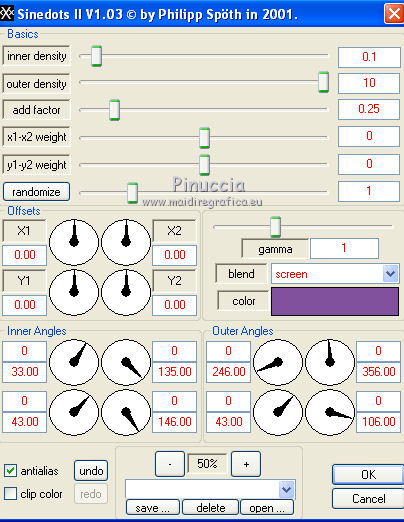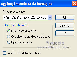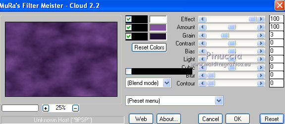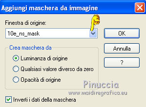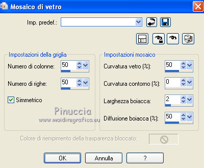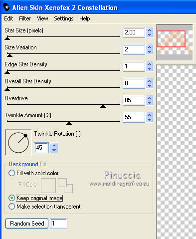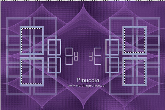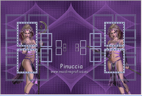 qui puoi trovare qualche risposta ai tuoi dubbi. Se l'argomento che ti interessa non è presente, ti prego di segnalarmelo. Questo tutorial è stato creato con PSP X2, ma può essere eseguito anche con le altre versioni di PSP. Per tradurlo, ho usato PSP X. Il materiale viene da vari gruppi di condivisione. Il copyright appartiene ai rispettivi autori. Grazie ai creatori dei tubes che mettono a disposizione il loro lavoro in vari gruppi di condivisione. Rispetta il lavoro degli autori, non cambiare il nome del file e non cancellare il watermark. Occorrente: Tubes a scelta. Il resto del materiale qui Per i poser utilizzati grazie Batschi Filtri: Dragonfly - SinedotsII qui Mura's Meister - Cloud qui Alien Skin Xenofex 2.0 - Constellation qui Animation Shop qui Apri le maschere in PSP e minimizzale con il resto del materiale. 1. Scegli dai tuoi tubes tre colori, un colore chiaro, un colore scuro e un colore medio. Per impostare i tuoi colori, apri una piccola immagine trasparente 200 x 200 pixels, crea tre livelli e riempi ogni livello con i tuoi colori. Questa, per esempio, è la mia paletta dei livelli. ![]() Imposta il colore di primo piano con il colore medio, e il colore di sfondo con il colore scuro. Apri una nuova immagine trasparente 900 x 600 pixels. Effetti>Plugins>Mura's Meister - Cloud. ![]() Effetti>Effetti di trama>Mosaico di vetro. ![]() 2. Livelli>Nuovo livello raster. Riempi con il colore medio.Livelli>Nuovo livello maschera>Da immagine. Apri il menu sotto la finestra di origine e vedrai la lista dei files aperti. Seleziona la maschera 10e_ns_mask, con i seguenti settaggi. ![]() Livelli>Unisci>Unisci gruppo. Effetti>Effetti di bordo>Aumenta. Effetti>Effetti 3D>Sfalsa ombra. ![]() Livelli>Nuovo livello raster. Riempi con il tuo colore di primo piano.Livelli>Nuovo livello maschera>Da immagine. Apri il menu sotto la finestra di origine e vedrai la lista dei files aperti. Seleziona la maschera @nn_230610_mask022, con i seguenti settaggi. ![]() Livelli>Unisci>Unisci gruppo. Effetti>Effetti di bordo>Aumenta. Effetti>Effetti 3D>Sfalsa ombra, con i settaggi precedenti. Attiva lo strumento Selezione , rettangolo,![]() e traccia una selezione sui rettangoli laterali. ![]() Premi sulla tastiera il tasto CANC. Selezione>Modifica>Espandi - 5 pixels. ![]() 3. Apri il tuo primo tube e vai a Modifica>Copia. Torna al tuo lavoro e vai a Modifica>Incolla come nuovo livello. Immagine>Ridimensiona, se e quanto necessario, tutti i livelli non selezionato, e posiziona il tube sulla selezione a destra.Apri il tuo secondo tube e vai a Modifica>Copia. Torna al tuo lavoro e vai a Modifica>Incolla come nuovo livello. Immagine>Ridimensiona, se e quanto necessario, tutti i livelli non selezionato, e posiziona il tube sulla selezione a sinistra.![]() Selezione>Inverti. Premi sulla tastiera il tasto CANC. Attiva il livello sottostante del primo tube, e premi nuovamente il tasto CANC. Selezione>Deseleziona. Nella paletta dei livelli porta questi due livelli sotto il livello della maschera. Su entrambi i livelli dei tubes: Effetti>Effetti 3D>Sfalsa ombra. ![]() Su entrambi i livelli: Regola>Messa a fuoco>Metti a fuoco. 4. Attiva il livello inferiore. Livelli>Nuovo livello raster. Effetti>Plugins>Dragonfly - Sinedots II - con il tuo colore medio. ![]() Livelli>Duplica. Immagine>Rifletti. Livelli>Unisci>Unisci giù, e rinomina questo livello "animazione". Attiva il livello superiore. Apri il tuo tube principale e vai a Modifica>Copia. Torna al tuo lavoro e vai a Modifica>Incolla come nuovo livello. Immagine>Ridimensiona, se e quanto necessario, tutti i livelli non selezionato. Sposta il tube al centro.Regola>Messa a fuoco>Metti a fuoco. Effetti>Effetti 3D>Sfalsa ombra, con i settaggi precedenti. ![]() 5. Livelli>Nuovo livello raster. Selezione>Seleziona tutto. Riempi con il colore di primo piano.Selezione>Modifica>Contrai - 3 pixels. Riempi con il colore medio.Selezione>Modifica>Contrai - 3 pixels. Riempi con il colore di sfondo.Selezione>Modifica>Contrai - 10 pixels. Riempi con il colore medio.Selezione>Modifica>Contrai - 3 pixels. Riempi con il colore di primo piano.Selezione>Modifica>Contrai - 3 pixels. Effetti>Effetti 3D>Ritaglio. ![]() Selezione>Deseleziona. Scrivi, se vuoi, un testo sull'immagine. Aggiungi il tuo nome e/o il tuo watermark, senza dimenticare eventuali copyright delle immagini usate. Controlla che tutto sia al posto giusto e, quando sei soddisfatto, attiva il livello "animazione". Effetti>Plugins>Alien Skin Xenofex 2.0 - Constellation. ![]() Modifica>Copia Unione. Apri Animation Shop e vai a Modifica>Incolla>Incolla come nuova animazione. Torna in PSP. Modifica>Annulla azione Constellation. Effetti>Plugins>Alien Skin Xenofex 2.0 - Constellation, clicca una volta su Random Seed e ok. Modifica>Copia Unione. Torna in Animation Shop e vai a Modifica>Incolla>Incolla dopo il fotogramma corrente. Di nuovo in PSP. Modifica>Annulla azione Constellation. Effetti>Plugins>Alien Skin Xenofex 2.0 - Constellation, clicca una volta su Random Seed e ok. Modifica>Copia Unione. In Animation Shop: Modifica>Incolla>Incolla dopo il fotogramma corrente. Modifica>Seleziona tutto. Animazione>Proprietà fotogramma, e imposta la velocità a 15. ![]() Controlla il risultato cliccando su Visualizza e salva in formato gif.Per questo esempio ho usato poser di Kreahexe. ![]() ![]() Se hai problemi o dubbi, o trovi un link non funzionante, o anche soltanto per un saluto, scrivimi 27 Gennaio 2012 |