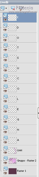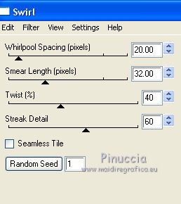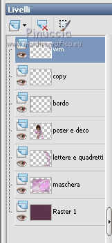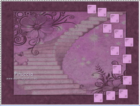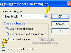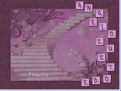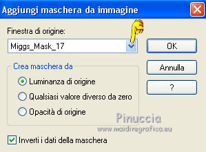 qui puoi trovare qualche risposta ai tuoi dubbi. Se l'argomento che ti interessa non è presente, ti prego di segnalarmelo. Questo tutorial è stato creato con PSP X2, ma può essere eseguito anche con le altre versioni di PSP. Per tradurlo, ho usato PSP X. Se stai usando le nuove versioni di PSP, a proposito delle funzioni Rifletti/Capovolgi, vedi la mia scheda qui Grazie ai creatori dei tubes che mettono a disposizione il loro lavoro in vari gruppi di condivisione. Rispetta il lavoro degli autori, non cambiare il nome del file e non cancellare il watermark. Occorrente: A scelta un'immagine di sfondo e il tube di un personaggio. Per l'esempio ho usato la collezione schutzengel-2013 che trovi qui: ![]() Il resto del materiale (una maschera) qui Filtri se hai problemi con i filtri, consulta la mia sezione filtri qui Eye Candy 4000 - Swirl qui Xero - Improver qui Apri la maschera in PSP e minimizzala con il resto del materiale. 1. Scegli due colori dai tuoi tubes, imposta il colore di primo piano con il colore chiaro, e il colore di sfondo con il colore scuro. Apri una nuova immagine trasparente 800 x 600 pixels, e riempila con il colore di sfondo.Effetti>Plugins>Eye Candy 4000 - Swirl. ![]() Livelli>Nuovo livello raster. Selezione>Seleziona tutto. Apri l'immagine di sfondo e vai a Modifica>Copia. Torna al tuo lavoro e vai a Modifica>Incolla nella selezione. Selezione>Deseleziona. Abbassa l'opacità di questo livello al 50%. 2. Livelli>Nuovo livello maschera>Da immagine. Apri il menu sotto la finestra di origine e vedrai la lista dei files aperti. Seleziona la maschera "Miggs_Mask_17", con i seguenti settaggi. ![]() Livelli>Unisci>Unisci gruppo. Attiva lo strumento Selezione , rettangolo,e traccia una selezione intorno al riquadro centrale. ![]() Selezione>Inverti. Premi sulla tastiera il tasto CANC ![]() Selezione>Deseleziona. Effetti>Effetti 3D>Sfalsa ombra. ![]() Ripeti l'Effetto Sfalsa ombra, cambiando verticale e orizzontale con -5. Apri una nuova immagine trasparente 50 x 50 pixels, e riempila con il colore di primo piano.Livelli>Nuovo livello raster. Riempi con il colore di sfondo.Livelli>Nuovo livello maschera>Da immagine. Apri il menu sotto la finestra di origine, e seleziona nuovamente la maschera "Miggs_Mask_17", questa volta inverti i dati della maschera non selezionato. ![]() Livelli>Unisci>Unisci gruppo. Immagine>Aggiungi bordatura, 2 pixels, simmetriche, con il colore di sfondo. ![]() 3. Modifica>Copia. Torna al tuo lavoro e vai a Modifica>Incolla come nuovo livello. Effetti>Effetti 3D>Sfalsa ombra, con i settaggi precedenti, compresa la ripetizione a -5. Decidi il testo che intendi scrivere, e duplica il livello per quante lettere è composto il tuo testo. Posiziona i quadretti a tuo piacimento.Per il mio esempio. ![]() Quando sei sicuro della posizione dei quadretti, chiudi i due livelli inferiore, e vai a Livelli>Unisci>Unisci visibile. Livelli>Visualizza>Tutto. Attiva lo strumento Testo , scegli un font,e scrivi il tuo testo, ogni lettera su un nuovo livello. Su tutti i livelli del testo: Effetti>Effetti 3D>Sfalsa ombra. ![]() Posiziona le lettere sui quadretti.![]() ![]() Chiudi ancora i due livelli inferiori. Livelli>Unisci>Unisci visibile. Livelli>Visualizza>Tutto. 4. Apri il tuo tube e vai a Modifica>Copia. Torna al tuo lavoro e vai a Modifica>Incolla come nuovo livello. Immagine>Ridimensiona, se e quanto necessario, tutti i livelli non selezionato. Posiziona il tube dove preferisci,o vedi il mio esempio. Effetti>Plugins>Xero - Improver. ![]() Effetti>Effetti 3D>Sfalsa ombra. ![]() Apri il tube accessorio e vai a Modifica>Copia. Torna al tuo lavoro e vai a Modifica>Incolla come nuovo livello. Immagine>Ridimensiona, se e quanto necessario, tutti i livelli non selezionato. Posiziona il tube dove preferisci,o vedi il mio esempio. Effetti>Plugins>Xero - Improver, con i settaggi precedenti. Effetti>Effetti 3D>Sfalsa ombra, con i settaggi precedenti. Livelli>Nuovo livello raster. Selezione>Seleziona tutto. Riempi con il colore di primo piano.Selezione>Modifica>Contrai - 3 pixels. ![]() Riempi con il colore di sfondo.Selezione>Modifica>Contrai - 3 pixels. Riempi con il colore di primo piano.Selezione>Modifica>Contrai - 3 pixels. Effetti>Effetti 3D>Ritaglio. ![]() Selezione>Deseleziona. Aggiungi il tuo nome e/o il tuo watermark su un nuovo livello, senza dimenticare il copyright delle immagini usate. ![]() Livelli>Unisci>Unisci tutto e salva in formato jpg. ![]() Se hai problemi o dubbi, o trovi un link non funzionante, o anche soltanto per un saluto, scrivimi. 22 Luglio 2013 |