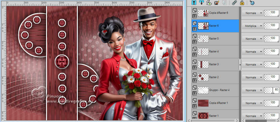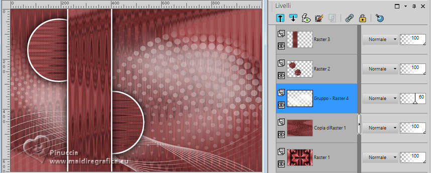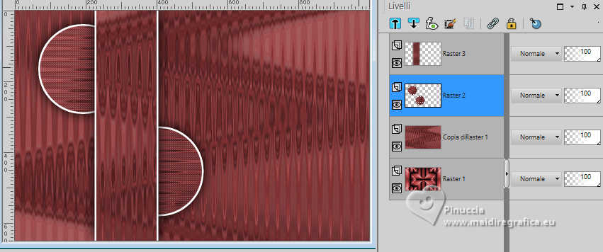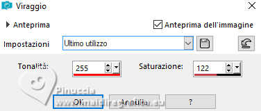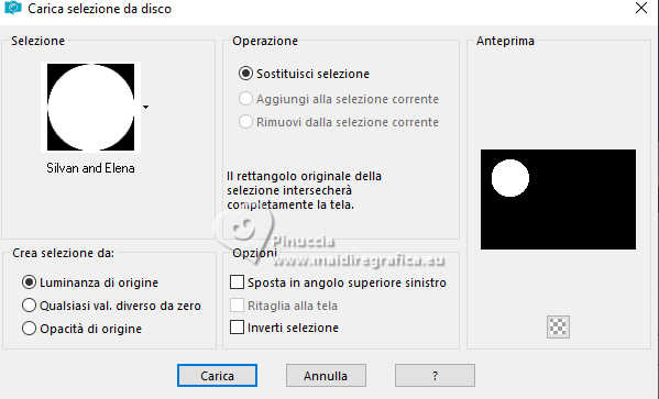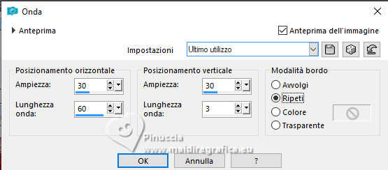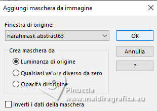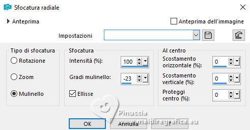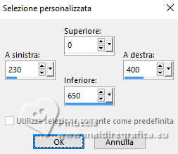 qui puoi trovare qualche risposta ai tuoi dubbi. Se l'argomento che ti interessa non è presente, ti prego di segnalarmelo. Questo tutorial è stato realizzato con PSP2019 e tradotto con PSPX9 e PSP2020, ma può essere realizzato anche con le altre versioni di PSP. Dalla versione X4, il comando Immagine>Rifletti è stato sostituito con Immagine>Capovolgi in orizzontale, e il comando Immagine>Capovolgi con Immagine>Capovolgi in verticale. Nelle versioni X5 e X6, le funzioni sono state migliorate rendendo disponibile il menu Oggetti. Con la nuova versione X7, sono tornati Rifletti>Capovolgi, ma con nuove varianti. Vedi la scheda sull'argomento qui Grazie ai creatori dei tubes che mettono a disposizione il loro lavoro in vari gruppi di condivisione. Rispetta il lavoro degli autori, non cambiare il nome del file e non cancellare il watermark. traduzione francese qui traduzione inglese qui Le vostre versioni qui![]() Occorrente: ![]() Per i tubes usati grazie Kamil e Mentali. Per la maschera grazie Narah. (in questa pagina trovi i links ai siti dei creatori di tubes) ![]() in caso di dubbi, ricorda di consultare la mia sezione filtri qui Carolaine and Sensibility - CS-LDots qui AAA Frames - Foto Frame qui ![]() non esitare a cambiare modalità di miscelatura e opacità secondo i colori utilizzati. ![]() Metti la selezione nella cartella Selezioni. Apri la maschera in PSP e minimizzala con il resto del materiale. Scegli dai tubes un colore chiaro e un colore scuro. ![]() 1. Apri background ![]() Maiuscola+D sulla tastiera per fare una copia. Chiudi l'originale. La copia sarà la base del tuo lavoro. Colorizza con uno dei tuoi colori. Per il mio esempio: Regola>Tonalità e Saturazione>Viraggio ![]() Livelli>Duplica. 2. Regola>Sfocatura>Sfocatura radiale. ![]() Effetti>Effetti di distorsione>Onda. ![]() Selezione>Carica/Salva selezione>Carica selezione da disco. Cerca e carica la selezione Silvan and Elena ![]() Selezione>Innalza selezione a livello. Livelli>Nuovo livello raster. Livelli>Disponi>Sposta giù. Selezione>Modifica>Espandi - 5 pixels. Imposta il colore di primo piano con il colore bianco. Riempi con il colore bianco.Selezione>Deseleziona. 3. Attiva il livello superiore. Immagine>Ruota per gradi - 90 gradi a destra. ![]() Effetti>Plugins>Carolaine and Sensibility - CS-LDots ![]() Livelli>Unisci>Unisci giù. Effetti>Effetti 3D>Sfalsa ombra, colore nero. ![]() Attiva lo strumento Selezione ![]() (non importa il tipo di selezione impostato, perché con la selezione personalizzata si ottiene sempre un rettangolo) clicca sull'icona Selezione personalizzata ![]() e imposta i seguenti settaggi. ![]() Attiva il livello Copia di Raster 1. Selezione>Innalza selezione a livello. Livelli>Disponi>Porta in alto. 4. Selezione>Modifica>Espandi - 5 pixels. Livelli>Nuovo livello raster. Livelli>Disponi>Sposta giù. Riempi con il colore bianco.Attiva il livello superiore. Immagine>Rifletti>Rifletti verticalmente (Immagine>Capovolgi). Livelli>Unisci>Unisci giù. Selezione>Deseleziona. Effetti>Effetti 3D>Sfalsa ombra, con i settaggi precedenti. Attiva il livello Raster 2. Tasto K per attivare lo strumento Puntatore ![]() e imposta Posizione X: 30,00 e Posizione Y: 2,00. ![]() 5. Livelli>Duplica. Imposta Posizione X: 262,00 e Posizione Y: 308,00. ![]() Livelli>Unisci>Unisci giù. ![]() Attiva il livello sottostante, copia di Raster 1. Livelli>Nuovo livello raster. Riempi il livello con il colore bianco.6. Livelli>Nuovo livello maschera>Da immagine. Apri il menu sotto la finestra di origine e vedrai la lista dei files aperti. Seleziona la maschera narahmask abstract63 ![]() Effetti>Effetti di bordo>Aumenta. Livelli>Unisci>Unisci gruppo. Immagine>Rifletti>Rifletti orizzontalmente (Immagine>Rifletti). Abbassa l'opacità di questo livello al 60%. ![]() Attiva il livello superiore. Apri deco-1 ![]() Modifica>Copia. Torna al tuo lavoro e vai a Modifica>Incolla come nuovo livello. Tasto K per attivare lo strumento Puntatore ![]() e imposta Posizione X: 271,00 e Posizione Y: 72,00. ![]() Effetti>Effetti 3D>Sfalsa ombra, colore nero. ![]() 7. Apri deco-2 ![]() Modifica>Copia. Torna al tuo lavoro e vai a Modifica>Incolla come nuovo livello. Imposta Posizione X: 82,00 e Posizione Y: 56,00. ![]() Effetti>Effetti 3D>Sfalsa ombra, con i settaggi precedenti. Apri il tube principale KamilTube-1902 ![]() Cancella il watermark e vai a Modifica>Copia. Torna al tuo lavoro e vai a Modifica>Incolla come nuovo livello. Immagine>Ridimensiona, se e quanto necessario, per me al 95%, tutti i livelli non selezionato. Regola>Messa a fuoco>Metti a fuoco. Sposta il tube a destra.Livelli>Duplica. 8. Attiva il livello sottostante dell'originale. Regola>Sfocatura>Sfocatura gaussiana - raggio 20. ![]() Cambia la modalità di miscelatura di questo livello in Moltiplica. ![]() 9. Attiva il livello Raster 1. Modifica>Copia Immagine>Aggiungi bordatura, 3 pixels, simmetriche, colore bianco. Immagine>Aggiungi bordatura, 5 pixels, simmetriche, colore scuro. Immagine>Aggiungi bordatura, 3 pixels, simmetriche, colore bianco. Selezione>Seleziona tutto. Immagine>Aggiungi bordatura, 45 pixels, simmetriche, colore chiaro. Selezione>Inverti. Modifica>Incolla nella selezione 10. Regola>Sfocatura>Sfocatura gaussiana - raggio 20. ![]() Effetti>Plugins>AAA Frames - Foto Frame. ![]() Effetti>Effetti di riflesso>Specchio rotante, con i settaggi standard. ![]() Selezione>Deseleziona. Apri deco-3 ![]() Modifica>Copia. Torna al tuo lavoro e vai a Modifica>Incolla come nuovo livello. Immagine>Ridimensiona, 1000 pixels di larghezza, tutti i livelli selezionato. Firma il tuo lavoro su un nuovo livello. Livelli>Unisci>Unisci tutto e salva in formato jpg. ![]() Se hai problemi o dubbi, o trovi un link non funzionante, o anche soltanto per un saluto, scrivimi. |