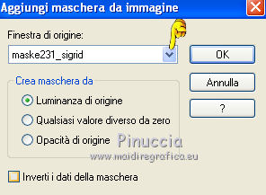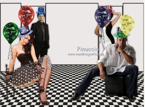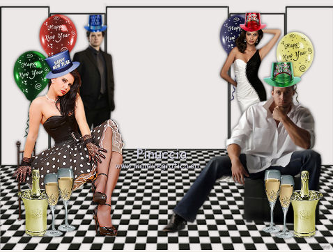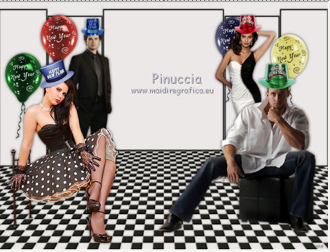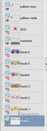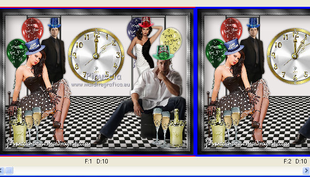 qui puoi trovare qualche risposta ai tuoi dubbi. Se l'argomento che ti interessa non è presente, ti prego di segnalarmelo. Questo tutorial è stato creato con PSP X2, ma può essere eseguito anche con le altre versioni di PSP. Per tradurlo, ho usato PSP X. Il materiale viene da vari gruppi di condivisione. Il copyright appartiene ai rispettivi autori. Grazie ai creatori dei tubes che mettono a disposizione il loro lavoro in vari gruppi di condivisione. Rispetta il lavoro degli autori, non cambiare il nome del file e non cancellare il watermark. Occorrente: Materiale qui L'orologio è una creazione di Pitti, rielaborata da Inge-Lore. Se vuoi l'originale può scaricarlo sul sito di Pitti's grafikwolke Filtri: Xero - Improver qui Mura's Seamless - Emboss at Alpha qui Animation Shop qui Apri la maschera in PSP e minimizzala con il resto del materiale. 1. Scegli dai tuoi tubes un colore chiaro per il colore di primo piano (il mio #ece8e7), e un colore scuro per il colore di sfondo (il mio #23241e). Apri una nuova immagine trasparente 800 x 600 pixels, e riempila con il colore di primo piano.Livelli>Nuovo livello raster. Riempi con il colore di sfondo.Livelli>Nuovo livello maschera>Da immagine. Apri il menu sotto la finestra di origine e vedrai la lista dei files aperti. Seleziona la maschera maske231_sigrid, con i seguenti settaggi. ![]() Livelli>Unisci>Unisci gruppo. Effetti>Plugins>Mura's Seamless - Emboss at Alpha, con i settaggi standard. ![]() Effetti>Effetti 3D>Sfalsa ombra. ![]() 2. Apri il tube "[CEL004(TW)_Abr-2009-[1]J". Attiva il livello Raster 1 e vai a Modifica>Copia. Torna al tuo lavoro e vai a Modifica>Incolla come nuovo livello. Immagine>Ridimensiona, 1 volta al 50%, e 2 volte al 90%, tutti i livelli non selezionato. Effetti>Plugins>Xero - Improver. ![]() Sposta il tube sullo sfondo a sinistra.Effetti>Effetti 3D>Sfalsa ombra. ![]() 3. Apri "vio521". Attiva il livello Raster 1 e vai a Modifica>Copia. Torna al tuo lavoro e vai a Modifica>Incolla come nuovo livello. Immagine>Ridimensiona, al 70%, tutti i livelli non selezionato. Effetti>Plugins>Xero - Improver. ![]() Effetti>Effetti 3D>Sfalsa ombra, con i settaggi precedenti. Sposta il tube sullo sfondo a destra.Apri il tube "cal-guis-men2-15102008". Attiva il livello Raster 1 e vai a Modifica>Copia. Torna al tuo lavoro e vai a Modifica>Incolla come nuovo livello. Immagine>Ridimensiona, all'80%, tutti i livelli non selezionato. Effetti>Plugins>Xero - Improver. ![]() Effetti>Effetti 3D>Sfalsa ombra, con i settaggi precedenti. Sposta il tube davanti a destra.Apri il tube "TreeTibesFemal201000" e vai a Modifica>Copia. Torna al tuo lavoro e vai a Modifica>Incolla come nuovo livello. Immagine>Ridimensiona, al 70%, tutti i livelli non selezionato. Effetti>Plugins>Xero - Improver, con i settaggi precedenti. Effetti>Effetti 3D>Sfalsa ombra, con i settaggi precedenti. Sposta il tube davanti a sinistra.![]() Uno alla volta copia e incolla i tubes "pdc-baloon" da 1 a 4. Immagine>Ridimensiona, al 30%, tutti i livelli non selezionato. Effetti>Plugins>Xero - Improver, con i settaggi precedenti. Effetti>Effetti 3D>Sfalsa ombra, con i settaggi precedenti. Posiziona i palloni sullo sfondo.![]() Porta i quattro livelli sopra il livello della maschera. E avrai questo. ![]() 5. Attiva il livello superiore. Dallo scrap "1219082621_scrap" copia il livello della bottiglia. Torna al tuo lavoro e vai a Modifica>Incolla come nuovo livello. Immagine>Ridimensiona, al 70%, tutti i livelli non selezionato. Effetti>Plugins>Xero - Improver, con i settaggi precedenti. Effetti>Effetti 3D>Sfalsa ombra, con i settaggi precedenti. Livelli>Duplica. Immagine>Rifletti. Dallo scrap copia il livello dei bicchieri. Torna al tuo lavoro e vai a Modifica>Incolla come nuovo livello. Immagine>Ridimensiona, al 70%, tutti i livelli non selezionato. Effetti>Plugins>Xero - Improver, con i settaggi precedenti. Effetti>Effetti 3D>Sfalsa ombra, con i settaggi precedenti. Livelli>Duplica. Posiziona il bicchiere sul precedente (vedi il mio esempio).Livelli>Unisci>Unisci giù. Livelli>Duplica. Immagine>Rifletti. ![]() 6. Ora copia i fuochi d'artificio come preferisci. Sei libero di comporli a tuo piacimento. Attiva il livello più basso e sopra questo arrangia gli altri fuochi, differenti o identici (due fuochi per ogni livello). Applica l'Effetto Improver (non l'Effetto Sfalsa ombra). Alla fine dovresti avere 6 livelli di fuochi. Chiudi tutti questi livelli. ![]() 7. Apri il tube "tube corinne.vicaire - happy new year 01.19.12.10" e vai a Modifica>Copia. Torna al tuo lavoro e vai a Modifica>Incolla come nuovo livello. Immagine>Ridimensiona, all'80%, tutti i livelli non selezionato. Effetti>Plugins>Xero - Improver, con i settaggi precedenti. Effetti>Effetti 3D>Sfalsa ombra, con i settaggi precedenti. Nella paletta dei livelli porta questo livello sopra il livello della maschera, e chiudi il livello. 8. Attiva il livello superiore. Livelli>Nuovo livello raster. Selezione>Seleziona tutto. Apri "fantasy-21-bd10-10-10" e vai a Modifica>Copia. Torna al tuo lavoro e vai a Modifica>Incolla nella selezione. Selezione>Deseleziona. Regola>Tonalità e saturazione>Viraggio. ![]() Attiva lo strumento Bacchetta magica ![]() e clicca al centro dell'immagine. Effetti>Effetti 3D>Ritaglio. ![]() Selezione>Deseleziona. La cornice potrebbe aver coperto parte delle immagini, se necessario, correggi la posizione dei tubes.Attiva il livello superiore, e aggiungi il tuo nome e/o il tuo watermark su un nuovo livello. Chiudi i livelli dei fuochi e del testo. Questa dovrebbe essere la tua paletta dei livelli. ![]() ![]() 9. Animazione. Modifica>Copia Unione. Apri Animation Shop e vai a Modifica>Incolla>Incolla come nuova animazione. Modifica>Duplica, e ripeti finchè non avrai 13 fotogrammi. Clicca sul primo fotogramma per selezionarlo e vai a Modifica>Seleziona tutto. Apri l'animazione "Uhr©Pitti_Ani©ILR", anche questa composta da 13 fotogrammi. Modifica>Seleziona tutto. Modifica>Copia. Attiva il tuo lavoro e