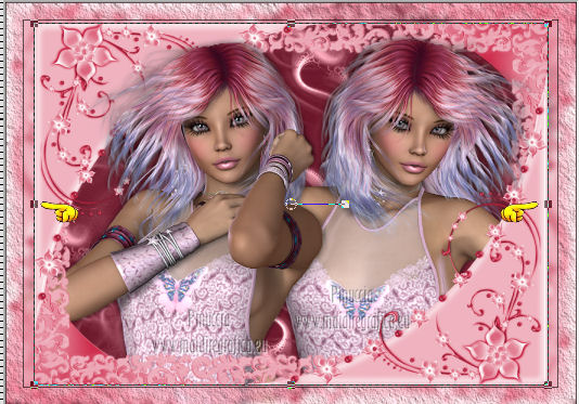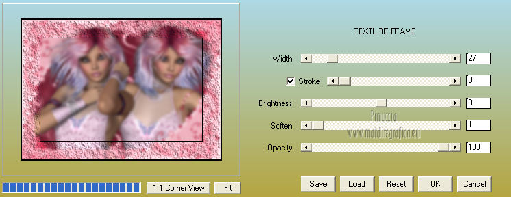 qui puoi trovare qualche risposta ai tuoi dubbi. Se l'argomento che ti interessa non è presente, ti prego di segnalarmelo. Questo tutorial è stato creato con PSP X5, ma può essere eseguito anche con le altre versioni di PSP. Per tradurlo, ho usato PSP X. Grazie ai creatori dei tubes che mettono a disposizione il loro lavoro in vari gruppi di condivisione. Rispetta il lavoro degli autori, non cambiare il nome del file e non cancellare il watermark. Occorrente: Due tubes a scelta. Il resto del materiale qui Per i poser usati grazie Tanya Filtri: Xero - Improver qui AAA Frames - Texture Frame qui 1. Scegli due colori dal tuo tube. Imposta il colore di primo piano con il colore chiaro, e il colore di sfondo con il colore scuro. Apri "Frame". Duplica l'immagine usando la combinazione di tasti maiuscola+D e chiudi l'originale. La copia sarà la base del tuo lavoro. Livelli>Nuovo livello raster. Livelli>Disponi>Sposta giù. Riempi il livello con il colore di sfondo.Apri "Apo-177-bd-4-4-12" e vai a Modifica>Copia. Torna al tuo lavoro e vai a Modifica>Incolla come nuovo livello. Cambia la modalità di miscelatura di questo livello in Luminanza (Esistente). 2. Apri il tuo primo tube e vai a Modifica>Copia. Torna al tuo lavoro e vai a Modifica>Incolla come nuovo livello. Questo livello deve trovarsi sotto il livello della cornice. Sposta il tube a destra.Effetti>Plugins>Xero - Improver. ![]() Effetti>Effetti 3D>Sfalsa ombra. ![]() Apri il secondo tube e vai a Modifica>Copia. Torna al tuo lavoro e vai a Modifica>Incolla come nuovo livello. Sposta il tube a sinistra.Effetti>Plugins>Xero - Improver, con i settaggi precedenti. Effetti>Effetti 3D>Sfalsa ombra, con i settaggi precedenti. Attiva il livello superiore. Se la cornice non si intona con i colori dei tuoi tubes: prendi nota dei valori di tonalità (H) e saturazione (S) del tuo colore di sfondo, Regola>Tonalità e saturazione>Viraggio, e trascrivi i valori annotati nelle rispettive caselle. ![]() 3. Attiva il livello del primo tube. Selezione>Seleziona tutto. Selezione>Mobile. Selezione>Immobilizza. Attiva il livello della cornice, e cancella la parte che copre la testa del tube, ![]() la selezione proteggerà la cornice che non sarà cancellata oltre il necessario. Dovresti avere questo. ![]() Selezione>Deseleziona. Attiva il livello del secondo tube. Ripeti il passo precedente (non dimenticare di attivare il livello della cornice prima di cancellare). Risultato. ![]() Livelli>Unisci>Unisci visibile. 4. Livelli>Duplica. Immagine>Ridimensiona, al 90%, tutti i livelli non selezionato. Attiva il livello inferiore. Regola>Sfocatura>Sfocatura gaussiana - raggio 5. ![]() Effetti>Plugins>AAA Frames - Texture Frame. ![]() Attiva il livello superiore. Premi il tasto K per attivare lo strumento Puntatore ![]() se stai usando PSP 9, il tasto D per attivare lo strumento Deformazione ![]() in modalità Scala, spingi i nodi centrali a destra e a sinistra fino al bordo nero creato dal filtro Texture Frame. ![]() Dovresti avere questo. ![]() Premi il tasto M per liberarti della griglia dello strumento. 5. Effetti>Effetti 3D>Sfalsa ombra. ![]() Ripeti l'Effetto Sfalsa ombra, cambiando verticale e orizzontale con -10. Apri il tube "corner" e vai a Modifica>Copia. Torna al tuo lavoro e vai a Modifica>Incolla come nuovo livello. Spostalo nell'angolo in alto a sinistra.![]() Effetti>Effetti 3D>Sfalsa ombra. ![]() Livelli>Duplica. Immagine>Rifletti. Livelli>Unisci>Unisci giù. Livelli>Duplica. Immagine>Capovolgi. 6. Apri "WordartSisterFriends" e vai a Modifica>Copia. Torna al tuo lavoro e vai a Modifica>Incolla come nuovo livello. Selezione>Seleziona tutto. Selezione>Mobile. Selezione>Immobilizza. Selezione>Modifica>Contrai - 1 pixels. Passa il colore di primo piano a Gradiente. ![]() Riempi la selezione con il gradiente.Selezione>Deseleziona. Effetti>Effetti 3D>Sfalsa ombra, con i settaggi precedenti. Posiziona il testo dove preferisci,o vedi il mio esempio. Aggiungi il tuo nome e/o il tuo watermark su un nuovo livello, senza dimenticare i copyright delle immagini usate. Livelli>Unisci>Unisci tutto e salva in formato jpg. ![]() Se hai problemi o dubbi, o trovi un link non funzionante, o anche soltanto per un saluto, scrivimi. 3 Ottobre 2012 |