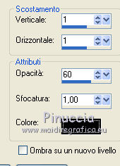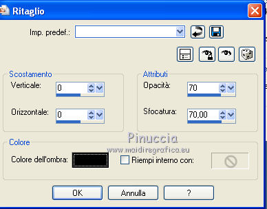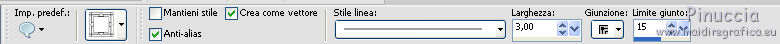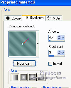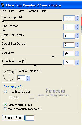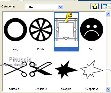 qui puoi trovare qualche risposta ai tuoi dubbi. Se l'argomento che ti interessa non è presente, ti prego di segnalarmelo. Questo tutorial è stato creato con PSP X2, ma può essere eseguito anche con le altre versioni di PSP. Per tradurlo, ho usato PSP X. Il materiale viene da vari gruppi di condivisione. Il copyright appartiene ai rispettivi autori. Grazie ai creatori dei tubes che mettono a disposizione il loro lavoro in vari gruppi di condivisione. Rispetta il lavoro degli autori, non cambiare il nome del file e non cancellare il watermark. Occorrente: Materiale qui Grazie Ellie per il bel tube. Filtri: Mura's Seamless - Emboss at Alpha qui Xero - Improver qui Alien Skin Xenofex 2.0 - Constellation qui Animation Shop qui Metti il file "Tiles" nella cartella Forme predefinite. 1. Scegli due colori dai tuoi tubes, imposta il colore di primo piano con il colore chiaro, e il colore di sfondo con il colore scuro. Passa il colore di primo piano a Gradiente, con i seguenti settaggi. ![]() Apri una nuova immagine trasparente 900 x 600 pixels, e riempila con il gradiente.Attiva lo strumento Forme predefinite ,e seleziona la forma "S" ![]() con i seguenti settaggi. ![]() Inverti i colori nella paletta dei materiali, in modo che il gradiente passi a colore di sfondo. Passa il colore di primo piano a Motivi e seleziona un motivo oro a tua scelta. Inverti i colori del gradiente cliccando sulla piccola freccia tra le palette più piccole. ![]() 2. Traccia la forma partendo dall'angolo in alto a sinistra, fino all'angolo in basso a destra. ![]() Livelli>Converti in livello raster. Effetti>Plugins>Mura's Seamless - Emboss at Alpha. ![]() Effetti>Effetti 3D>Sfalsa ombra, con il colore nero. ![]() Attiva lo strumento Bacchetta magica ![]() e clicca al centro della forma per selezionarla. ![]() Selezione>Modifica>Espandi - 5 pixels. ![]() Selezione>Inverti. Apri il tube "Sep Series Mixture 1-2" e vai a Modifica>Copia. Torna al tuo lavoro e vai a Modifica>Incolla come nuovo livello. Livelli>Disponi>Sposta giù. Posiziona il tube nell'area selezionata.![]() Premi sulla tastiera il tasto CANC. Selezione>Deseleziona. Effetti>Plugins>Xero - Improver. ![]() Attiva il livello superiore. 3. Apri il tube "elliwoman123" e vai a Modifica>Copia. Torna al tuo lavoro e vai a Modifica>Incolla come nuovo livello. Immagine>Ridimensiona, all'85%, tutti i livelli non selezionato. Sposta il tube a sinistra.Livelli>Duplica. Regola>Sfocatura>Sfocatura gaussiana - raggio 30. ![]() Livelli>Disponi>Sposta giù. Attiva nuovamente il livello superiore. Effetti>Plugins>Xero - Improver. ![]() Livelli>Unisci>Unisci giù. 4. Apri "SnowflakebyLoryM-1.2-08-LM", che contiene una selezione. Mantieni la selezione e vai a Modifica>Copia. Torna al tuo lavoro e vai a Modifica>Incolla come nuovo livello. Sposta le stelle contro il bordo superiore.Effetti>Plugins>Mura's Seamless - Emboss at Alpha, con i settaggi precedenti. Effetti>Effetti 3D>Sfalsda ombra, con i settaggi precedenti. Livelli>Duplica. Immagine>Capovolgi. Livelli>Unisci>Unisci giù. Livelli>Disponi>Sposta giù. Attiva nuovamente il livello superiore. Livelli>Nuovo livello raster. Riempi con il motivo oro.Selezione>Seleziona tutto. Selezione>Modifica>Contrai - 3 pixels. Premi sulla tastiera il tasto CANC. Livelli>Nuovo livello raster. Livelli>Disponi>Sposta giù. Effetti>Effetti 3D>Ritaglio. ![]() Selezione>Deseleziona. 5. Attiva il livello superiore. Attiva lo strumento Testo , scegli un font,e scrivi un testo mantenendo il colore di primo piano con il motivo oro e il colore di sfondo con il gradiente. Se preferisci, copia e incolla il file di testo fornito con il materiale. Aggiungi il tuo nome e/o il tuo watermark su un nuovo livello. 6. Attiva il livello della forma - Raster 2. Effetti>Plugins>Alien Skin Xenofex 2.0 - Constellation. ![]() Modifica>Copia Unione. Apri Animation Shop e vai a Modifica>Incolla>Incolla come nuova animazione. Torna in PSP. Modifica>Annulla azione Constellation. Ripeti l'Effetto Constellation, cliccando una volta su Random Seed. Modifica>Copia Unione. Torna in Animation Shop e vai a Modifica>Incolla>Incolla dopo il fotogramma corrente. Di nuovo in PSP. Modifica>Annulla azione Constellation. Ripeti l'Effetto Constellation, clicca una volta su Random Seed e ok. Modifica>Copia Unione. In Animation Shop: Modifica>Incolla>Incolla dopo il fotogramma corrente. Controlla il risultato cliccando su Visualizza e salva in formato gif.![]() Se hai problemi o dubbi, o trovi un link non funzionante, o anche soltanto per un saluto, scrivimi 22 Ottobre 2011 |