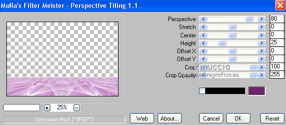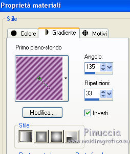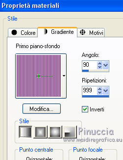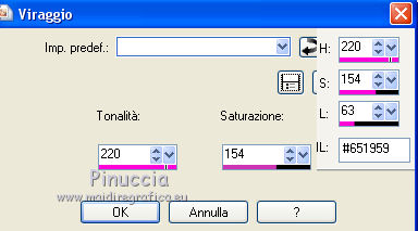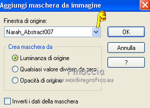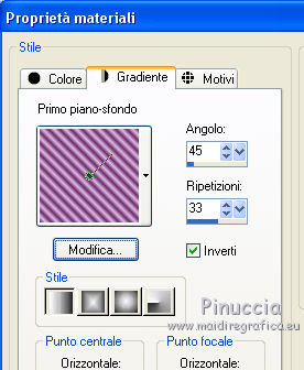 qui puoi trovare qualche risposta ai tuoi dubbi. Se l'argomento che ti interessa non è presente, ti prego di segnalarmelo. Questo tutorial è stato creato con PSP X5, ma può essere eseguito anche con le altre versioni di PSP. Per tradurlo, ho usato PSP X. Se stai usando le nuove versioni di PSP, a proposito delle funzioni Rifletti/Capovolgi, vedi la mia scheda qui Grazie ai creatori dei tubes che mettono a disposizione il loro lavoro in vari gruppi di condivisione. Rispetta il lavoro degli autori, non cambiare il nome del file e non cancellare il watermark. Occorrente: A scelta il tube di un personaggio, un paesaggio e un tube accessorio. Il resto del materiale qui Per il tube usato grazie Monro Per i tubes accessori grazie Guismo Filtri: Mura's Meister - Perspective Tiling qui Metti il preset Emboss 3 nella cartella Impostazioni predefinite. Apri la maschera in PSP e minimizzala con il resto del materiale. *** Il materiale fornito può essere colorizzato. Prendi nota dei valori di Tonalità (H) e Saturazione (S) del colore scelto, Regola>Tonalità e Saturazione>Viraggio, e trascrivi i valori annotati nelle rispettive caselle. ![]() Se il risultato visibile nella finestra di anteprima non ti soddisfa, puoi giocare con il valore di Saturazione. ***** 1. Scegli due colori dal tuo tube e imposta il colore di primo piano con il colore chiaro, e il colore di sfondo con il colore scuro. Apri una nuova immagine trasparente 900 x 600 pixels, e riempila con il colore di primo piano.Apri "HG-05b" e vai a Modifica>Copia. Torna al tuo lavoro e vai a Modifica>Incolla come nuovo livello. Effetti>Plugins>Mura's Meister - Perspective Tiling. ![]() Effetti>Effetti 3D>Sfalsa ombra. ![]() Apri "element_ILR" e vai a Modifica>Copia. Torna al tuo lavoro e vai a Modifica>Incolla come nuovo livello. Sposta l'elemento contro il bordo superiore.Effetti>Effetti 3D>Sfalsa ombra, con i settaggi precedenti. 2. Apri una nuova immagine trasparente 455 x 455 pixels e riempila con il colore di sfondo.Livelli>Nuovo livello maschera>Da immagine. Apri il menu sotto la finestra di origine e vedrai la lista dei files aperti. Seleziona la maschera Narah_Abstract007, con i seguenti settaggi. ![]() Livelli>Unisci>Unisci gruppo. Modifica>Copia. Torna al tuo lavoro e vai a Modifica>Incolla come nuovo livello. Sposta l'immagine in alto a sinistra.Livelli>Duplica. Livelli>Unisci>Unisci giù. Livelli>Duplca. Immagine>Rifletti. Se necessario, posiziona correttamente l'immagine a destra.Livelli>Unisci>Unisci giù. Livelli>Disponi>Sposta giù. Effetti>Filtro definito dall'utente - seleziona il preset Emboss 3 e ok. ![]() 3. Apri il tube del paesaggio e vai a Modifica>Copia. Torna al tuo lavoro e vai a Modifica>Incolla come nuovo livello. Immagine>Ridimensiona, se e quanto necessario, tutti i livelli non selezionato. Regola>Messa a fuoco>Metti a fuoco. Attiva lo strumento Selezione , rettangolo,e traccia una piccola striscia di circa 10 pixels. ![]() Livelli>Nuovo livello raster. Passa il colore di primo piano a Gradiente di primo piano/sfondo, stile Lineare. ![]() Riempi il livello con il gradiente.Effetti>Effetti 3D>Smusso a incasso. ![]() Selezione>Deseleziona. Posiziona correttamente la striscia sul bordo centrale.![]() 4. Apri il tuo tube accessorio e vai a Modifica>Copia. Torna al tuo lavoro e vai a Modifica>Incolla come nuovo livello. Immagine>Ridimensiona, se e quanto necessario, tutti i livelli non selezionato. Spostalo dove preferisci,o vedi il mio esempio. Regola>Messa a fuoco>Metti a fuoco. Effetti>Effetti 3D>Sfalsa ombra. ![]() Apri il tuo tube e vai a Modifica>Copia. Torna al tuo lavoro e vai a Modifica>Incolla come nuovo livello. Immagine>Ridimensiona, se e quanto necessario, tutti i livelli non selezionato. Spostalo dove preferisci,o vedi il mio esempio. Regola>Messa a fuoco>Metti a fuoco. Effetti>Effetti 3D>Sfalsa ombra, con i settaggi precedenti. 5. Livelli>Nuovo livello raster. Selezione>Seleziona tutto. Cambia i settaggi del Gradiente. ![]() Riempi il livello con il gradiente.Selezione>Modifica>Contrai - 5 pixels. ![]() Riempi con il colore di sfondo.Selezione>Modifica>Contrai - 3 pixels. Cambia nuovamente i settaggi del Gradiente. ![]() Riempi la selezione con il gradiente.Selezione>Modifica>Contrai - 5 pixels. Effetti>Effetti 3D>Ritaglio. ![]() Selezione>Deseleziona. Aggiungi il tuo nome e/o il tuo watermark su un nuovo livello, senza dimenticare eventuali copyright delle immagini usate. Livelli>Unisci>Unisci tutto e salva in formato jpg. ![]() Le vostre versioni. Grazie a tutti ![]() Azalee ![]() Se hai problemi o dubbi, o trovi un link non funzionante, o anche soltanto per un saluto, scrivimi. 15 Marzo 2014 |