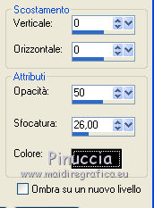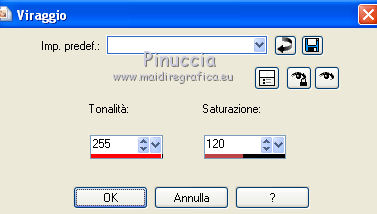 qui puoi trovare qualche risposta ai tuoi dubbi. Se l'argomento che ti interessa non è presente, ti prego di segnalarmelo. Questo tutorial è stato creato con PSP X2, ma può essere eseguito anche con le altre versioni di PSP. Per tradurlo, ho usato PSP X. Grazie ai creatori dei tubes che mettono a disposizione il loro lavoro in vari gruppi di condivisione. Rispetta il lavoro degli autori, non cambiare il nome del file e non cancellare il watermark. Occorrente: A scelta tubes di un paesaggio e di due personaggi (busto e figura intera). Il resto del materiale qui Per i bei poser grazie Moni Filtri: Mura's Seamless - Emboss at Alpha qui Xero - Improver qui Porcelain - Xero XL qui Tramages - Tow the line qui ***** Trovi le regole del Contest di Inge-Lore qui ***** Apri la maschera in PSP e minimizzala con il resto del materiale. 1. Scegli due colori dal tuo tube, e imposta il colore di primo piano con il colore chiaro, e il colore di sfondo con il colore scuro. Apri "vorlage_ILR". Duplicalo usando la combinazione di tasti maiuscola+D e chiudi l'originale. Lavora sulla copia. Livelli>Nuovo livello raster. Riempi con il colore di sfondo.Livelli>Nuovo livello maschera>Da immagine. Apri il menu sotto la finestra di origine e vedrai la lista dei files aperti. Seleziona la maschera "jillbluemask99" con i seguenti settaggi. ![]() Livelli>Unisci>Unisci gruppo. Effetti>Plugins>Mura's Seamless - Emboss at Alpha. ![]() Effetti>Effetti 3D>Sfalsa ombra. ![]() 2. Attiva lo strumento Selezione , rettangolo,e traccia un rettangolo nel riquadro interno della maschera. ![]() Premi sulla tastiera il tasto CANC. Apri il tube del paesaggio e vai a Modifica>Copia. Torna al tuo lavoro e vai a Modifica>Incolla come nuovo livello. Posiziona il tube nell'area selezionata.![]() Selezione>Inverti. Premi sulla tastiera il tasto CANC. Selezione>Deseleziona. Apri il tube del busto e vai a Modifica>Copia. Torna al tuo lavoro e vai a Modifica>Incolla come nuovo livello. Immagine>Ridimensiona, se e quanto necessario. Spostalo a sinistra.Effetti>Plugins>Xero - Improver. ![]() Effetti>Effetti 3D>Sfalsa ombra. ![]() 3. Livelli>Nuovo livello raster. Selezione>Seleziona tutto. Apri il tube "frame3(776) e vai a Modifica>Copia. Torna al tuo lavoro e vai a Modifica>Incolla nella selezione. Selezione>Deseleziona. Regola>Tonalità e saturazione>Viraggio, con i valori corrispondenti a uno dei tuoi colori. I miei settaggi: ![]() Apri il tube a figura intera, e vai a Modifica>Copia. Torna al tuo lavoro e vai a Modifica>Incolla come nuovo livello. Immagine>Ridimensiona, se e quanto necessario. Spostalo a destra, o dove preferisci.Effetti>Plugins>Xero - Improver, con i settaggi precedenti. Effetti>Effetti 3D>sfalsa ombra,, con i settaggi precedenti. 4. Livelli>Unisci>Unisci tutto. Immagine>Aggiungi bordatura, 1 pixel, simmetriche, con il colore di primo piano. Livelli>Innalza livello di sfondo. Immagine>Ridimensiona, al 90%, tutti i livelli non selezionato. Livelli>Nuovo livello raster. Livelli>Disponi>Sposta giù. Riempi con il colore di sfondo.Effetti>Plugins>Tramages - Tow the line. (questo filtro si può usare anche importato in Filters Unlimited). ![]() 5. Attiva il livello superore. Effetti>Effetti 3D>Sfalsa ombra. ![]() Ripeti l'Effetto Sfalsa ombra, cambiando verticale e orizzontale con -10. Effetti>Plugins>Xero - Porcelain XL, con i settaggi standard. ![]() Scrivi il tuo testo (in questo caso non dimenticare di applicare l'Effetto Sfalsa ombra), oppure usa il file di testo fornito con il materiale. Su nuovi livelli, aggiungi il tuo nome e/o il tuo watermark, e i copyright delle immagini usate. Se intendi partecipare al contest, aggiungi il watermark del Contest, ma non scrivere il nome sulla tag. ![]() Livelli>Unisci>Unisci tutto. Immagine>Aggiungi bordatura, 1 pixel, simmetriche, con il colore di primo piano. Salva in formato jpg. ***** Se intendi partecipare al contest, NON scrivere il tuo nome sulla tag, e inviala - scrivendo nell'oggetto soltanto "Wetti" - a questo indirizzo wetti_guckmal@gmx.de ***** ![]() Se hai problemi o dubbi, o trovi un link non funzionante, o anche soltanto per un saluto, scrivimi. 16 Aprile 2012 |