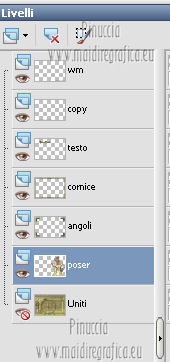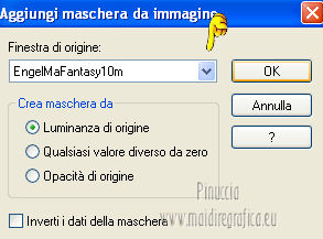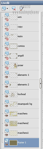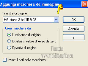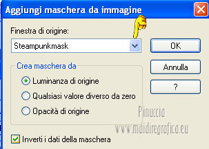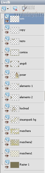 qui puoi trovare qualche risposta ai tuoi dubbi. Se l'argomento che ti interessa non è presente, ti prego di segnalarmelo. Questo tutorial è stato creato con PSP X2 e tradotto con CorelX, ma può essere eseguito anche con le altre versioni di PSP. Dalla versione X4, il comando Immagine>Rifletti è stato sostituito con Immagine>Capovolgi in orizzontale, e il comando Immagine>Capovolgi con Immagine>Capovolgi in verticale. Nelle versioni X5 e X6, le funzioni sono state migliorate rendendo disponibile il menu Oggetti. Con la nuova versione X7, sono tornati Rifletti>Capovolgi, ma con nuove varianti. Vedi la scheda sull'argomento qui Occorrente: Un tube a scelta. Il resto del materiale qui Per il poser usato grazie Andrea (in questa pagina trovi i links ai loro siti). Animation Shop qui Apri le maschere in PSP e minimizzale con il resto del materiale, tranne le due aninmazioni che userai in Animation Shop. Gli elementi del materiale sono abbinati ai miei colori. Se usi altri colori, applica il Viraggio (come fare vedi qui) Per cambiare il colore delle animazioni, apri l'animazione in Animation Shop. Modifica>Seleziona tutto. Modifica>Copia. In PSP: Modifica>Incolla come nuova immagine. Applica il Viraggio su tutti i livelli, e salva l'animazione con un altro nome. 1. Scegli due colori dai tuoi tubes. Imposta il colore di primo piano con il colore chiaro, e il colore di sfondo con il colore scuro. I miei colori: ![]() Apri una nuova immagine trasparente 900 x 600 pixels, e riempila con il colore di sfondo.Livelli>Nuovo livello raster. Riempi con il colore di primo piano.Livelli>Nuovo livello maschera>Da immagine. Apri il menu sotto la finestra di origine e vedrai la lista dei files aperti. Seleziona la maschera "HG-sterne-3-bd-15-9-09", con i seguenti settaggi: ![]() Livelli>Unisci>Unisci gruppo. Effetti>Effetti di bordo>Aumenta. Livelli>Nuovo livello raster. Riempi di nuovo con il colore di primo piano.Livelli>Nuovo livello maschera>Da immagine. Apri il menu sotto la finestra di origine e seleziona la maschera "EngelMaFantasy10m", con i seguenti settaggi: ![]() Livelli>Unisci>Unisci gruppo. Regola>Messa a fuoco>Metti a fuoco - 2 volte. Effetti>Effetti 3D>Sfalsa ombra. ![]() 3. Livelli>Nuovo livello raster. Riempi ancora con il colore di primo piano.Livelli>Nuovo livello maschera>Da immagine. Apri il menu sotto la finestra di origine e seleziona la maschera "Steampunkmask", con i seguenti settaggi: ![]() Livelli>Unisci>Unisci gruppo. Effetti>Effetti di bordo>Aumenta. Effetti>Effetti 3D>Sfalsa ombra, con i settaggi precedenti. Apri "steampunk_hg" e vai a Modifica>Copia. Torna al tuo lavoro e vai a Modifica>Incolla come nuovo livello. Abbassa l'opacità di questo livello al 50%. Apri "hochrad" e vai a Modifica>Copia. Torna al tuo lavoro e vai a Modifica>Incolla come nuovo livello. Spostalo a sinistra.Regola>Messa a fuoco>Metti a fuoco. Effetti>Effetti 3D>Sfalsa ombra, con i settaggi precedenti. ![]() 4. Apri "element-2" e vai a Modifica>Copia. Torna al tuo lavoro e vai a Modifica>Incolla come nuovo livello. Spostalo a sinistra.Effetti>Effetti 3D>Sfalsa ombra, con i settaggi precedenti. ![]() Apri "element-1" e vai a Modifica>Copia. Torna al tuo lavoro e vai a Modifica>Incolla come nuovo livello. Spostalo in alto a destra.Effetti>Effetti 3D>Sfalsa ombra, con i settaggi precedenti. ![]() Apri il tuo tube e vai a Modifica>Copia. Torna al tuo lavoro e vai a Modifica>Incolla come nuovo livello. Spostalo a destra.Regola>Messa a fuoco>Metti a fuoco. Effetti>Effetti 3D>Sfalsa ombra. ![]() Se, come nel caso del mio tube, parte di questo è uscito dai bordi della tag, attiva il livello inferiore. Selezione>Seleziona tutto. Immagine>Ritaglia la selezione. 5. Attiva il livello superiore. Apri "borte" e vai a Modifica>Copia. Torna al tuo lavoro e vai a Modifica>Incolla come nuovo livello. Effetti>Effetti 3D>Sfalsa ombra. ![]() Livelli>Nuovo livello raster. Selezione>Seleziona tutto. Apri "rahmen-muster-12-bd-1-1-12" e vai a Modifica>Copia. Torna al tuo lavoro e vai a Modifica>Incolla nella selezione. Selezione>Deseleziona. Scrivi un tuo testo o usa il file di testo fornito con il materiale. Posiziona correttamente il testo.Effetti>Effetti 3D>Sfalsa ombra, con i settaggi precedenti. Aggiungi il tuo nome e/o il tuo watermark su un nuovo livello, senza dimenticare il copyright delle immagini usate. Questa dovrebbe essere la tua paletta dei livelli. ![]() Chiudi i sei livelli superiori e attiva il livello inferiore. ![]() Livelli>Unisci>Unisci visibile. Riapri i livelli chiusi (Livelli>Visualizza tutto). Chiudi il livello inferiore Uniti e attiva uno dei livelli visibili. ![]() Livelli>Unisci>Unisci visibile. E adesso avrai due livelli. ![]() 6. Animazione. Attiva il livello inferiore. Modifica>Copia. Apri Animation Shop e vai a Modifica>Incolla>Incolla come nuova animazione. Modifica>Duplica, e ripeti finchè non avrai 11 fotogrammi. Clicca sul primo fotogramma per selezionarlo e vai a Modifica>Seleziona tutto. Apri l'animazione "Ani_steampunk©ILR", anche questa composta da 11 fotogrammi. Modifica>Seleziona tutto. Modifica>Copia. Attiva il tuo lavoro e vai a Modifica>Incolla>Incolla nel fotogramma selezionato. Posiziona l'animazione al centro della ruota grande. ![]() Dovresti avere questo. ![]() 7. Apri "Ani2_steampunk©ILR". Modifica>Seleziona tutto. Modifica>Copia. Torna al tuo lavoro e vai a Modifica>Incolla>Incolla nel fotogramma selezionato. Posiziona l'animazione al centro della ruota piccola. ![]() Torna in PSP. Attiva il livello superiore e vai a Modifica>Copia. Torna in Animation Shop e vai a Modifica>Incolla>Incolla come nuova animazione. Modifica>Duplica, e ripeti finchè non avrai 11 fotogrammi. Modifica>Seleziona tutto. Modifica>Copia. Attiva il tuo lavoro e vai a Modifica>Incolla>Incolla nel fotogramma selezionato. Posiziona l'immagine perfettamente al centro. Controlla il risultato cliccando su Visualizza e salva in formato gif.Versione con tube di Krys ![]() ![]() Le vostre versioni. Grazie !