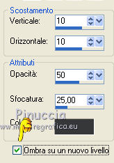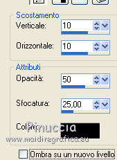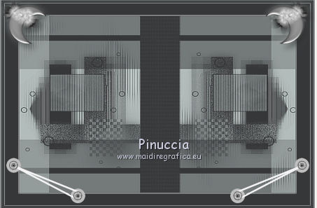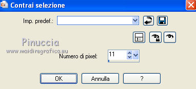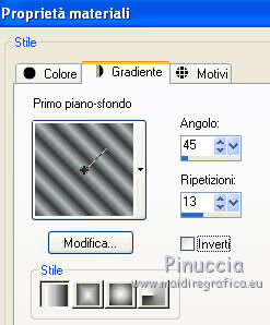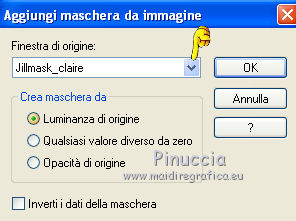 qui puoi trovare qualche risposta ai tuoi dubbi. Se l'argomento che ti interessa non è presente, ti prego di segnalarmelo. Questo tutorial è stato creato con PSP X2, ma può essere eseguito anche con le altre versioni di PSP. Per tradurlo, ho usato PSP X. Il materiale viene da vari gruppi di condivisione. Il copyright appartiene ai rispettivi autori. Grazie ai creatori dei tubes che mettono a disposizione il loro lavoro in vari gruppi di condivisione. Rispetta il lavoro degli autori, non cambiare il nome del file e non cancellare il watermark. Occorrente: Tube a scelta. Il resto del materiale qui Il tube utilizzato è di Angie. Filtri: Graphics Plus - Cross Shadow qui Alien Skin Xenofex 2.0 - Constellation qui Animation Shop qui Apri la maschera in PSP e minimizzala con il resto del materiale. 1. Scegli dai tuoi tubes un colore chiaro per il colore di primo piano, e un colore scuro per il colore di sfondo. Apri una nuova immagine trasparente 900 x 600 pixels, e riempila con il colore di sfondo.Livelli>Nuovo livello raster. Riempi con il colore di primo piano.Livelli>Nuovo livello maschera>Da immagine. Apri il menu sotto la finestra di origine e vedrai la lista dei files aperti. Seleziona la maschera Jillmask_claire, con i seguenti settaggi. ![]() Livelli>Unisci>Unisci gruppo. Regola>Messa a fuoco>Metti a fuoco. 2. Apri "Elemente©ILR e attiva il livello "mond". Modifica>Copia. Torna al tuo lavoro e vai a Modifica>Incolla come nuovo livello. Sposta l'elemento in alto come nel mio esempio.![]() Se hai un colore scuro come il mio, applica a tutti gli elementi questo Sfalsa ombra: Effetti>Effetti 3D>Sfalsa ombra. ![]() Se hai un colore chiaro, applica agli elementi questo Sfalsa ombra. ![]() Copia il livello "band" di "Elemente©ILR. Torna al tuo lavoro e vai a Modifica>Incolla come nuovo livello. Spostalo in basso.Non dimenticare l'Effetto Sfalsa ombra. ![]() Copia il livello "Blumen" di "Elemente©ILR. Torna al tuo lavoro e vai a Modifica>Incolla come nuovo livello. Spostalo al centro dei rettangoli.Non dimenticare l'Effetto Sfalsa ombra. ![]() 3. Copia il livello "Raute" di "Elemente©ILR. Torna al tuo lavoro e vai a Modifica>Incolla come nuovo livello. Posiziona l'elemento come nel mio esempio.Non dimenticare l'Effetto Sfalsa ombra. ![]() Copia il livello "Sternchen" di "Elemente©ILR. Torna al tuo lavoro e vai a Modifica>Incolla come nuovo livello. Spostalo nel cerchio.Rinomina questo livello "animazione". Effetti>Effetti 3D>Sfalsa ombra, ombra su nuovo livello selezionato. ![]() Apri il tuo tube e vai a Modifica>Copia. Torna al tuo lavoro e vai a Modifica>Incolla come nuovo livello. Immagine>Ridimensiona, quanto necessario, tutti i livelli non selezionato. Regola>Messa a fuoco>Metti a fuoco. Posiziona correttamente il tube.4. Attiva il livello inferiore. Selezione>Seleziona tutto. Selezione>Modifica>Contrai - 11 pixels. ![]() Selezione>Modifica>Seleziona bordature selezione. ![]() Passa il colore di primo piano a Gradiente. ![]() Riempi la selezione con il gradiente.Effetti>Plugins>Graphics Plus - Cross Shadow, con i settaggi standard. ![]() Regola>Aggiungi/Rimuovi disturbo>Aggiungi disturbo. ![]() Selezione>Deseleziona. Attiva il livello superiore. Aggiungi il tuo nome e/o il tuo watermark su un nuovo livello, senza dimenticare eventuali copyright delle immagini usate. 5. Animazione. Attiva il livello "animazione". Effetti>Plugins>Alien Skin Xenofex 2.0 - Constellation. ![]() Modifica>Copia Unione. Apri Animation Shop e vai a Modifica>Incolla>Incolla come nuova animazione. Torna in PSP. Modifica>Annulla azione Constellation. Effetti>Plugins>Alien Skin Xenofex 2.0 - Constellation, clicca su Random Seed e ok. Modifica>Copia Unione. In Animation Shop: Modifica>Incolla>Incolla dopo il fotogramma corrente. Di nuovo in PSP. Modifica>Annulla azione Constellation. Effetti>Plugins>Alien Skin Xenofex 2.0 - Constellation, clicca su Random Seed e ok. Modifica>Copia Unione. In Animation Shop: Modifica>Incolla>Incolla dopo il fotogramma corrente. Controlla il risultato cliccando su Visualizza e salva in formato gif.![]() Se hai problemi o dubbi, o trovi un link non funzionante, o anche soltanto per un saluto, scrivimi 28 Febbraio 2012 |