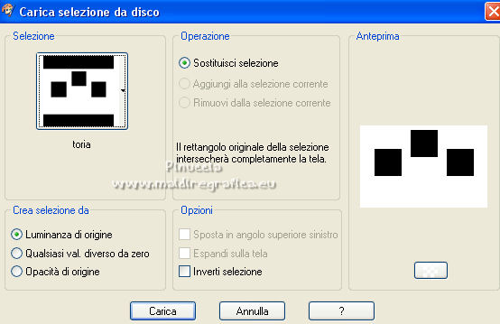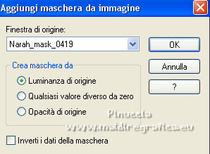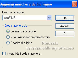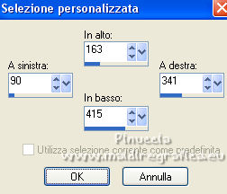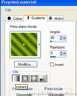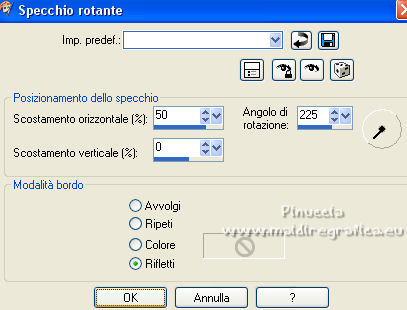 qui puoi trovare qualche risposta ai tuoi dubbi. Se l'argomento che ti interessa non è presente, ti prego di segnalarmelo. Questo tutorial è stato realizzato con Corel2020 e tradotto con PSPX e PSP7, ma può essere realizzato anche con le altre versioni di PSP. Dalla versione X4, il comando Immagine>Rifletti è stato sostituito con Immagine>Capovolgi in orizzontale, e il comando Immagine>Capovolgi con Immagine>Capovolgi in verticale. Nelle versioni X5 e X6, le funzioni sono state migliorate rendendo disponibile il menu Oggetti. Con la nuova versione X7, sono tornati Rifletti>Capovolgi, ma con nuove varianti. Vedi la scheda sull'argomento qui Grazie ai creatori dei tubes che mettono a disposizione il loro lavoro in vari gruppi di condivisione. Rispetta il lavoro degli autori, non cambiare il nome del file e non cancellare il watermark. traduzione francese qui Le vostre versioni qui![]() Occorrente: Tube a scelta (il tube usato dall'autore è sotto licenza). Il resto del materiale qui Per i tubes del mio esempio grazie Suizabella e Guismo. Per una maschera grazie Narah. (in questa pagina trovi i links ai siti dei creatori di tubes) Filtri: in caso di dubbi, ricorda di consultare la mia sezione filtri qui Filters Unlimited 2.0 qui Mehdi - Sorting Tiles qui Mura's Seamless - Emboss at Alpha qui Alien Skin Eye Candy 5 Impact - Glass qui Simple - Top Left Mirror qui Mura's Meister - Perspective Tiling qui AAA Frames - Foto Frame qui I filtri Simple e Mura's Seamless si possono usare da soli o importati in Filters Unlimited (come fare vedi qui) Se un filtro fornito appare con questa icona ![]() non esitare a cambiare modalità di miscelatura e opacità secondo i colori utilizzati. Nelle ultime versioni di PSP non c'è il gradiente di primo piano/sfondo (Corel_06_029) Puoi usare i gradienti delle versioni precedenti. Trovi qui i gradienti Corel X. La trama Carres est standard in PSP (Quadri o Corel_15_012). Se non la trovi nel tuo PSP, metti quella fornita nella cartella Trame. Apri le maschere in PSP e minimizzale con il resto del materiale. 1. Scegli due colori dal tuo tube e imposta il colore di primo piano con il colore chiaro; il mio #9ec313 , e il colore scuro con il colore scuro; il mio #2c4c03. ![]() Passa il colore di primo piano a Gradiente di primo piano/sfondo, stile Lineare. ![]() Apri una nuova immagine trasparente 1000 x 650 pixels, e riempila con il gradiente.Effetti>Plugins>Mehdi - Sorting Tiles. ![]() Effetti>Effetti di riflesso>Specchio rotante. ![]() Effetti>Effetti di riflesso>Specchio rotante, con i settaggi standard. ![]() 2. Attiva lo strumento Selezione ![]() (non importa il tipo di selezione impostato, perchè con la selezione personalizzata si ottiene sempre un rettangolo) clicca sull'icona Selezione personalizzata ![]() e imposta i seguenti settaggi. ![]() Livelli>Nuovo livello raster. Riempi il livello con il gradiente.Selezione>Modifica>Contrai - 8 pixels. Riempi con il colore scuro.Selezione>Modifica>Contrai - 5 pixels. Passa il colore di primo piano a Colore. Riempi con il colore chiaro di primo piano.Selezione>Modifica>Contrai - 7 pixels. Premi sulla tastiera il tasto CANC ![]() Effetti>Plugins>Alien skin Eye Candy 5 Impact - Glass. Seleziona il preset Clear e ok. ![]() Selezione>Deseleziona. 3. Livelli>Duplica. Immagine>Rifletti. Livelli>Duplica. Tasto K sulla tastiera per attivare lo strumento Puntatore ![]() e imposta Posizione x: 375,00 e Posizione Y: 12,00. ![]() Livelli>Unisci>Unisci giù - 2 volte. Apri l'immagine di sfondo e vai a Modifica>Copia. Torna al tuo lavoro e vai a Modifica>Incolla come nuovo livello. Sposta l'immagine in alto, in modo che siano visibili nelle cornici.4. Selezione>Carica/Salva selezione>Carica selezione da disco. Cerca e carica la selezione toria. ![]() Premi sulla tastiera il tasto CANC. Selezione>Deseleziona. Apri Frame e vai a Modifica>Copia. Torna al tuo lavoro e vai a Modifica>Incolla come nuovo livello. Strumento Puntatore ![]() e imposta Posizione x: 67,00 e Posizione Y: 0,00. ![]() Attiva il livello Raster 1. Livelli>Duplica. 5. Effetti>Plugins>Mura's Meister - Perspective Tiling. ![]() Effetti>Effetti 3D>Sfalsa ombra. ![]() Attiva nuovamente il livello Raster 1. Livelli>Nuovo livello raster. Riempi il livello con il colore chiaro.Livelli>Nuovo livello maschera>Da immagine. Apri il menu sotto la finestra di origine e vedrai la lista dei files aperti. Seleziona la maschera Narah_mask_0419. ![]() Effetti>Effetti di bordo>Aumenta. Livelli>Unisci>Unisci gruppo. 6. Immagine>Capovolgi. Livelli>Duplica. Immagine>Rifletti. Livelli>Unisci>Unisci giù. Effetti>Plugins>Mura's Seamless - Emboss at Alpha, con i settaggi standard. ![]() Attiva il livello superiore. Apri il tuo tube accessorio e vai a Modifica>Copia. Torna al tuo lavoro e vai a Modifica>Incolla come nuovo livello. Immagine>Ridimensiona, se e quanto necessario, tutti i livelli non selezionato Regola>Messa a fuoco>Metti a fuoco. Effetti>Effetti 3D>Sfalsa ombra. ![]() per il mio esempio, ho aggiunto questo tube dopo i bordi 7. Immagine>Aggiungi bordatura, 3 pixels, simmetriche, colore scuro. Immagine>Aggiungi bordatura, 2 pixels, simmetriche, colore chiaro. Immagine>Aggiungi bordatura, 3 pixels, simmetriche, colore scuro. Selezione>Seleziona tutto. Immagine>Aggiungi bordatura, 50 pixels, simmetriche, colore scuro. Selezione>Inverti. 8. Livelli>Nuovo livello raster. Riempi con il colore chiaro.Livelli>Nuovo livello maschera>Da immagine. Apri il menu sotto la finestra di origine e seleziona la maschera lace©ILR. ![]() Effetti>Effetti di bordo>Aumenta. Livelli>Unisci>Unisci gruppo. Effetti>Plugins>Mura's Seamless - Emboss at Alpha, con i settaggi standard. ![]() Selezione>Inverti. Effetti>Effetti 3D>Sfalsa ombra, con i settaggi precedenti. ![]() Modifica>Ripeti Sfalsa ombra. Selezione>Deseleziona. 9. Immagine>Aggiungi bordatura, 3 pixels, simmetriche, colore scuro. Immagine>Aggiungi bordatura, 2 pixels, simmetriche, colore chiaro. Immagine>Aggiungi bordatura, 3 pixels, sim