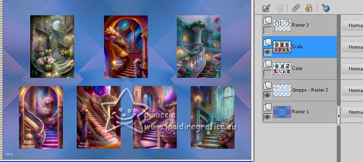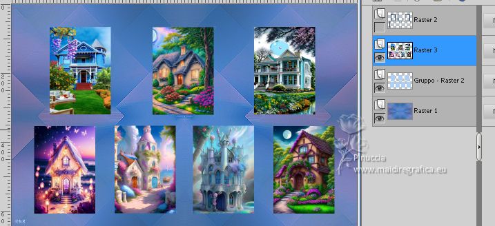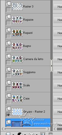 qui puoi trovare qualche risposta ai tuoi dubbi. Se l'argomento che ti interessa non è presente, ti prego di segnalarmelo. Questo tutorial è stato realizzato con PSP2019 e tradotto con PSPX7, ma può essere realizzato anche con le altre versioni di PSP. Dalla versione X4, il comando Immagine>Rifletti è stato sostituito con Immagine>Capovolgi in orizzontale, e il comando Immagine>Capovolgi con Immagine>Capovolgi in verticale. Nelle versioni X5 e X6, le funzioni sono state migliorate rendendo disponibile il menu Oggetti. Con la nuova versione X7, sono tornati Rifletti>Capovolgi, ma con nuove varianti. Vedi la scheda sull'argomento qui Grazie ai creatori dei tubes che mettono a disposizione il loro lavoro in vari gruppi di condivisione. Rispetta il lavoro degli autori, non cambiare il nome del file e non cancellare il watermark. traduzione francese qui traduzione inglese qui Le vostre versioni qui![]() Occorrente: Per il tube dei fiori grazie Lady Valella. (in questa pagina trovi i links ai siti dei creatori di tubes) Filtri: in caso di dubbi, ricorda di consultare la mia sezione filtri qui Mehdi - Sorting Tiles qui AAA Frames - Foto Frame qui Animation Shop qui ![]() non esitare a cambiare modalità di miscelatura e opacità secondo i colori utilizzati. ![]() Apri la maschera in PSP e minimizzala con il resto del materiale. 1. Scegli due colori dalle tue immagini imposta il colore di primo piano con il colore chiaro, per l'esempio #add0f8 e il colore di sfondo con il colore scuro, per l'esempio #203e64. ![]() Apri una nuova immagine trasparente 1000 x 650 pixels, e riempila con il colore scuro.Livelli>Nuovo livello raster. Selezione>Seleziona tutto. Apri il tube di sfondo 0a2db ![]() Modifica>Copia. Torna al tuo lavoro e vai a Modifica>Incolla nella selezione. Selezione>Deseleziona. Effetti>Effetti di immagine>Motivo unico, con i settaggi standard. ![]() Regola>Sfocatura>Sfocatura radiale. ![]() 2. Effetti>Plugins>Mehdi - Sorting Tiles. ![]() Effetti>Effetti di bordo>Aumenta di più. Effetti>Effetti di riflesso>Specchio rotante ![]() Effetti>Effetti di riflesso>Specchio rotante ![]() Regola>Messa a fuoco>Metti a fuoco. Livelli>Unisci>Unisci giù. 3. Livelli>Nuovo livello raster. Riempi il livello con il colore chiaro.Livelli>Nuovo livello maschera>Da immagine. Apri il menu sotto la finestra di origine e vedrai la lista dei files aperti. Seleziona la maschera maske114©ILR ![]() Effetti>Effetti di bordo>Aumenta di più. Livelli>Unisci>Unisci gruppo. Attiva lo strumento Bacchetta magica ![]() e clicca nei rettangoli per selezionarli. ![]() Selezione>Modifica>Espandi - 10 pixels. Livelli>Nuovo livello raster. Riempi la selezione con il colore scuro.4. Selezione>Modifica>Contrai - 5 pixels. Riempi con il colore chiaro.Selezione>Modifica>Contrai - 5 pixels. Riempi con il colore scuro.Selezione>Modifica>Contrai - 5 pixels. Effetti>Effetti 3D>Ritaglio, con un colore molto scuro, non nero ![]() Selezione>Deseleziona. Chiudi questo livello. 5. Attiva il livello sottostante della maschera. Seleziona il rettangolo in alto a sinistra con la bacchetta magica ![]() Livelli>Nuovo livello raster, Raster 3. Apri l'immagine della tua prima casa (Cartella Häuser). Modifica>Copia. Torna al tuo lavoro e vai a Modifica>Incolla nella selezione. Selezione>Deseleziona. ****Attiva nuovamente il livello della maschera Seleziona il secondo rettangolo con la bacchetta magica ![]() Attiva il livello soprastante, Raster 3. Copia/incolla nella selezione l'immagine della seconda casa. Selezione>Deseleziona.**** Ripeti da **** a **** con gli altri rettangoli, non dimenticare di attivare il livello della maschera per selezionare il rettangolo, e attivare il livello soprastante Raster 3 per incollare le immagini sullo stesso livello. ![]() Rinomina questo livello Case e chiudilo. 6. ****Attiva nuovamente il livello della maschera. clicca di nuovo nel rettangolo in alto a sinistra. Livelli>Nuovo livello raster, rinomina il livello "scale". Copia una delle immagini delle scale (cartella Treppenhaus). Torna al tuo lavoro e vai a Modifica>Incolla nella selezione. Selezione>Deseleziona.*** Ripeti da *** a *** con gli altri rettangoli. ![]() Chiudi questo livello. 7. Attiva nuovamente il livello della maschera. Ora ripeti tutto questo con le immagini delle cartelle: Soggiorno (cartella Wohnzimmer), Camera da letto (cartella Schlafzimmer), Bagno (cartella Badezimmer), Ragazzi (cartella Jungen). Ragazze (cartella Mädchen), Alla fine i tuoi livelli dovrebbero somigliare a questi: ![]() Attiva il livello Raster 1. Modifica>Copia Immagine>Dimensioni tela - 1100 x 750 pixels. ![]() 8. Livelli>Nuovo livello raster. Livelli>Disponi>Sposta giù. Selezione>Seleziona tutto. Modifica>Incolla nella selezione. Selezione>Deseleziona. Attiva il livello Raster 1. Livelli>Unisci>Unisci giù. Effetti>Plugins>AAA Frames - Foto Frame. ![]() Ripeti Effetti>Plugins>AAA Frames - Foto Frame, width 30. ![]() Ripeti Effetti>Plugins>AAA Frames - Foto Frame, width 10. ![]() 9. Attiva il livello superiore. Apri il files con i testi Text ![]() Copia/Incolla come nuovo livello ogni testo. Sposta il testo in alto![]() Rinomina i livelli "testo casa", "testo scale" ecc.ecc. e chiudili. 10. Attiva il livello superiore. Apri bouquetFiori6-LV16 ![]() Cancella il watermark e vai a Modifica>Copia. Torna al tuo lavoro e vai a Modifica>Incolla come nuovo livello. Immagine>Ridimensiona, al 70%, tutti i livelli non selezionato. Sposta il tube nell'angolo in basso a sinistra.Effetti>Effetti 3D>Sfalsa ombra. ![]() Livelli>Duplica. Immagine>Rifletti. Livelli>Unisci>Unisci giù. Livelli>Duplica. Immagine>Capovolgi. Livelli>Unisci>Unisci giù. 11. Attiva il livello inferiore. Livelli>Nuovo livello raster. Selezione>Seleziona tutto. Attiva nuovamente l'immagine di sfondo 0a2db e vai a Modifica>Copia. Torna al tuo lavoro e vai a Modifica>Incolla nella selezione. Selezione>Deseleziona. Effetti>Effetti di riflesso>Specchio rotante. ![]() Attiva nuovamente il livello superiore.
