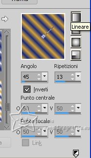 qui puoi trovare qualche risposta ai tuoi dubbi. Se l'argomento che ti interessa non è presente, ti prego di segnalarmelo. Questo tutorial è stato realizzato con PSP2019 e tradotto con PSPX7, ma può essere realizzato anche con le altre versioni di PSP. Dalla versione X4, il comando Immagine>Rifletti è stato sostituito con Immagine>Capovolgi in orizzontale, e il comando Immagine>Capovolgi con Immagine>Capovolgi in verticale. Nelle versioni X5 e X6, le funzioni sono state migliorate rendendo disponibile il menu Oggetti. Con la nuova versione X7, sono tornati Rifletti>Capovolgi, ma con nuove varianti. Vedi la scheda sull'argomento qui Grazie ai creatori dei tubes che mettono a disposizione il loro lavoro in vari gruppi di condivisione. Rispetta il lavoro degli autori, non cambiare il nome del file e non cancellare il watermark. traduzione francese qui traduzione inglese qui Le vostre versioni qui![]() Occorrente: Un tube a scelta (il tube usato da Inge-Lore è sotto licenza) Il resto del materiale qui Per i tubes accessori grazie Louise Pause e per le maschere grazie Narah. Per il tube usato nel mio esempio grazie Colybrix. (in questa pagina trovi i links ai siti dei creatori di tubes) Filtri: in caso di dubbi, ricorda di consultare la mia sezione filtri qui Filters Unlimited 2.0 qui Mehdi - Sorting Tiles qui Mura's Seamless - Emboss at Alpha qui AAA Frames - Foto Frame qui Alien Skin Eye Candy 5 Impact - Glass qui I filtri Mura's Seamless si possono usare da soli o importati in Filters Unlimited (come fare vedi qui) Se un filtro fornito appare con questa icona ![]() non esitare a cambiare modalità di miscelatura e opacità secondo i colori utilizzati. Nelle ultime versioni di PSP non c'é il gradiente di primo piano/sfondo (Corel_06_029) Puoi usare i gradienti delle versioni precedenti. Trovi qui i gradienti Corel X. ![]() Apri le maschere in PSP e minimizzale con il resto del materiale. 1. Scegli due colori dalle tue immagini e imposta il colore di primo piano con il colore scuro, per me #1c2870, e il colore di sfondo con il colore chiaro, per me #d2a23e ![]() Passa il colore di primo piano a Gradiente di primo piano/sfondo, stile Sprazzo di luce. ![]() Apri una nuova immagine trasparente 1000 x 650 pixels, e riempila con il gradiente.Effetti>Plugins>Mehdi - Sorting Tiles. ![]() Effetti>Effetti di riflesso>Specchio rotante, con i settaggi standard. ![]() Effetti>Effetti di riflesso>Specchio rotante. ![]() Effetti>Effetti di bordo>Aumenta di più. 2. Livelli>Nuovo livello raster. Riempi il livello con il colore chiaro di sfondo.Livelli>Nuovo livello maschera>Da immagine. Apri il menu sotto la finestra di origine e vedrai la lista dei files aperti. Seleziona la maschera Narah_Mask_1136 ![]() Effetti>Effetti di bordo>Aumenta. Livelli>Unisci>Unisci gruppo. Attiva lo strumento Selezione ![]() (non importa il tipo di selezione impostato, perché con la selezione personalizzata si ottiene sempre un rettangolo) clicca sull'icona Selezione personalizzata ![]() e imposta i seguenti settaggi. ![]() Premi sulla tastiera il tasto CANC ![]() Livelli>Nuovo livello raster. Riempi il livello con il gradiente.Livelli>Nuovo livello raster. Apri il primo tube di sfondo paper(7) ![]() Modifica>Copia. Torna al tuo lavoro e vai a Modifica>Incolla nella selezione. 3. Livelli>Nuovo livello raster. Effetti>Effetti 3D>Ritaglio. ![]() Selezione>Deseleziona. Livelli>Unisci>Unisci giù - 2 volte. Selezione personalizzata ![]() ![]() Cambia i settaggi del Gradiente, stile Lineare. ![]() Livelli>Nuovo livello raster. Riempi la selezione con il gradiente.Selezione>Modifica>Contrai - 27 pixels. Premi sulla tastiera il tasto CANC ![]() 4. Selezione>Modifica>Seleziona bordature selezione. ![]() Effetti>Effetti 3D>Smusso a incasso. ![]() Selezione>Deseleziona. Attiva lo strumento Bacchetta magica ![]() e clicca all'interno della cornice per selezionarla. Effetti>Plugins>Alien Skin Eye Candy 5 Impact – Glass seleziona il preset Clear e ok. ![]() Selezione>Deseleziona. Livelli>Duplica. Tasto K per attivare lo strumento Puntatore ![]() e imposta Posizione X: 503,00 e Posizione Y: 322,00. ![]() Attiva il livello Raster 3. ![]() Livelli>Unisci>Unisci giù. Effetti>Effetti 3D>Sfalsa ombra. ![]() 5. Attiva il livello sottostante della maschera. Selezione personalizzata ![]() ![]() Premi sulla tastiera il tasto CANC. Livelli>Nuovo livello raster. Livelli>Disponi>Sposta su. Imposta nuovamente il gradiente Sprazzo di luce. ![]() Riempi la selezione con il gradiente.Livelli>Nuovo livello raster. Apri il tuo secondo tube di sfondo paper (4) ![]() Modifica>Copia. Torna al tuo lavoro e vai a Modifica>Incolla nella selezione. Regola>Messa a fuoco>Metti a fuoco. 6. Livelli>Nuovo livello raster. Effetti>Effetti 3D>Ritaglio, con i settaggi precedenti. ![]() Selezione>Deseleziona. Attiva il livello superiore. ![]() Livelli>Unisci>Unisci giù - 3 volte. ![]() Effetti>Effetti 3D>Sfalsa ombra. ![]() 7. Attiva il livello della maschera. Effetti>Plugins>Mura's Seamless - Emboss at Alpha, con i settaggi standard. ![]() Effetti>Effetti 3D>Sfalsa ombra. ![]() Attiva il livello superiore. Apri il tube #365- Tube Egypt-Muse–louisepausepsp20207 ![]() Modifica>Copia. Torna al tuo lavoro e vai a Modifica>Incolla come nuovo livello. Immagine>Ridimensiona, al 60%, tutti i livelli non selezionato. Regola>Messa a fuoco>Metti a fuoco. Sposta il tube in alto a destra.Effetti>Effetti 3D>Sfalsa ombra. ![]() 8. Apri il tube #363- Tube Egypt- statue–louisepausepsp20207 ![]() Modifica>Copia. Torna al tuo lavoro e vai a Modifica>Incolla come nuovo livello. Immagine>Ridimensiona, al 60%, tutti i livelli non selezionato. Regola>Messa a fuoco>Metti a fuoco. Effetti>Effetti 3D>Sfalsa ombra, con i settaggi precedenti. Sposta il tube in basso a sinistra.Imposta il colore di primo piano con il colore bianco. Livelli>Nuovo livello raster. Riempi il livello con il colore bianco #ffffff.Livelli>Nuovo livello maschera>Da immagine. Apri il menu sotto la finestra di ori