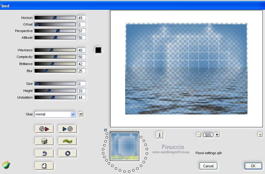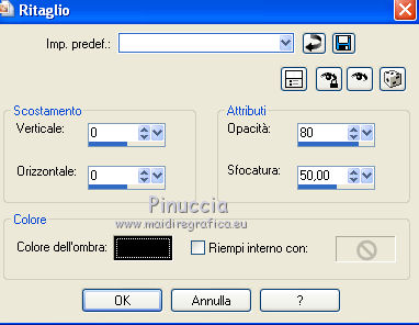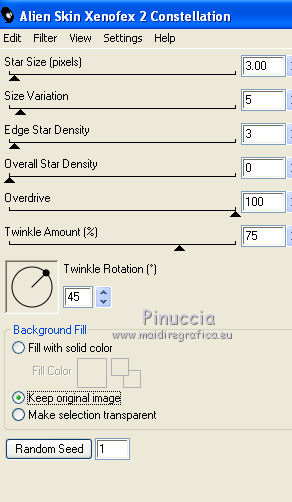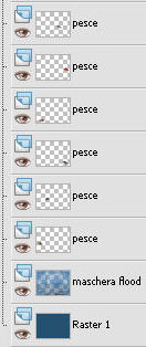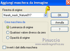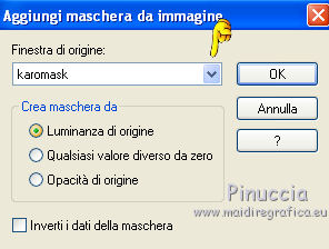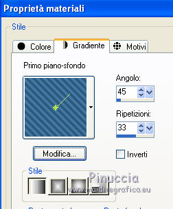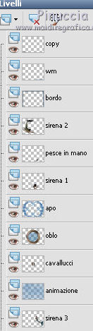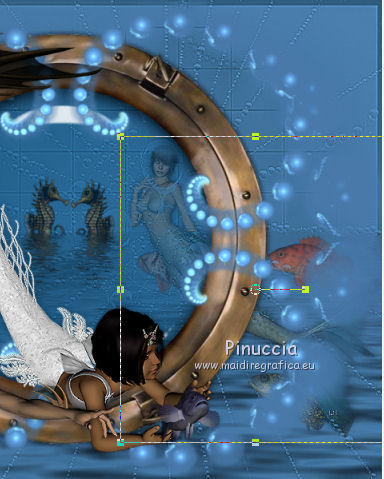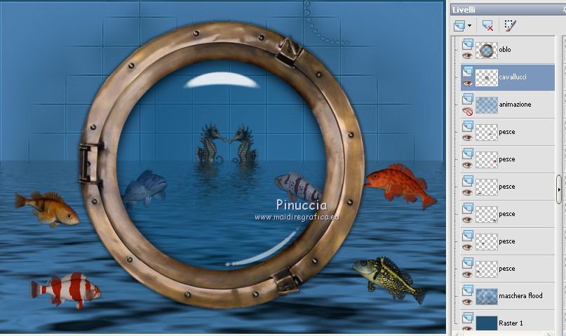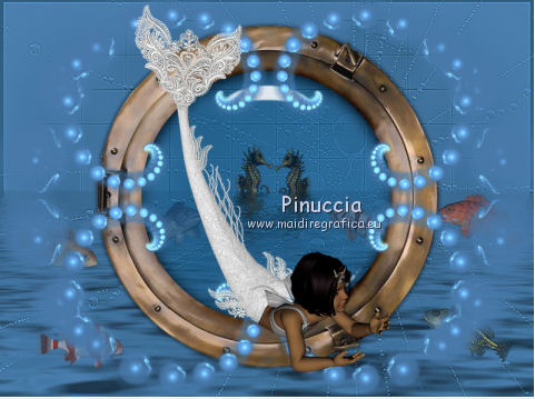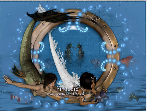 qui puoi trovare qualche risposta ai tuoi dubbi. Se l'argomento che ti interessa non è presente, ti prego di segnalarmelo. Questo tutorial è stato creato con PSP X2, ma può essere eseguito anche con le altre versioni di PSP. Per tradurlo, ho usato PSP X. Grazie ai creatori dei tubes che mettono a disposizione il loro lavoro in vari gruppi di condivisione. Rispetta il lavoro degli autori, non cambiare il nome del file e non cancellare il watermark. Occorrente: Materiale qui Per i poser usati grazie Lili Filtri: Flaming Pear - Flood qui Xero - Improver qui Alien Skin Xenofex 2.0 - Constellation qui Animation Shop qui Apri le maschere in PSP e minimizzale con il resto del materiale. 1. Scegli due colori dai tuoi tubes di tonalità blu. Imposta il colore di primo piano con il colore chiaro, e il colore di sfondo con il colore scuro. Apri una nuova immagine trasparente 800 x 600 pixels, e riempila con il colore di sfondo.Livelli>Nuovo livello raster. Riempi con il colore di primo piano.Livelli>Nuovo livello maschera>Da immagine. Apri il menu sotto la finestra di origine e vedrai la lista dei files aperti. Seleziona la maschera "karomask". ![]() Livelli>Unisci>Unisci gruppo. Effetti>Effetti di bordo>Aumenta. Effetti>Plugins>Flaming Pear - Flood. ![]() Livelli>Nuovo livelloi raster. Riempi ancora con il colore di primo piano.Livelli>Nuovo livello maschera>Da immagine. Apri il menu sotto la finestra di origine e seleziona la maschera "narah_mask_nature017". ![]() Livelli>Unisci>Unisci gruppo. Effetti>Effetti di bordo>Aumenta. Abbassa l'opacità di questo livello al 75%. Chiudi momentaneamente il livello. 2. Apri "bullauge" e vai a Modifica>Copia. Torna al tuo lavoro e vai a Modifica>Incolla come nuovo livello. Lascialo al centro dell'immagine. Apri "fische-24-3-11-verkleinert", che è composto da vari livelli (ogni pesce sul suo livello). Copia e incolla sul tuo lavoro i pesci che preferisci, e posizionali a tuo piacimento,portando tutti i livelli sotto il livello "animazione". Attiva il livello dei cavallucci marini. Portalo sotto il livello dell'oblò. Effetti>Plugins>Flaming Pear - Flood, con i settaggi precedenti. Dovresti avere questo. ![]() Apri il livello della maschera, e attiva il livello superiore. Apri "Apo-174-bd-4-4-12" e vai a Modifica>Copia. Torna al tuo lavoro e vai a Modifica>Incolla come nuovo livello. Lascialo come sta. Apri "lace-4_lill" e vai a Modifica>Copia. Torna al tuo lavoro e vai a Modifica>Incolla come nuovo livello. Immagine>Ridimensiona, al 70%, tutti i livelli non selezionato. Posiziona il tube come nell'esempio.![]() Attiva lo strumento Gomma ![]() e cancella la parte della pinna che copre la cornice dell'oblò. ![]() Effetti>Plugins>Xero - Improver - clicca su Landscape e ok. Effetti>Effetti 3D>Sfalsa ombra. ![]() Apri nuovamente il tube con i pesci. Copia e incolla sul tuo lavoro un pesce, e posizionalo tra le mani della sirena.![]() 3. Apri il tube "meermaid-miki-4.11.7" e vai a Modifica>Copia. Torna al tuo lavoro e vai a Modifica>Incolla come nuovo livello. Immagine>Ridimensiona, al 70%, tutti i livelli non selezionato. Spostalo a sinistra.![]() Effetti>Effetti 3D>Sfalsa ombra, con i settaggi precedenti. Effetti>Plugins>Xero - Improver, con i settaggi precedenti. Apri "v3-nixe-31712-la-3" e vai a Modifica>Copia. Torna al tuo lavoro e vai a Modifica>Incolla come nuovo livello. Immagine>Ridimensiona, al 50%, tutti i livelli non selezionato. Effetti>Plugins>Xero - Improver, con i settaggi precedenti. Effetti>Effetti 3D>Sfalsa ombra, con i settaggi precedenti. Nella paletta dei livelli porta questo livello sotto il livello "animazione", e sposta il tube come nell'esempio.(eventualmente premi il tasto D per attivare lo strumento Deformazione e facilitare lo spostamento). ![]() 4. Attiva il livello della prima maschera (il secondo livello dal basso). Selezione>Seleziona tutto. Selezione>Modifica>Contrai - 10 pixels. ![]() Selezione>Inverti. Modifica>Copia Unione. Attiva il livello superiore. Modifica>Incolla come nuovo livello. Passa il colore di primo piano a Gradiente, stile lineare. ![]() Riempi la selezione con il gradiente.Selezione>Inverti. Effetti>Effetti 3D>Ritaglio. ![]() Selezione>Deseleziona. Aggiungi il tuo nome e/o il tuo watermark, senza dimenticare eventuali copyright delle immagini usate. Questa dovrebbe essere la tua paletta dei livelli. ![]() ![]() 5. Animazione. Attiva il livello "animazione". Effetti>Plugins>Alien Skin Xenofex 2.0 - Constellation. ![]() Modifica>Copia Unione. Apri Animation Shop e vai a Modifica>Incolla>Incolla come nuova animazione. Torna in PSP. Modifica>Annulla azione Constellation. Effetti>Plugins>Alien Skin Xenofex 2.0 - Constellation, clicca su Random Seed e ok. Modifica>Copia Unione. Torna in Animation Shop e vai a Modifica>Incolla>Incolla dopo il fotogramma corrente. Di nuovo in PSP. Modifica>Annulla azione Constellation. Effetti>Plugins>Alien Skin Xenofex 2.0 - Constellation, clicca su Random Seed e ok. Modifica>Copia Unione. In Animation Shop: Modifica>Incolla>Incolla dopo il fotogramma corrente. Controlla il risultato cliccando su Visualizza e salva in formato gif.![]() Se hai problemi o dubbi, o trovi un link non funzionante, o anche soltanto per un saluto, scrivimi. 11 Settembre 2012 |