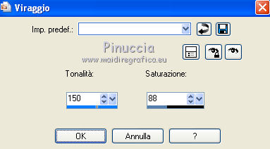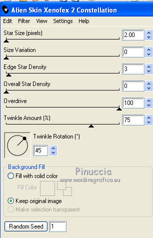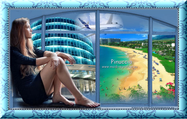 qui puoi trovare qualche risposta ai tuoi dubbi. Se l'argomento che ti interessa non è presente, ti prego di segnalarmelo. Questo tutorial è stato creato con PSP X2, ma può essere eseguito anche con le altre versioni di PSP. Per tradurlo, ho usato PSP X. Il materiale viene da vari gruppi di condivisione. Il copyright appartiene ai rispettivi autori. Grazie ai creatori dei tubes che mettono a disposizione il loro lavoro in vari gruppi di condivisione. Rispetta il lavoro degli autori, non cambiare il nome del file e non cancellare il watermark. Occorrente: Materiale qui Filtri: Filters Unlimited qui Alien Skin Xenofex 2.0 - Constellation qui Ti servirà anche Animation Shop qui ![]() Apri tutto il materiale in PSP, compresa la maschera. 1. Scegli due colori dal tuo tube di sfondo, e imposta il colore chiaro come colore di primo piano, e il colore scuro come colore di sfondo. Apri una nuova immagine trasparente 1000 x 600 pixels, e riempila con il colore scuro.Apri "DSC_6976 image 290909" e vai a Modifica>Copia. Torna al tuo lavoro e vai a Modifica>Incolla come nuovo livello. Sposta il tube a sinistra, contro il bordo.Apri "tube.mist_melizaM_05_sept09" e vai a Modifica>Copia. Torna al tuo lavoro e vai a Modifica>Incolla come nuovo livello. Immagine>Rifletti. Sposta il tube a destra.![]() 2. Livelli>Nuovo livello raster. Riempi con il colore chiaro.Livelli>Nuovo livello raster. Selezione>Seleziona tutto. Apri "fenster-1-bd-1-7-09". Attiva il livello "fenster" e vai a Modifica>Copia. Torna al tuo lavoro e vai a Modifica>Incolla nella selezione. Attiva lo strumento Bacchetta magica , modalità Aggiungi,e clicca sui riquadri della finestra per selezionarli. Selezione>Modifica>Espandi - 5 pixels. ![]() Attiva il livello sottostante e premi sulla tastiera il tasto CANC. Selezione>Deseleziona. Attiva il livello superiore della finestra. Prendi nota dei valori di Tonalità (H) e Saturazione (S) del tuo colore scuro. I miei. ![]() Regola>Tonalità e saturazione>Viraggio e trascrivi i valori annotati nelle rispettive caselle. ![]() 3. Attiva lo strumento Selezione , rettangolo,e traccia una selezione come nell'esempio. ![]() Attiva il livello con il paesaggio e premi sulla tastiera il tasto CANC. Selezione>Deseleziona. Attiva nuovamente il livello superiore. Apri "womanence-airbus" e vai a Modifica>Copia. Torna al tuo lavoro e vai a Modifica>Incolla come nuovo livello. Immagine>Ridimensiona, al 60%. tutti i livelli non selezionato. ![]() Spostalo in alto sul bordo della finestra.Livelli>Disponi>Sposta giù - 2 volte. Attiva nuovamente il livello superiore. Apri "170-woman-LB tubes" e vai a Modifica>Copia. Torna al tuo lavoro e vai a Modifica>Incolla come nuovo livello. Attiva lo strumento Gomma ![]() e cancella le ombre intorno alla donna. ![]() Alla fine dovresti avere questo. ![]() Sposta il tube a sinistra, contro il bordo.Regola>Messa a fuoco>Metti a fuoco. 4. Attiva il livello inferiore. Selezione>Seleziona tutto. Immagine>Ritaglia la selezione. Selezione>Seleziona tutto. Livelli>Nuovo livello raster. Immagine>Dimensione tela. ![]() Selezione>Inverti. Riempi il livello con il colore chiaro.Livelli>Nuovo livello raster. Riempi con il colore scuro.Livelli>Nuovo livello maschera>Da immagine. Apri il menu sotto la finestra di origine e vedrai la lista dei files aperti. Seleziona la maschera maske-muster-2-bd-3-2-10, con i seguenti settaggi. ![]() Livelli>Unisci>Unisci gruppo. Livelli>Unisci>Unisci giù. Effetti>Effetti 3D>Sfalsa ombra. ![]() Ripeti l'Effetto Sfalsa ombra, cambiando verticale e orizzontale con -10. Effetti>Plugins>Filters Unlimited 2.0 - Buttons & Frames - 3D Glass Frame, con i settaggi standard. ![]() Selezione>Deselezione. Livelli>Disponi>Porta in alto. Aggiungi il tuo nome e/o il tuo watermark su un nuovo livello. Livelli>Unisci>Unisci tutto. Immagine>Ridimensiona, a 800 pixels di larghezza, tutti i livelli selezionato. Regola>Messa a fuoco>Metti a fuoco. 5. Attiva lo strumento Selezione , rettangolo,e seleziona l'immagine escludendo la cornice. ![]() Effetti>Plugins>Alien Skin Xenofex 2.0 - Constellation. ![]() Selezione>Deseleziona. Modifica>Copia Unione. Apri Animation Shop e vai a Modifica>Incolla>Incolla come nuova animazione. Torna in PSP. Modifica>Annulla azione Deseleziona. Modifica>Annulla azione Constellation. Ripeti l'Effetto Constellation, cliccando su Random Seed. Selezione>Deseleziona. Modifica>Copia Unione. Torna in Animation Shop e vai a Modifica>Incolla>Incolla dopo il fotogramma corrente. Di nuovo in PSP. Modifica>Annulla azione Deseleziona. Modifica>Annulla azione Constellation. Ripeti l'Effetto Constellation, cliccando su Random Seed. Selezione>Deseleziona. Modifica>Copia Unione. In Animation Shop: Modifica>Incolla>Incolla dopo il fotogramma corrente. Torna ancora una volta in PSP. Apri il file text (se preferisci, puoi scrivere un tuo testo) e vai a Modifica>Copia. Torna al tuo lavoro e vai a Modifica>Incolla come nuovo livello. Modifica>Copia. In Animation Shop: Modifica>Incolla>Incolla come nuova animazione. Modifica>Duplica, e ripeti, e avrai così 3 fotogrammi. Modifica>Seleziona tutto. Modifica>Copia. Attiva il tuo lavoro. Clicca sul primo fotogramma per selezionarlo e vai a Modifica>Seleziona tutto. Modifica>Incolla>Incolla nel fotogramma selezionato. Posiziona il testo e, quando sei certo di aver trovato la posizione corretta, rilascia il tasto del mouse. Controlla il risultato cliccando su Visualizza e salva in formato gif.![]() Se hai problemi o dubbi, o trovi un link non funzionante, o vuoi soltanto dirmi che questo tutorial ti è piaciuto, scrivimi. 9 Ottobre 2010 |