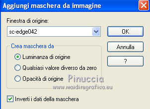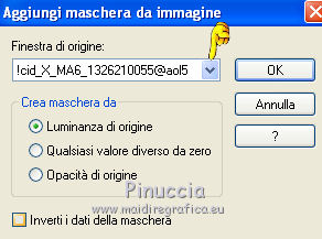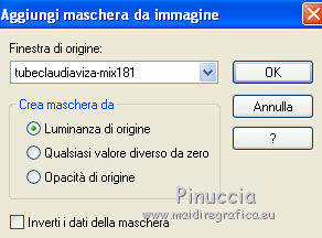 qui puoi trovare qualche risposta ai tuoi dubbi. Se l'argomento che ti interessa non è presente, ti prego di segnalarmelo. Questo tutorial è stato creato con PSP X2 e tradotto con PSPX, ma può essere eseguito anche con le altre versioni di PSP. Secondo la versione utilizzata, potresti ottenere risultati differenti. Dalla versione X4, il comando Immagine>Rifletti è stato sostituito con Immagine>Capovolgi in orizzontale, e il comando Immagine>Capovolgi con Immagine>Capovolgi in verticale. Nelle versioni X5 e X6, le funzioni sono state migliorate rendendo disponibile il menu Oggetti. Con la nuova versione X7, sono tornati Rifletti>Capovolgi, ma con nuove varianti. Vedi la scheda sull'argomento qui traduzione in francese/traduction en français qui/ici le vostre versioni/vos versions qui/ici Occorrente: Tube a scelta. Il resto del materiale qui Per il poser utilizzato grazie Belle Graphics Filtri: in caso di dubbi, ricorda di consultare la mia sezione filtri qui Filters Unlimited 2.0 qui Penta.com - Color dot qui Alien Skin Xenofex 2.0 - Constellation qui I filtri Penta.com si possono usare da soli o importati in Filters Unlimited (come fare vedi qui) Se un filtro fornito appare con questa icona Animation Shop qui ![]() Apri le maschere in PSP e minimizzale con il resto del materiale. 1. Scegli dai tuoi tubes un colore chiaro per il colore di primo piano, e un colore scuro per il colore di sfondo. Apri una nuova immagine trasparente 900 x 600 pixels, e riempila con il colore di sfondo.Livelli>Nuovo livello raster. Riempi con il colore di primo piano.Livelli>Nuovo livello maschera>Da immagine. Apri il menu sotto la finestra di origine e vedrai la lista dei files aperti. Seleziona la maschera "!cid_X_1326210055@", con i seguenti settaggi. ![]() Livelli>Unisci>Unisci gruppo. Effetti>Effetti di bordo>Aumenta. 2. Livelli>Nuovo livello raster. Riempi con il colore di primo piano.Livelli>Nuovo livello maschera>Da immagine. Apri il menu sotto la finestra di origine, e seleziona "tubeclaudiaviza-mix181". ![]() Livelli>Unisci>Unisci gruppo. Effetti>Effetti di bordo>Aumenta. Effetti>Effetti 3D>Sfalsa ombra. ![]() Apri il tube "tubeclaudiaviza-mix190" e vai a Modifica>Copia. Torna al tuo lavoro e vai a Modifica>Incolla come nuovo livello. Immagine>Ridimensiona, al 70%, tutti i livelli non selezionato. Effetti>Effetti 3D>Sfalsa ombra. ![]() Sposta il tube nell'angolo in basso a sinistra.3. Livelli>Unisci>Unisci tutto. Immagine>Aggiungi bordatura, 2 pixels, simmetriche, con il colore di primo piano. Livelli>Innalza livello di sfondo. Livelli>Duplica. Immagine>Ridimensiona, al 90%, tutti i livelli non selezionato. Selezione>Seleziona tutto. Selezione>Mobile. Selezione>Immobilizza. Effetti>Effetti 3D>Sfalsa ombra. ![]() Ripeti l'Effetto Sfalsa ombra, cambiando verticale e orizzontale con -5. Selezione>Deseleziona. Livelli>Duplica. Immagine>Ridimensiona, al 90%, tutti i livelli non selezionato. Livelli>Duplica. Immagine>Ridimensiona, al 90%, tutti i livelli non selezionato. 4. Attiva il livello inferiore. Regola>Sfocatura>Sfocatura radiale. ![]() Effetti>Plugins>Penta.com - Color dot, con i settaggi standard. ![]() Selezione>Seleziona tutto. Attiva il livello superiore. Immagine>Dimensioni tela. ![]() Selezione>Inverti. Livelli>Nuovo livello raster. Riempi con il colore di sfondo.Livelli>Nuovo livello raster. Riempi nuovamente con il colore di sfondo.Livelli>Nuovo livello raster. Riempi con il colore di primo piano.Livelli>Nuovo livello maschera>Da immagine. Apri il menu sotto la finestra di origine e seleziona la maschera "sc-edge042". ![]() Livelli>Unisci>Unisci gruppo. Effetti>Effetti di bordo>Aumenta. Effetti>Effetti 3D>Sfalsa ombra. ![]() Effetti>Effetti 3D>Smusso a incasso. ![]() Selezione>Deseleziona. 5. Apri il tuo tube e vai a Modifica>Copia. Torna al tuo lavoro e vai a Modifica>Incolla come nuovo livello. Immagine>Ridimensiona, se e quanto necessario. Spostalo a destra.Regola>Messa a fuoco>Metti a fuoco. Effetti>Effetti 3D>Sfalsa ombra. ![]() Aggiungi il tuo nome e/o il tuo watermark su un nuovo livello, senza dimenticare eventuali copyright delle immagini usate. Immagine>Ridimensiona, a 900 pixels di larghezza, tutti i livelli selezionato. 6. Io ho spostato il livello del tube sopra i livelli di sfondo. Attiva il livello superiore dei tre livelli di sfondo. ![]() Effetti>Plugins>Alien Skin Xenofex 2.0 - Constellation. ![]() Modifica>Copia Unione. Apri Animation Shop e vai a Modifica>Incolla>Incolla come nuova animazione. Torna in PSP. Modifica>Annulla azione Constellation. Effetti>Plugins>Alien Skin Xenofex 2.0 - Constellation, clicca su Random Seed e ok. Modifica>Copia Unione. In Animation Shop: Modifica>Incolla>Incolla dopo il fotogramma corrente. Di nuovo in PSP. Modifica>Annulla azione Constellation. Effetti>Plugins>Alien Skin Xenofex 2.0 - Constellation, clicca su Random Seed e ok. Modifica>Copia Unione. In Animation Shop: Modifica>Incolla>Incolla dopo il fotogramma corrente. Controlla il risultato cliccando su Visualizza e salva in formato gif.Il tube di questa versione è di LisaT. ![]() ![]() Se hai problemi o dubbi, o trovi un link non funzionante, o anche soltanto per un saluto, scrivimi. 2 Marzo 2012 |