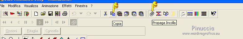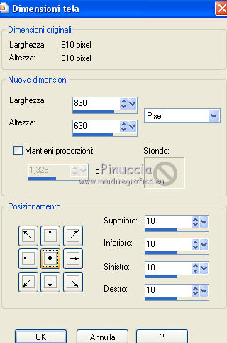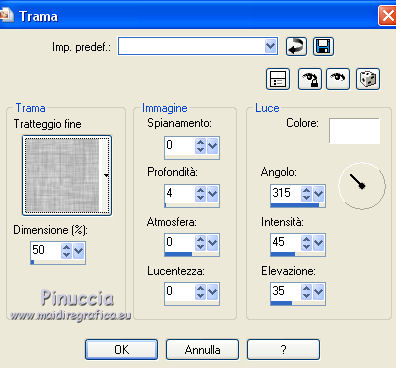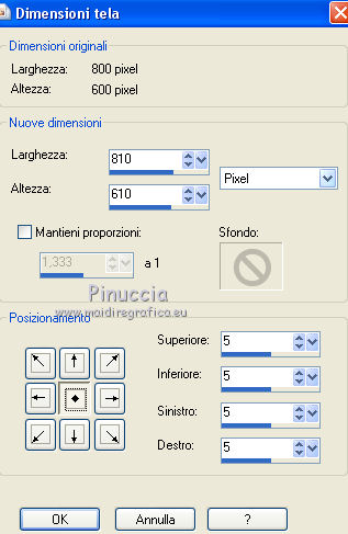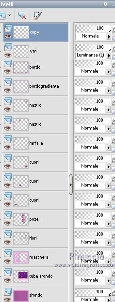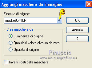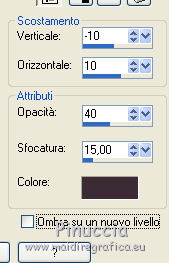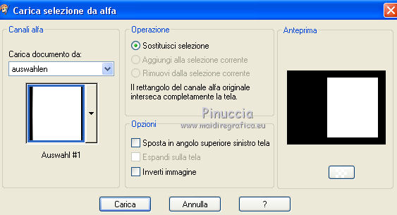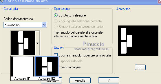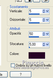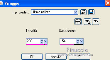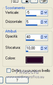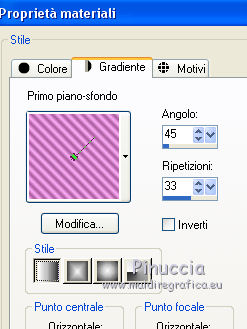 qui puoi trovare qualche risposta ai tuoi dubbi. Se l'argomento che ti interessa non è presente, ti prego di segnalarmelo. Questo tutorial è stato creato con PSP X5 e tradotto con PSP X, ma può essere eseguito anche con le altre versioni di PSP. Secondo la versione utilizzata, potresti ottenere risultati differenti. Dalla versione X4, il comando Immagine>Rifletti è stato sostituito con Immagine>Capovolgi in orizzontale, e il comando Immagine>Capovolgi con Immagine>Capovolgi in verticale. Nelle versioni X5 e X6, le funzioni sono state migliorate rendendo disponibile il menu Oggetti. Con la nuova versione X7, sono tornati Rifletti>Capovolgi, ma con nuove varianti. Vedi la scheda sull'argomento qui Le vostre versioni/vos versions qui/ici Occorrente: Tubes a scelta: immagine di sfondo, personaggio e decorazioni in tema. Il resto del materiale qui Per il poser e l'immagine di sfondo grazie Gerda (in questa pagina trovi i links ai siti degli autori) Filtri: in caso di dubbi, ricorda di consultare la mia sezione filtri qui Xero - Improver qui Animation Shop qui ![]() La trama Corel_15_021 è standard nelle versioni più recenti di PSP e corrisponde alla trama standard delle precedenti versioni Tratteggio fine. Se non la trovi nel tuo PSP, metti quella fornita nella cartella Trame. Apri la maschera in PSP e minimizzala con il resto del materiale, tranne l'animazione herzen-Ani-lila che userai in Animation Shop. Per colorizzare gli elementi dello scrap puoi usare i valori di tonalità e saturazione del tuo colore scuro. Regola>Tonalità e Saturazione>Viraggio. ![]() Oppure, come nel mio esempio, lo strumento Trasforma in destinazione ![]() 1. Scegli dal tuo materiale un colore luminoso e impostalo come colore di primo piano. Imposta il colore di sfondo con un colore scuro. I miei colori. ![]() Apri Auswahlen. L'immagine, che sarà la base del tuo lavoro, non è vuota, ma contiene le selezioni salvate sul canale alfa. Riempi l'immagine trasparente con il colore scuro di sfondo.Effetti>Effetti di trama>Trama - seleziona la trama Tratteggio fine (Corel_15_21), con i seguenti settaggi. ![]() Livelli>Nuovo livello raster. Riempi con il colore di primo piano.Livelli>Nuovo livello maschera>Da immagine. Apri il menu sotto la finestra di origine e vedrai la lista dei files aperti. Seleziona la maschera maske95©ILR. con i seguenti settaggi. ![]() Livelli>Unisci>Unisci gruppo. 2. Effetti>Effetti 3D>Sfalsa ombra, con un colore molto scuro per l'esempio #2a0526. ![]() Ripeti l'Effetto Sfalsa ombra, cambiando verticale e orizzontale con -5. Livelli>Nuovo livello raster. Selezione>Carica/Salva selezione>Carica selezione da canale alfa. La selezione Auswahl #1 è subito disponibile. Devi soltanto cliccare Carica. ![]() Apri il tuo tube di sfondo e vai a Modifica>Copia. Torna al tuo lavoro e vai a Modifica>Incolla nella selezione. Selezione>Deseleziona. (se preferisci, incolla il tuo tube come nuovo livello. Ridimensiona, se e quanto necessario, e posiziona correttamente il tube nell'area selezionata. Selezione>Inverti. Premi sulla tastiera il tasto CANC. Selezione>Deseleziona). Porta questo livello al secondo posto dal basso. Attiva nuovamente il livello superiore. 3. Apri il tuo tube e vai a Modifica>Copia. Torna al tuo lavoro e vai a Modifica>Incolla come nuovo livello. Immagine>Ridimensiona, se e quanto necessario, tutti i livelli non selezionato. Posiziona il tube a destra, o dove preferisci.Effetti>Plugins>Xero - Improver. ![]() Effetti>Effetti 3D>Sfalsa ombra, con il colore scuro. ![]() Decora il lavoro a tuo piacimento. Sui tubes aggiunti applica l'Effetto Sfalsa ombra. ![]() 4. Attiva il livello inferiore. Selezione>Carica/Salva selezione>Carica selezione da canale alfa. Apri il menu delle selezioni e carica la selezione Auswahl#2. ![]() La selezione deve trovarsi sopra i rettangoli a sinistra. Se necessario, tieni premuto il tasto destro del mouse sulla selezione, e posizionala correttamente. ![]() Effetti>Effetti 3D>Sfalsa ombra ![]() Ripeti l'Effetto Sfalsa ombra, cambiando verticale e orizzontale con -2. Selezione>Deseleziona. Questo passaggio serve per poter individuare in Animation Shop dove inserire l'animazione. Selezione>Seleziona tutto. Immagine>Dimensioni tela - 810 x 610 pixels. ![]() Livelli>Nuovo livello raster. Livelli>Disponi>Porta in alto. Selezione>Inverti. Riempi il livello con il colore di sfondo.Selezione>Seleziona tutto. Immagine>Dimensioni tela - 830 x 630 pixels. ![]() Livelli>Nuovo livello raster. Livelli>Disponi>Sposta giù. Selezione>Inverti. Passa il colore di primo piano a Gradiente di primo piano/sfondo. ![]() Riempi il livello con il gradiente.5. Selezione>Seleziona tutto. Immagine>Dimensioni tela - 840 x 640 pixels. ![]() Attiva il livello superiore. Selezione>Inverti. Riempi con il colore di sfondo.Selezione>Deseleziona. Effetti>Effetti 3D>Sfalsa ombra. ![]() Ripeti l'Effetto Sfalsa ombra, cambiando verticale e orizzontale con -10. Attiva il livello inferiore. Livelli>Nuovo livello raster. Livelli>Disponi>Porta sotto. Riempi con il colore di primo piano.Attiva il livello soprastante. Livelli>Unisci>Unisci giù. Aggiungi il tuo nome e/o il tuo watermark su un nuovo livello, senza dimenticare eventuali copyright delle immagini usate. ![]() Attiva il livello inferiore. Modifica>Copia. Apri Animation Shop e vai a Modifica>Incolla>Incolla come nuova animazione. 6. Modifica>Duplica, e ripeti finchè non avrai una animazione composta da 9 fotogrammi. Clicca sul primo fotogramma per selezionarlo e vai a Modifica>Seleziona tutto. Apri l'animazione herzen-Ani-lilla, anche questa composta da 9 fotogrammi. Modifica>Seleziona tutto. Modifica>Copia. Attiva il tuo lavoro e vai a Modifica>Incolla>Incolla nel fotogramma selezionato. Posiziona l'animazione nell'area delimitata dall'effetto ombra. ![]() Di nuovo Modifica>Incolla>Incolla nel fotogramma selezionato, e posiziona l'animazione nel rettangolo inferiore. ![]() Attiva l'animazione. Animazione>Inverti i fotogrammi Modifica>Copi