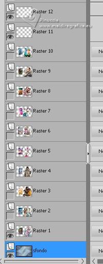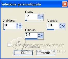 qui puoi trovare qualche risposta ai tuoi dubbi. Se l'argomento che ti interessa non è presente, ti prego di segnalarmelo. Questo tutorial è stato realizzato con PSP2019 e tradotto con PSPX7, ma può essere realizzato anche con le altre versioni di PSP. Dalla versione X4, il comando Immagine>Rifletti è stato sostituito con Immagine>Capovolgi in orizzontale, e il comando Immagine>Capovolgi con Immagine>Capovolgi in verticale. Nelle versioni X5 e X6, le funzioni sono state migliorate rendendo disponibile il menu Oggetti. Con la nuova versione X7, sono tornati Rifletti>Capovolgi, ma con nuove varianti. Vedi la scheda sull'argomento qui Grazie ai creatori dei tubes che mettono a disposizione il loro lavoro in vari gruppi di condivisione. Rispetta il lavoro degli autori, non cambiare il nome del file e non cancellare il watermark. traduzione francese qui traduzione inglese qui Le vostre versioni qui![]() Occorrente: 10 personaggi a scelta (i tubes usati da Inge-Lore sono sotto licenza) Il resto del materiale qui Per i tubes usati nel mio esempio grazie Beatriz, Riet, Cal, Lana, Renée, JHanna, Tati. (in questa pagina trovi i links ai siti dei creatori di tubes) Filtri: in caso di dubbi, ricorda di consultare la mia sezione filtri qui Mehdi - Sorting Tiles qui AAA Frames - Foto Frame qui Animation Shop qui ![]() non esitare a cambiare modalità di miscelatura e opacità secondo i colori utilizzati. ![]() Apri la maschera in PSP e minimizzala con il resto del materiale. 1. Scegli due colori dalle tue immagini questi sono i colori che ho usato ![]() Apri una nuova immagine trasparente 1000 x 650 pixels. Selezione>Seleziona tutto. Apri la tua immagine di sfondo e vai a Modifica>Copia. Torna al tuo lavoro e vai a Modifica>Incolla nella selezione. Selezione>Deseleziona. Effetti>Effetti di immagine>Motivo unico, con i settaggi standard. ![]() 2. Regola>Sfocatura>Sfocatura radiale. ![]() Effetti>Effetti di riflesso>Specchio rotante, con i settaggi standard. ![]() Effetti>Plugins>Mehdi – Sorting Tiles ![]() Effetti>Effetti di bordo>Aumenta. Effetti>Effetti di riflesso>Specchio rotante. ![]() Ancora Effetti>Effetti di riflesso>Specchio rotante, con i settaggi standard. ![]() 3. Imposta il colore di primo piano con il colore bianco. Livelli>Nuovo livello raster. Riempi il livello con il colore bianco #ffffff.Livelli>Nuovo livello maschera>Da immagine. Apri il menu sotto la finestra di origine e vedrai la lista dei files aperti. Seleziona la maschera Silvie_Mask_Deco21M Effetti>Effetti di bordo>Aumenta. Livelli>Unisci>Unisci gruppo. Immagine>Rifletti. Oggetti>Allinea>Inferiore, o attiva lo strumento Puntatore ![]() e imposta Posizione Y: 88,00 ![]() ![]() Livelli>Duplica. Immagine>Capovolgi. Immagine>Rifletti. Livelli>Unisci>Unisci giù - 2 volte. Rinomina questo livello Sfondo 4. Attiva lo strumento Selezione ![]() (non importa il tipo di selezione impostato, perché con la selezione personalizzata si ottiene sempre un rettangolo) clicca sull'icona Selezione personalizzata ![]() e imposta i seguenti settaggi. ![]() Livelli>Nuovo livello raster, Raster 1. Riempi il livello con il colore bianco.Selezione>Modifica>Contrai - 5 pixels. Apri la tua immagine di sfondo e vai a Modifica>Copia. Torna al tuo lavoro e vai a Modifica>Incolla nella selezione. Effetti>Plugins>AAA Frames - Foto Frame. ![]() Selezione>Deseleziona. 5. Apri il tuo primo personaggio di un personaggio. Modifica>Copia. Torna al tuo lavoro e vai a Modifica>Incolla come nuovo livello. Immagine>Ridimensiona, se e quanto necessario, tutti i livelli non selezionato. Regola>Messa a fuoco>Metti a fuoco. Effetti>Effetti 3D>Sfalsa ombra. ![]() Livelli>Unisci>Unisci giù. Chiudi questo livello. ![]() 6. Selezione personalizzata , con i settaggi precedenti.![]() Livelli>Nuovo livello raster, Raster 2. Riempi il livello con il colore bianco.Selezione>Modifica>Contrai - 5 pixels. Apri la tua seconda immagine di sfondo e vai a Modifica>Copia. Torna al tuo lavoro e vai a Modifica>Incolla nella selezione. Effetti>Plugins>AAA Frames - Foto Frame, con i settaggi precedenti. Selezione>Deseleziona. 7. Apri il tuo secondo tube e vai a Modifica>Copia. Torna al tuo lavoro e vai a Modifica>Incolla come nuovo livello. Immagine>Ridimensiona, se e quanto necessario, tutti i livelli non selezionato. Regola>Messa a fuoco>Metti a fuoco. Effetti>Effetti 3D>Sfalsa ombra, con i settaggi precedenti. ![]() Livelli>Unisci>Unisci giù. Chiudi questo livello. Ripeti i punti 6 e 7, finché non hai utilizzato tutte le tue immagini di sfondo e i tuoi tubes dei personaggi. 8. Quando hai finito, Attiva il livello Raster 1. Effetti>Plugins>AAA Frames - Foto Frame. ![]() Apri il tube Deko 1 ![]() Modifica>Copia. Torna al tuo lavoro e vai a Modifica>Incolla come nuovo livello. Livelli>Unisci>Unisci giù. Attiva il livello superiore. Apri il testo Text ![]() Modifica>Copia. Torna al tuo lavoro e vai a Modifica>Incolla come nuovo livello. Tasto K per attivare lo strumento Puntatore ![]() e imposta Posizione X: 65,00 e Posizione Y: 511,00. Per il mio esempio ho usato soltanto il testo Vika Firma il tuo lavoro su un nuovo livello. 9. Animazione. Rimani sempre posizionato sul livello di sfondo, e apri il livello Raster 1. ![]() Modifica>Copia Speciale>Copia Unione. Apri Animation Shop e vai a Modifica>Incolla>Incolla come nuova animazione. Torna in PSP. Chiudi il livello Raster 1 e apri il livello Raster 2 Modifica>Copia speciale>Copia Unione. Torna in Animation Shop e vai a Modifica>Incolla>Incolla dopo il fotogramma corrente. Torna in PSP. Chiudi il livello Raster 2 e apri il livello Raster 3 Modifica>Copia speciale>Copia Unione. Torna in Animation Shop e vai a Modifica>Incolla>Incolla dopo il fotogramma corrente. E così via, fino al livello 10. Alla fine avrai una animazione composta da 10 fotogrammi. Modifica>Seleziona tutto. Animazione>Proprietà fotogramma e imposta la velocità a 300. Controlla il risultato cliccando su Visualizza ![]() e salva in formato gif. ![]() Se hai probl