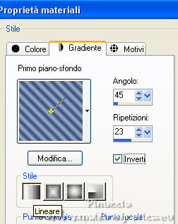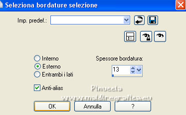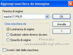qui puoi trovare qualche risposta ai tuoi dubbi. Se l'argomento che ti interessa non è presente, ti prego di segnalarmelo. Questo tutorial è stato realizzato con Corel2020 e tradotto con PSPX e PSP7, ma può essere realizzato anche con le altre versioni di PSP. Dalla versione X4, il comando Immagine>Rifletti è stato sostituito con Immagine>Capovolgi in orizzontale, e il comando Immagine>Capovolgi con Immagine>Capovolgi in verticale. Nelle versioni X5 e X6, le funzioni sono state migliorate rendendo disponibile il menu Oggetti. Con la nuova versione X7, sono tornati Rifletti>Capovolgi, ma con nuove varianti. Vedi la scheda sull'argomento qui Grazie ai creatori dei tubes che mettono a disposizione il loro lavoro in vari gruppi di condivisione. Rispetta il lavoro degli autori, non cambiare il nome del file e non cancellare il watermark. traduzione francese qui traduzione inglese qui Le vostre versioni qui![]() Occorrente: Tube a scelta. ![]() Per i tubes usati e non forniti grazie Beatriz e GranGran. Per il tube del paesaggio grazie Mentali. (in questa pagina trovi i links ai siti dei creatori di tubes) ![]() in caso di dubbi, ricorda di consultare la mia sezione filtri qui Filters Unlimited 2.0 qui Mehdi - Sorting Tiles qui Mura's Meister - Perspective Tiling qui Alien Skin Xenofex 2 - Constellation qui ![]() qui ![]() non esitare a cambiare modalità di miscelatura e opacità secondo i colori utilizzati. Nelle ultime versioni di PSP non c'é il gradiente di primo piano/sfondo (Corel_06_029) Puoi usare i gradienti delle versioni precedenti. Trovi qui i gradienti Corel X. Apri la maschera in PSP e minimizzala con il resto del materiale ![]() 1. Scegli due colori dal tuo tube, e imposta il colore di primo piano con il colore chiaro, e il colore di sfondo con il colore scuro. ![]() Apri una nuova immagine trasparente 1000 x 600 pixels. Riempi l'immagine trasparente con il colore scuro.Livelli>Nuovo livello raster. Selezione>Seleziona tutto. Apri il paesaggio mentali-misted803 ![]() e vai a Modifica>Copia. Torna al tuo lavoro e vai a Modifica>Incolla nella selezione. Selezione>Deseleziona. Effetti>Effetti di immagine>Motivo unico, con i settaggi standard. ![]() Regola>Sfocatura>Sfocatura gaussiana - raggio 20. ![]() 2. Effetti>Plugins>Mehdi - Sorting Tiles. ![]() Regola>Messa a fuoco>Metti a fuoco. Livelli>Nuovo livello raster. Riempi il livello con il colore chiaro.Livelli>Nuovo livello maschera>Da immagine. Apri il menu sotto la finestra di origine e vedrai la lista dei files aperti. Seleziona la maschera maske112©ILR ![]() Effetti>Effetti di bordo>Aumenta. Livelli>Unisci>Unisci gruppo. 3. Attiva lo strumento Bacchetta magica ![]() e clicca nella cornice per selezionarla. Livelli>Nuovo livello raster. Livelli>Disponi>Sposta giù. Riempi il livello con il colore scuro.Livelli>Nuovo livello raster. Modifica>Incolla nella selezione (il tube del paesaggio è sempre in memoria). Regola>Messa a fuoco>Metti a fuoco. Livelli>Nuovo livello raster. Effetti>Effetti 3D>Ritaglio. ![]() Attiva il livello superiore, Gruppo Raster 3. ![]() 4. Selezione>Modifica>Seleziona bordature selezione. ![]() Effetti>Effetti 3D>Smusso a incasso. ![]() Selezione>Deseleziona. Livelli>Unisci>Unisci giù - 3 volte. ![]() Apri il tube Jewels e vai a Modifica>Copia.Torna al tuo lavoro e vai a Modifica>Incolla come nuovo livello. Oggetti>Allinea>Superiore. Oppure attiva lo strumento Puntatore ![]() e imposta Posizione Y 0,00. ![]() Attiva il livello Raster 2. ![]() Livelli>Unisci>Unisci giù. Livelli>Duplica. 5. Effetti>Plugins>Mura's Meister - Perspective Tiling. ![]() Effetti>Effetti 3D>Sfalsa ombra. ![]() Attiva il livello superiore. Apri il tube principale e vai a Modifica>Copia. Torna al tuo lavoro e vai a Modifica>Incolla come nuovo livello. Immagine>Ridimensiona, se e quanto necessario, tutti i livelli non selezionato. Regola>Messa a fuoco>Metti a fuoco. Effetti>Effetti 3D>Sfalsa ombra, con i settaggi precedenti. Apri il tube accessorio 177vmtubes e vai a Modifica>Copia.Torna al tuo lavoro e vai a Modifica>Incolla come nuovo livello. Immagine>Ridimensiona, se e quanto necessario, tutti i livelli non selezionato. Regola>Messa a fuoco>Metti a fuoco. Effetti>Effetti 3D>Sfalsa ombra. ![]() 6. Attiva il livello Raster 1. Selezione>Seleziona tutto. Immagine>Dimensioni tela - 1100 x 700 pixels ![]() Selezione>Inverti. Passa il colore di primo piano a Gradiente di primo piano/sfondo, stile Lineare ![]() Riempi la selezione con il gradiente.Effetti>Plugins>Filters Unlimited 2.0 - Buttons & Frames - Rectangular Button. ![]() Selezione>Inverti. Attiva il livello superiore. Livelli>Nuovo livello raster. Effetti>Effetti 3D>Ritaglio, con i settaggi precedenti. Selezione>Deseleziona. 7. Firma il tuo lavoro su un nuovo livello. Attiva il livello Raster 4 (il tube Jewels). ![]() Livelli>Duplica - 2 volte, e rinomina i livelli 1-2-3. Rimani posizionato sul livello 3. Effetti>Plugins>Alien Skin Xenofex 2 - Constellation. ![]() Chiudi questo livello. 8. Attiva il livello sottostante, 2. Effetti>Plugins>Alien Skin Xenofex 2 - Constellation. Clicca su Random Seed e ok. ![]() Chiudi questo livello, e attiva il livello sottostante, 1. Effetti>Plugins>Alien Skin Xenofex 2 - Constellation. Clicca su Random Seed e ok. 9. Modifica>Copia Speciale>Copia Unione. Apri Animation Shop e vai a Modifica>Incolla>Incolla come nuova animazione. Torna in PSP. Chiudi il livello 1 e apri il livello 2. Modifica>Copia Speciale>Copia Unione. Torna in Animation Shop e vai a Modifica>Incolla>Incolla dopo il fotogramma corrente. Di nuovo in PSP. Chiudi il livello 2 e apri il livello 3. Modifica>Copia Speciale>Copia Unione. In Animation Shop: Modifica>Incolla>Incolla dopo il fotogramma corrente. Controlla il risultato cliccando su Visualizza ![]() e salva in formato gif. Per i tubes di questo esempio grazie Tine e Elaine ![]() Per i tubes di questo esempio grazie Wieske e Colybrix ![]() ![]() Se hai problemi o dubbi, o trovi un link non funzionante, o anche solta