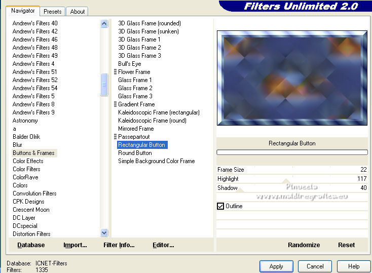 Effets>Modules Externes>Filters Unlimited 2.0 - Buttons & Frames - Rectangular Button.