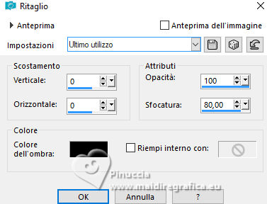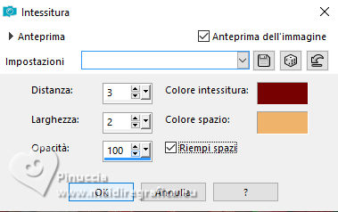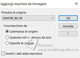 qui puoi trovare qualche risposta ai tuoi dubbi. Se l'argomento che ti interessa non è presente, ti prego di segnalarmelo. Questo tutorial è stato realizzato con PSP2019 e tradotto con PSPX9 e PSP2020, ma può essere realizzato anche con le altre versioni di PSP. Dalla versione X4, il comando Immagine>Rifletti è stato sostituito con Immagine>Capovolgi in orizzontale, e il comando Immagine>Capovolgi con Immagine>Capovolgi in verticale. Nelle versioni X5 e X6, le funzioni sono state migliorate rendendo disponibile il menu Oggetti. Con la nuova versione X7, sono tornati Rifletti>Capovolgi, ma con nuove varianti. Vedi la scheda sull'argomento qui Grazie ai creatori dei tubes che mettono a disposizione il loro lavoro in vari gruppi di condivisione. Rispetta il lavoro degli autori, non cambiare il nome del file e non cancellare il watermark. traduzione francese qui traduzione inglese qui Le vostre versioni qui![]() Occorrente: ![]() Per i tubes grazie Mentali, Angi, DBK. (in questa pagina trovi i links ai siti dei creatori di tubes) ![]() in caso di dubbi, ricorda di consultare la mia sezione filtri qui Mura's Meister - Perspective Tiling qui Alien Skin Eye Candy 5 Impact - Glass qui ![]() non esitare a cambiare modalità di miscelatura e opacità secondo i colori utilizzati. ![]() Apri la maschera in PSP e minimizzala con il resto del materiale. 1. Scegli dai tuoi tubes un colore chiaro e un colore scuro. I miei colori. ![]() Apri una nuova immagine trasparente 1000 x 650 pixels. Selezione>Seleziona tutto. Apri la tua immagine di sfondo, per l'esempio ho usato il tube mentali-misted2213 ![]() Chiudi il livello della firma e vai a Modifica>Copia Speciale>Copia Unione. (se preferisci puoi copiare soltanto il livello inferiore di sfondo) Torna al tuo lavoro e vai a Modifica>Incolla nella selezione. Selezione>Deseleziona. Effetti>Effetti di immagine>Motivo unico, con i settaggi standard. ![]() Regola>Sfocatura>Sfocatura gaussiana - raggio 50. ![]() 2. Apri DBK_SantaBabyE63 ![]() Modifica>Copia. Torna al tuo lavoro e vai a Modifica>Incolla come nuovo livello. Colorizza con i tuoi colori. Lascia il tube al centro. Attiva nuovamente il tube mentali-misted2213 e copia il livello del tube. Torna al tuo lavoro e vai a Modifica>Incolla come nuovo livello. Livelli>Disponi>Sposta giù. Immagine>Ridimensiona, se necessario, per me al 75%, tutti i livelli non selezionato. Attiva nuovamente il livello superiore. Attiva lo strumento Bacchetta magica ![]() e clicca nello spazio esterno alla finestra per selezionarlo. ![]() Attiva il livello sottostante. Premi sulla tastiera il tasto CANC ![]() Selezione>Deseleziona. 3. Attiva nuovamente il livello superiore. Seleziona con la bacchetta magica tutte le aperture delle finestra.![]() Effetti>Plugins>Alien Skin Eye Candy 5 Impact - Glass Glass Color usato per il mio esempio #ffb1b1 ![]() Selezione>Deseleziona. Effetti>Effetti 3D>Sfalsa ombra. ![]() Livelli>Unisci>Unisci giù. Immagine>Ridimensiona, all'85%, tutti i livelli non selezionato. Tasto K per attivare lo strumento Puntatore ![]() e imposta Posizione X: 244,00 e Posizione Y: -13,00. ![]() 4. Attiva il livello Raster 1. Livelli>Nuovo livello raster. Riempi il livello con il colore chiaro.Livelli>Nuovo livello maschera>Da immagine. Apri il menu sotto la finestra di origine e vedrai la lista dei files aperti. Seleziona la maschera WINTER_BG 49 ![]() Effetti>Effetti di bordo>Aumenta di più. Livelli>Unisci>Unisci gruppo. Livelli>Unisci>Unisci giù. Livelli>Duplica. Effetti>Plugins>Mura's Meister - Perspective Tiling. ![]() Effetti>Effetti 3D>Sfalsa ombra, con i settaggi precedenti. 5. Effetti>Effetti di riflesso>Specchio rotante. ![]() Attiva il livello inferiore. Modifica>Copia. Modifica>Incolla come nuova immagine, e minimizza. Torna al tuo lavoro. Attiva il livello superiore. Copia/incolla come nuovo livello i tubes dei personaggi, e i tubes accessori: Apri Angi Designs>CU_vol120 el(1) ![]() Modifica>Copia. Torna al tuo lavoro e vai a Modifica>Incolla come nuovo livello. Immagine>Ridimensiona, se necessario, per il tube fornito non ho ridimensionato. Regola>Messa a fuoco>Metti a fuoco. Spostalo a destra.Effetti>Effetti 3D>Sfalsa ombra. ![]() Apri santa hood-bon_us2 ![]() Modifica>Copia. Torna al tuo lavoro e vai a Modifica>Incolla come nuovo livello. Immagine>Ridimensiona, se necessario, per il tube fornito non ho ridimensionato. Regola>Messa a fuoco>Metti a fuoco. Posiziona il tube al centro.Livelli>Disponi>Sposta giù. Effetti>Effetti 3D>Sfalsa ombra. ![]() Attiva il livello superiore. Apri HD IKHD Merry ChristmasCU23 ![]() Modifica>Copia. Torna al tuo lavoro e vai a Modifica>Incolla come nuovo livello. Immagine>Ridimensiona, se necessario, per il tube fornito non ho ridimensionato. Regola>Messa a fuoco>Metti a fuoco. Spostalo a sinistra.Effetti>Effetti 3D>Sfalsa ombra. ![]() Apri little girl xmas 1 ![]() Modifica>Copia. Torna al tuo lavoro e vai a Modifica>Incolla come nuovo livello. Immagine>Ridimensiona, se necessario, per il tube fornito non ho ridimensionato. Regola>Messa a fuoco>Metti a fuoco. Spostalo a sinistra.Effetti>Effetti 3D>Sfalsa ombra. ![]() Controlla che tutto sia ben posizionato. ![]() Livelli>Unisci>Unisci visibile. 6. Selezione>Seleziona tutto. Livelli>Nuovo livello raster. Effetti>Effetti 3D>Ritaglio. ![]() Livelli>Unisci>Unisci giù. Immagine>Dimensioni tela - 1100 x 750 pixels. ![]() Selezione>Inverti. Attiva l'immagine che hai minimizzato al punto 5 ![]() Modifica>Copia. Torna al tuo lavoro e vai a Modifica>Incolla nella selezione. Livelli>Nuovo livello raster. Riempi con il colore chiaro.7. Selezione>Modifica>Contrai - 10 pixels. Premi sulla tastiera il tasto CANC ![]() Selezione>Inverti. Effetti>Effetti 3D>Sfalsa ombra. ![]() Selezione>Deseleziona. Attiva lo strumento Bacchetta ![]() e clicca nei due bordi chiari per selezionarli. 8. Effetti>Effetti di trama>Intessitura. colore intessitura: colore scuro colore spazio: colore chiaro ![]() Effetti>Effetti 3D>Smusso a incasso. ![]