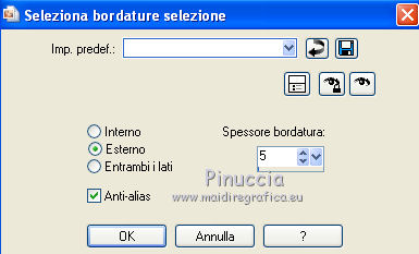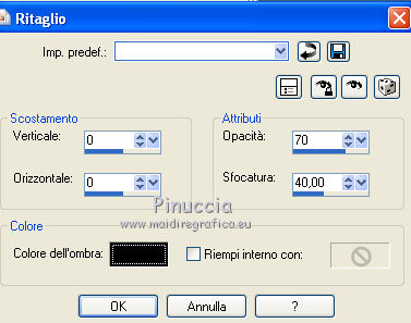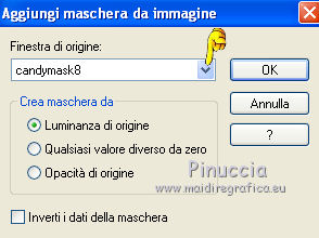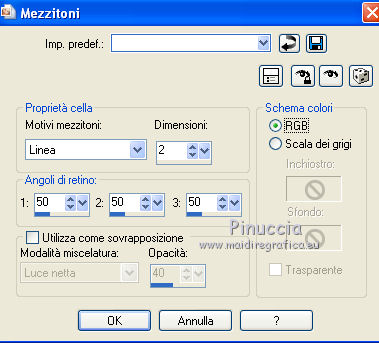qui puoi trovare qualche risposta ai tuoi dubbi. Se l'argomento che ti interessa non è presente, ti prego di segnalarmelo. Questo tutorial è stato creato con PSP X2, ma può essere eseguito anche con le altre versioni di PSP. Per tradurlo, ho usato PSP X. Il materiale viene da vari gruppi di condivisione. Il copyright appartiene ai rispettivi autori. Grazie ai creatori dei tubes che mettono a disposizione il loro lavoro in vari gruppi di condivisione. Rispetta il lavoro degli autori, non cambiare il nome del file e non cancellare il watermark. Occorrente: Materiale qui Per i tubes usati, grazie a MDZ e Gina. Apri la maschera con il materiale in PSP. 1. Scegli due colori dai tuoi tubes. Imposta il colore di primo piano con il colore chiaro, e il colore di sfondo con il colore scuro. Apri una nuova immagine trasparente 900 x 700 pixels, e riempila con il colore di sfondo (tasto destro del mouse).Apri "bloody-tears-haunting-eyes" e vai a Modifica>Copia. Torna al tuo lavoro e vai a Modifica>Incolla come nuovo livello. Sposta il tube in alto contro il bordo.Nella paletta dei livelli cambia la modalità di miscelatura di questo livello in Luminanza (Esistente). Apri "56813497" e vai a Modifica>Copia. Torna al tuo lavoro e vai a Modifica>Incolla come nuovo livello. Sposta il tube a sinistra.Cambia la modalità di miscelatura di questo livello in Luminanza (Esistente). Apri "ginatubes femme 1156" e vai a Modifica>Copia. Torna al tuo lavoro e vai a Modifica>Incolla come nuovo livello. Sposta il tube a destra.Cambia la modalità di miscelatura di questo livello in Luminanza (Esistente). ![]() 2. Livelli>Nuovo livello raster. Riempi con il colore di primo piano.Livelli>Nuovo livello maschera>Da immagine. Apri il menu sotto la finestra di origine e vedrai la lista dei files aperti. Seleziona la maschera candymask8 con i seguenti settaggi. ![]() Livelli>Duplica. ![]() Livelli>Unisci>Unisci gruppo. Effetti>Effetti 3D>Sfalsa ombra. ![]() Livelli>Nuovo livello raster. Selezione>Seleziona tutto. Riempi il livello con il colore di sfondo.Selezione>Modifica>Contrai - 5 pixels. ![]() Premi sulla tastiera il tasto CANC. Effetti>Effetti 3D>Ritaglio. ![]() Selezione>Inverti. Effetti>Effetti artistici>Mezzitoni. ![]() 3. Selezione>Seleziona tutto. Selezione>Modifica>Contrai - 15 pixels. Riempi con il colore di primo piano.Selezione>Modifica>Contrai - 5 pixels. Premi sulla tastiera il tasto CANC. Selezione>Modifica>Seleziona bordature selezione. ![]() Effetti>Effetti artistici>Mezzitoni, con i settaggi precedenti. Selezione>Deseleziona. Scrivi un tuo testo o usa il file di testo fornito con il materiale. Aggiungi il tuo nome e/o il tuo watermark su un nuovo livello. Livelli>Unisci>Unisci tutto e salva in formato jpg. ![]() Se hai problemi o dubbi, o trovi un link non funzionante, o anche soltanto per un saluto, scrivimi. 30 Ottobre 2010 |
