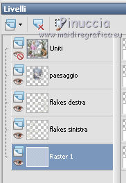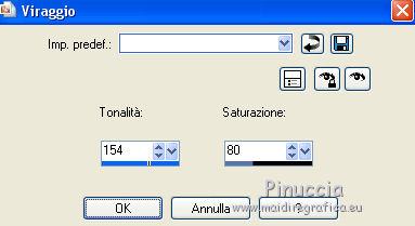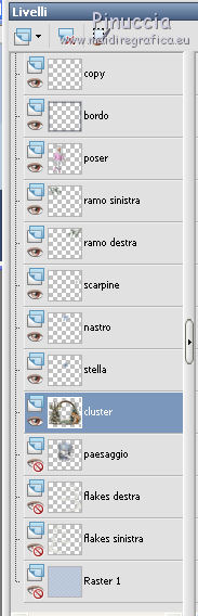 qui puoi trovare qualche risposta ai tuoi dubbi. Se l'argomento che ti interessa non è presente, ti prego di segnalarmelo. Questo tutorial è stato creato con PSP X2, ma può essere eseguito anche con le altre versioni di PSP. Per tradurlo, ho usato PSP X. Se stai usando le nuove versioni di PSP, a proposito delle funzioni Rifletti/Capovolgi, vedi la mia scheda qui Grazie ai creatori dei tubes che mettono a disposizione il loro lavoro in vari gruppi di condivisione. Rispetta il lavoro degli autori, non cambiare il nome del file e non cancellare il watermark. Occorrente: A scelta: un cluster, il tube di un personaggio, un'immagine di sfondo. Il resto del materiale qui Per il poser usato grazie Gerda Per il cluster grazie Alisa. Per il paesaggio grazie DaisyWeb. Filtri: Xero - Improver qui Animation Shop qui 1. Scegli due colori dal tuo materiale, e imposta il colore di primo piano con il colore chiaro, e il colore di sfondo con il colore scuro. Apri una nuova immagine trasparente 900 x 800 pixels. Selezione>Seleziona tutto. Apri "Paper-03" e vai a Modifica>Copia. Torna al tuo lavoro e vai a Modifica>Incolla nella selezione. se stai usando altri colori, colorizza con il tuo colore scuro. Prendi nota dei valori di Tonalità (H) e Saturazione (S) del tuo colore ![]() Regola>Tonalità e saturazione>Viraggio, e trascrivi i valori annotati nelle rispettive caselle. ![]() Apri il tuo cluster e vai a Modifica>Copia. Torna al tuo lavoro e vai a Modifica>Incolla come nuovo livello. Immagine>Ridimensiona, se e quanto necessario, tutti i livelli non selezionato. il cluster usato per il mio esempio non è stato ridimensionato Effetti>Plugins>Xero - Improver. ![]() Effetti>Effetti 3D>Sfalsa ombra. ![]() 2. Apri il tuo paesaggio e vai a Modifica>Copia. Torna al tuo lavoro e vai a Modifica>Incolla come nuovo livello. Immagine>Ridimensiona, se e quanto necessario, tutti i livelli non selezionato. Spostalo al centro del cluster.Effetti>Plugins>Xero - Improver, con i settaggi precedenti. Porta questo livello sotto il livello del cluster. Attiva nuovamente il livello superiore. Apri "flakes" e vai a Modifica>Copia. Torna al tuo lavoro e vai a Modifica>Incolla come nuovo livello. Spostalo a sinistra.Effetti>Plugins>Xero - Improver, con i settaggi precedenti. Effetti>Effetti 3D>Sfalsa ombra, con i settaggi precedenti. Porta il livello sotto il livello del cluster. Livelli>Duplica. Immagine>Rifletti. 3. Apri "stern" e vai a Modifica>Copia. Torna al tuo lavoro e vai a Modifica>Incolla come nuovo livello. Colorizza se necessario. Sposta la stella in alto, nel cluster.Effetti>Plugins>Xero - Improver, con i settaggi precedenti. Effetti>Effetti 3D>Sfalsa ombra, con i settaggi precedenti. Apri "schleife" e vai a Modifica>Copia. Torna al tuo lavoro e vai a Modifica>Incolla come nuovo livello. Spostalo sopra la stella.Effetti>Plugins>Xero - Improver, con i settaggi precedenti. Effetti>Effetti 3D>Sfalsa ombra, con i settaggi precedenti. Apri "Handschuhe" e vai a Modifica>Copia. Torna al tuo lavoro e vai a Modifica>Incolla come nuovo livello. Effetti>Plugins>Xero - Improver, con i settaggi precedenti. Effetti>Effetti 3D>Sfalsa ombra, con i settaggi precedenti. Spostalo a destra.4. Apri "zweig" e vai a Modifica>Copia. Torna al tuo lavoro e vai a Modifica>Incolla come nuovo livello. Effetti>Plugins>Xero - Improver, con i settaggi precedenti. Effetti>Effetti 3D>Sfalsa ombra, con i settaggi precedenti. Spostalo in alto a destra, sopra le scarpine.![]() Livelli>Duplica. Immagine>Rifletti. Apri il tuo poser e vai a Modifica>Copia. Torna al tuo lavoro e vai a Modifica>Incolla come nuovo livello. Immagine>Ridimensiona, se e quanto necessario, tutti i livelli non selezionato. Effetti>Plugins>Xero - Improver, con i settaggi precedenti. Effetti>Effetti 3D>Sfalsa ombra. ![]() Spostalo dove preferisci, o vedi il mio esempio.5. Livelli>Nuovo livello raster. Selezione>Seleziona tutto. Riempi con il tuo colore scuro.Selezione>Modifica>Contrai - 4 pixels. ![]() Riempi con il colore chiaro.Selezione>Modifica>Contrai - 2 pixels. Riempi con il colore scuro.Selezione>Modifica>Contrai - 4 pixels. Effetti>Effetti 3D>Ritaglio. ![]() Selezione>Deseleziona. Aggiungi il tuo nome e/o il tuo watermark, senza dimenticare eventuali copyright delle immagini usate. Chiudi i quattro livelli inferiori e attiva uno dei livelli visibili. ![]() Livelli>Unisci>Unisci visibile. Chiudi questo livello, riapri i livelli chiusi e attiva uno dei livelli visibili. ![]() Livelli>Unisci>Unisci visibile e rimani posizionato su questo livello Uniti. ![]() Modifica>Copia. Apri Animation Shop e vai a Modifica>Incolla>Incolla come nuova animazione. Modifica>Duplica, e ripeti finchè non avrai una animazione composta da 10 fotogrammi. Clicca sul primo fotogramma per selezionarlo e vai a Modifica>Seleziona tutto. 7. Apri Schnee-Datei, anche questo composto da 10 fotogrammi. Modifica>Seleziona tutto. Modifica>Copia. Attiva il tuo lavoro e vai a Modifica>Incolla>Incolla nel fotogramma selezionato. Posiziona l'animazione al centro ![]() 8. Torna in PSP. Riapri e attiva il livello superiore Uniti. Modifica>Copia. Torna in Animation Shop e vai a Modifica>Incolla>Incolla come nuova animazione. Modifica>Duplica, e ripeti finchè non avrai 10 fotogrammi. Modifica>Seleziona tutto. Modifica>Copia. Attiva il tuo lavoro e vai a Modifica>Incolla>Incolla nel fotogramma selezionato. Posiziona l'immagine correttamente al centro. Controlla il risultato cliccando su Visualizza e salva in formato gif.Se vuoi ridurre il peso della tua animazione, vedi qui ![]() Se hai problemi o dubbi, o trovi un link non funzionante, o anche soltanto per un saluto, scrivimi. 9 Novembre 2013 |