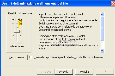 Per "alleggerire" un po' il peso della gif, abbassa la qualità a 127 colori; questo si può fare tranquillamente con immagini scure.