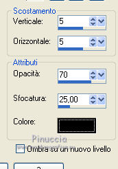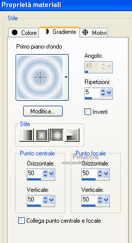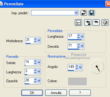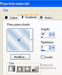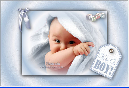 qui puoi trovare qualche risposta ai tuoi dubbi. Se l'argomento che ti interessa non è presente, ti prego di segnalarmelo. Per tradurre questo tutorial ho usato PSP X. Occorrente: Materiale qui Quasi tutto il materiale è di Jeannette. Nello zip trovi anche la versione rosa per realizzare il tutorial al femminile. ![]() Imposta il colore di primo piano con #f5f4f7, e il colore di sfondo con #afc5dc. Passa il colore di primo piano a Gradiente. ![]() 1. Apri una nuova immagine trasparente 750 x 500 pixels, e riempila con il gradiente.2. Effetti>Effetti tecniche di disegno>Pennellate, colore #c0c0c0. ![]() 3. Apri il tube del bambino. Elimina il livello del watermark. Livelli>Nuovo livello raster. Riempi con il colore di sfondo.Livelli>Disponi>Porta sotto. Livelli>Unisci>Unisci tutto. 4. Modifica>Copia. Torna al tuo lavoro e vai a Modifica>Incolla come nuovo livello. Lascialo come sta. Efftti>Effetti 3D>Sfalsa ombra. ![]() Ripeti l'Effetto Sfalsa ombra, cambiando verticale e orizzontale con -5. 5. Apri il tube baby-accessoires che è composto da 3 livelli. Copia e incolla sul tuo lavoro tutti i livelli, e posiziona i tubes come preferisci, o vedi il mio esempio.![]() 6. Livelli>Unisci>Unisci tutto. 7. Immagine>Aggiungi bordatura, 1 pixel, simmetriche, con il colore di primo piano. Immagine>Aggiungi bordatura, 1 pixel, simmetriche, con il colore di sfondo. Immagine>Aggiungi bordatura, 1 pixel, simmetriche, con il colore di primo piano. Immagine>Aggiungi bordatura, 15 pixels, simmetriche, con il colore di sfondo. Seleziona questo bordo con la bacchetta magica ![]() Cambia i settaggi del gradiente. ![]() Riempi la selezione con il gradiente.8. Effetti>Effetti tecniche di disegno>Pennellate, con i settaggi precedenti. 9. Effetti>Effetti 3D>Smusso a incasso. ![]() Selezione>Deseleziona. 10. Immagine>Aggiungi bordatura, 1 pixel, simmetriche, con il colore di primo piano. Immagine>Aggiungi bordatura, 1 pixel, simmetriche, con il colore di sfondo. Immagine>Aggiungi bordatura, 1 pixel, simmetriche, con il colore di primo piano. 11. Apri il tube con l'orsetto e vai a Modifica>Copia. Torna al tuo lavoro e vai a Modifica>Incolla come nuovo livello. Spostalo sul bordo in basso a sinistra.Effetti>Effetti 3D>Sfalsa ombra. ![]() 12. Livelli>Unisci>Unisci tutto. Firma il tuo lavoro e salva in formato jpg. Versione rosa. ![]() Per visualizzare lo script clicca sull'immagine Se hai problemi o dubbi, o trovi un link non funzionante, o anche soltanto per un saluto, scrivimi. 25 Luglio 2012 |