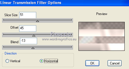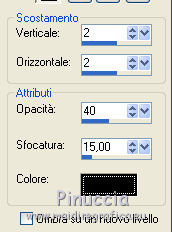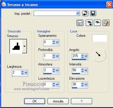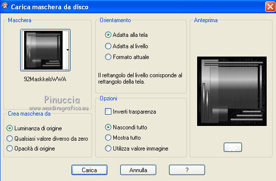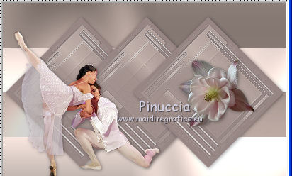 qui puoi trovare qualche risposta ai tuoi dubbi. Se l'argomento che ti interessa non è presente, ti prego di segnalarmelo. Per tradurre questo tutorial ho usato PSP X. Occorrente: Materiale qui Filtri: se hai problemi con i filtri, ricorda di consultare la mia sezione filtri qui Greg's Factory Output qui DSB Flux qui ![]() Imposta il colore di primo piano con #c9b9b2, e il colore di sfondo con #978683. 1. Apri una nuova immagine trasparente 800 x 500 pixels, e riempila con il colore di sfondo.Livelli>Nuovo livello raster. Riempi con il colore di primo piano.2. Effetti>Plugins>Greg's Factory Output II - Poolshadow. ![]() 3. Effetti>Plugins>DSB Flux - Linear Transmission. ![]() 4. Apri una nuova immagine trasparente 300 x 300 pixels, e riempila con il colore di sfondo.Livelli>Nuovo livello raster. Riempi con il colore di primo piano.5. Livelli>Carica/Salva maschera>Carica maschera da disco. Cerca e carica la maschera 92MasskelsWWA. ![]() Livelli>Elimina e rispondi sì alla domanda unire la maschera nel livello corrente. ![]() Livelli>Unisci>Unisci gruppo. 6. Livelli>Unisci>Unisci visibile. 7. Effetti>Effetti di bordo>Aumenta di più. 8. Modifica>Copia. Torna al tuo lavoro e vai a Modifica>Incolla come nuovo livello. Immagine>Ruota per gradi - 45 gradi a destra. ![]() 9. Effetti>Effetti 3D>Sfalsa ombra. ![]() 10. Livelli>Duplica - 2 volte, e posiziona i blocchi come nel mio esempio.![]() 11. Livelli>Unisci>Unisci visibile. 12. Apri il tube della coppia "323_classic_dancer" e vai a Modifica>Copia. Torna al tuo lavoro e vai a Modifica>Incolla come nuovo livello. Spostalo a sinistra.Effetti>Effetti 3D>Sfalsa ombra, con i settaggi precedenti. Regola>Messa a fuoco>Metti a fuoco. 13. Apri il tube del fiore JvG-1731-2-wit-rose_bloemkopie. Attiva lo strumento Gomma e cancella lo stelo.Modifica>Copia. Torna al tuo lavoro e vai a Modifica>Incolla come nuovo livello. Spostalo a destra.![]() Effetti>Effetti 3D>sfalsa ombra, con i settaggi precedenti. Regola>Messa a fuoco>Metti a fuoco. 14. Livelli>Unisci>Unisci tutto. 15. Immagine>Aggiungi bordatura, 3 pixels, simmetriche, con il colore nero. Seleziona questo bordo con la bacchetta magica ![]() e riempilo con il colore di primo piano.16. Effetti>Effetti 3D>Smusso a incasso. ![]() Selezione>Deseleziona. 17. Immagine>Aggiungi bordatura, 20 pixels, simmetriche, con il colore nero. Seleziona questo bordo con la bacchetta magica ![]() e riempilo con il colore di primo piano.18. Effetti>Effetti di trama>Veneziana. ![]() 19. Livelli>Nuovo livello raster. Riempi con il colore di primo piano.Effetti>Plugins>Greg's Factory Output II - Poolshadow, con i settaggi precedenti. Abbassa l'opacità di questo livello al 50%. Livelli>Unisci>Unisci visibile. 20. Immagine>Aggiungi bordatura, 2 pixels, simmetriche, con il colore di primo piano. 21. Apri il tube con il nastro "strikje2" e vai a Modifica>Copia. Torna al tuo lavoro e vai a Modifica>Incolla come nuovo livello. Spostalo nell'angolo in alto a destra.22. Apri il tube con "ballerina", e vai a Modifica>Copia. Torna al tuo lavoro e vai a Modifica>Incolla come nuovo livello. Spostalo in basso a destra.Effetti>Effetti 3D>Sfalsa ombra, con i settaggi precedenti. 23. Livelli>Unisci>Unisci tutto. 24. Attiva lo strumento Testo ![]() ![]() Scrivi il tuo testo. Effetti>Effetti 3D>Sfalsa ombra, con i settaggi precedenti. REgola>Messa a fuoco>Metti a fuoco. Eventualmente, se vuoi, aggiungi delle stelline all'immagine. Salva in formato jpg. Se hai problemi o dubbi, o trovi un link non funzionante, o anche soltanto per un saluto, scrivimi. 1 Febbraio 2012 |