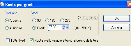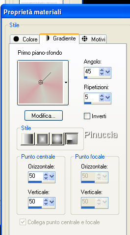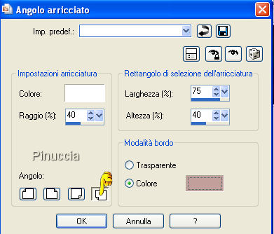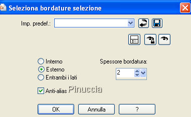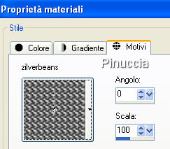qui puoi trovare qualche risposta ai tuoi dubbi. Se l'argomento che ti interessa non è presente, ti prego di segnalarmelo. Per tradurre questo tutorial ho usato PSP X. Occorrente: Materiale qui ![]() Se non vuoi sentire la musica premi il tasto ESC Metti il motivo Zilverbeans nella cartella Motivi. Imposta il colore di primo piano con #CDCEC3, e il colore di sfondo con #D2A6A6. Passa il colore di primo piano a Gradiente di primo piano/sfondo con i seguenti settaggi: ![]() 1. Apri una nuova immagine trasparente 400 x 400 pixels, e riempila con il gradiente.2. Apri il tube con il fiore e vai a Modifica>Copia. Torna al tuo lavoro e vai a Modifica>Incolla come nuovo livello. 3. Immagine>Aggiungi bordatura, 1 pixel, simmetriche, con il colore di primo piano. 4. Immagine>Aggiungi bordatura, simmetriche non selezionato, con il colore nero. ![]() 5. Seleziona questo bordo con la bacchetta magica ,e riempilo con il gradiente.6. Selezione>Inverti. Effetti>Effetti 3D>Sfalsa ombra, con i seguenti settaggi: ![]() Ripeti l'Effetto Sfalsa ombra, cambiando verticale e orizzontale con -3. 7. Effetti>Effetti di immagine>Angolo arricciato. ![]() Mantieni selezionato. 8. Selezione>Modifica>Seleziona bordature selezione: ![]() 9. Livelli>Nuovo livello raster. Passa il colore di primo piano a Motivi e seleziona il motivo Zilverbeans. ![]() Riempi la selezione con il motivo.Regola>Messa a fuoco>Metti a fuoco. Selezione>Deseleziona. Livelli>Unisci>Unisci visibile. 10. Immagine>Aggiungi bordatura, 4 pixels, simmetriche, con il colore nero. Seleziona questo bordo con la bacchetta magica ![]() e riempilo con il motivo argento.Regola>Messa a fuoco>Metti a fuoco. Selezione>Deseleziona. 11. Chiudi il colore di primo piano e imposta il colore di sfondo con un altro motivo argento. Il mio: ![]() 12. Attiva lo strumento Testo e scrivi il tuo nome.Effetti>Effetti 3D>Sfalsa ombra: ![]() 13. Immagine>Ruota per gradi - 27 gradi a destra: ![]() 14. Sposta il testo nell'angolo arricciato.15. Scrivi un testo verticale. Effetti>Effetti 3D>Sfalsa ombra, come al punto 12. 16. Apri il tube con il nastro (strikje) e vai a Modifica>Copia. Torna al tuo lavoro e vai a Modifica>Incolla come nuovo livello. 17. Posiziona il nastrino nell'angolo in alto a destra.Livelli>Duplica. Immagine>Capovolgi. L'immagine è finita. Per lo script ti servono anche due immagini di sfondo e il motivo argento che ti è stato fornito con il materiale. Per realizzare lo script - che trovi qui puoi seguire i soliti preliminari descritti alla fine di questo tutorial, e sostituire le immagini, con le dovute variazioni, come spiegato nei precedenti tutorial. Se hai problemi o dubbi, o trovi un link non funzionante, o anche soltanto per un saluto, scrivimi. 1 Settembre 2009 |