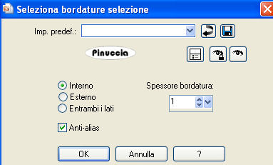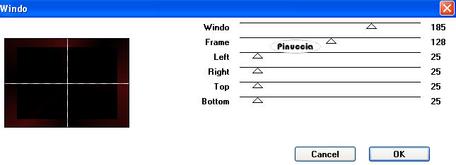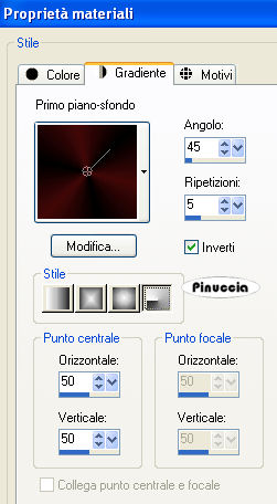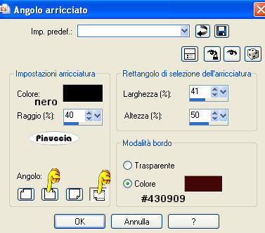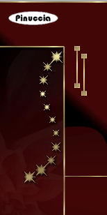 qui puoi trovare qualche risposta ai tuoi dubbi. Se l'argomento che ti interessa non è presente, ti prego di segnalarmelo. Per tradurre questo tutorial ho usato PSP X. Occorrente: Materiale qui Il tube della donna è di Gerry, il resto del materiale è di Jeannette. Filtri: Mock qui Imposta il colore di primo piano con #430909, e il colore di sfondo con il nero #000000. Passa il colore di primo piano a Gradiente di primo piano/sfondo: ![]() 1. Apri una nuova immagine trasparente 700 x 500 pixels, Passa il colore di primo piano a Motivi e seleziona un motivo oro: ![]() se non hai un motivo oro qui Riempi l'immagine trasparente con il motivo oro.2. Livelli>Nuovo livello raster. Riempi il livello con il gradiente.3. Selezione>Seleziona tutto. Selezione>Modifica>Contrai - 65 pixels. Selezione>Inverti. 4. Effetti>Plugins>Mock - Windo: ![]() 5. Effetti>Effetti di immagine>Angolo arricciato: colore arricciatura: nero; colore bordo: colore di primo piano; angolo superiore destro; ripeti selezionando angolo inferiore sinistro: ![]() 6. Selezione>Modifica>Seleziona bordature selezione: ![]() 7. Premi sulla tastiera il tasto CANC ![]() Selezione>Deseleziona. 8. Livelli>Unisci>Unisci visibile. 9. Apri l'immagine con il fiore e vai a Modifica>copia. Torna al tuo lavoro e vai a Modifica>Incolla come nuovo livello. Sposta l'immagine a destra,esattamente contro il bordo dorato. 10. Nella paletta dei livelli abbassa l'opacità di questo livello a 4. ![]() 11. Apri il tube della donna. Immagine>Ridimensiona - a 490 pixels di altezza. 12. Modifica>Copia. Torna al tuo lavoro e vai a Modifica>Incolla come nuovo livello. Sposta il tube a sinistra, esattamente sul bordo inferiore dorato.13. Effetti>Effetti 3D>Sfalsa ombra: ![]() Ripeti l'Effetto Sfalsa ombra, cambiando verticale e orizzontale con -5. 14. Regola>Messa a fuoco>Metti a fuoco. 15. Apri il tube con le stelline "gouden sterretjes" e vai a Modifica>copia. Torna al tuo lavoro e vai a Modifica>Incolla come nuovo livello. Sposta l'immagine in alto a destra nella sezione interna.16. Effetti>Effetti 3D>Sfalsa ombra: ![]() Regola>Messa a fuoco>Metti a fuoco. 17. Apri il tube blokjes e vai a Modifica>copia. Torna al tuo lavoro e vai a Modifica>Incolla come nuovo livello. Ripeti Modifica>Incolla come nuovo livello. Sposta i due tubes in alto a destra, come nell'esempio.![]() 18. Livelli>Unisci>Unisci giù. 19. Effetti>Effetti 3D>sfalsa ombra: ![]() Regola>Messa a fuoco>Metti a fuoco. 20. Livelli>Duplica. 21. Immagine>Capovolgi. 22. Posizionati sul livello sottostante (l'originale) e ripeti Livelli>Duplica. 23. Immagine>Rifletti. 24. Imposta il colore di sfondo con il motivo oro, e chiudi il colore di primo piano. Attiva lo strumento Testo e scrivi il tuo testo.25. Effetti>Effetti 3D>sfalsa ombra: ![]() Regola>Messa a fuoco>Metti a fuoco. 26. Livelli>Unisci>Unisci tutto. L'immagine è finita. Se vuoi realizzare lo script, ti occorrono anche due immagini di sfondo. Per realizzare lo script - che trovi qui puoi seguire i soliti preliminari descritti alla fine di questo tutorial, e sostituire le immagini, con le dovute variazioni, come spiegato nei precedenti tutorial. Se hai problemi o dubbi, o trovi un link non funzionante, o anche soltanto per un saluto, scrivimi. 7 Marzo 2009 |