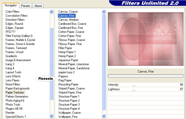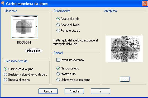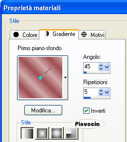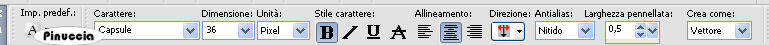 qui puoi trovare qualche risposta ai tuoi dubbi. Se l'argomento che ti interessa non è presente, ti prego di segnalarmelo. Per tradurre questo tutorial ho usato PSP X. Occorrente: Materiale qui Il tube è di @nn. Metti la maschera BC-05-04 nella cartella Maschere. Filtri: Filters Unlimited 2.0 qui Greg's Factory Output II qui Imposta il colore di primo piano con #D2AAAB, e il colore di sfondo con il bianco #9D4E50. 1. Apri una nuova immagine trasparente 700 x 500 pixels, e riempila con il colore di sfondo.2. Effetti>Plugins>Greg's Factory - Poolshadow: ![]() 3. Livelli>Nuovo livello raster. Riempi il livello con il colore di primo piano.4. Effetti>Plugins>Greg's Factory - Poolshadow, con i settaggi precedenti. 5. Livelli>Carica/Salva maschera>Carica maschera da disco. Cerca e carica la maschera Masker BC-05-04-1: ![]() 6. Livelli>Elimina e rispondi sì alla domanda Unire la maschera nel livello corrente. ![]() Livelli>Unisci>Unisci gruppo. 7. Livelli>Unisci>Unisci visibile. Regola>Messa a fuoco>Metti a fuoco. 8. Effetti>Plugins>Filters Unlimited 2.0 - Paper Textures - Canvas,Fine: ![]() 9. Livelli>Nuovo livello raster. 10. Attiva lo strumento Penna con i seguenti settaggi:Linea di stile: Punto ![]() 11. Traccia una linea nel perimetro del blocco superiore: ![]() 12. Effetti>Effetti 3D>Sfalsa ombra. ![]() Regola>Messa a fuoco>Metti a fuoco. 14. Apri il tube del vaso. Elimina il livello del watermark. Regola>Tonalità e saturazione>Viraggio: ![]() 14. Regola>Messa a fuoco>Metti a fuoco 1 o 2 volte. 15. Attiva lo strumento Selezione , rettangolo,e traccia una selezione intorno al fiore sulla destra: ![]() 16. Modifica>Copia. non chiuderlo, perchè ti servirà ancora. Modifica>Incolla come nuova IMMAGINE. 17. Immagine>Ridimensiona, a 250 pixels di larghezza, tutti i livelli selezionato. 18. Immagine>rifletti. Modifica>Copia. Torna al tuo lavoro e vai a Modifica>Incolla come nuovo livello. Sposta il tube a destra, nel riquadro punteggiato.![]() 19. Abbassa l'opacità di questo livello al 34%. 20. Attiva nuovamente il tube del vaso. Selezione>Deseleziona. Modifica>Copia. Torna al tuo lavoro e vai a Modifica>Incolla come nuovo livello. Spostalo a sinistra.![]() 21. Effetti>Effetti 3D>Sfalsa ombra: ![]() Livelli>Unisci>Unisci visibile. 22. Selezione>Seleziona tutto. Selezione>Modifica>Contrai - 3 pixels. Modifica>Copia. Modifica>Incolla come nuova immagine. Questo passaggio è stato eseguito per ridurre la dimensione del bordo. Puoi continuare su questa immagine, o sulla precedente: come preferisci. 23. Passa il colore di sfondo a Gradiente. ![]() 24. Attiva lo strumento Testo con i seguenti settaggi:![]() se non hai il font Capsule clicca qui Scrivi un testo e posizionalo. Livelli>Converti in livello raster. 25. Effetti>Effetti 3D>Sfalsa ombra: ![]() Regola>Messa a fuoco>Metti a fuoco. Livelli>Unisci>Unisci tutto. Regola>Tonalità e saturazione>Viraggio: ![]() Firma il tuo lavoro e salva in formato jpg. Se vuoi realizzare lo script, ti occorrono anche due immagini di sfondo. Per realizzare lo script - che trovi qui puoi seguire i soliti preliminari descritti alla fine di questo tutorial, e sostituire le immagini, con le dovute variazioni, come spiegato nei precedenti tutorial. Se hai problemi o dubbi, o trovi un link non funzionante, o anche soltanto per un saluto, scrivimi. 4 Febbraio 2009 |