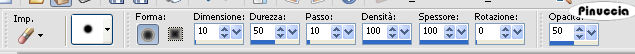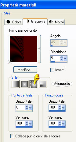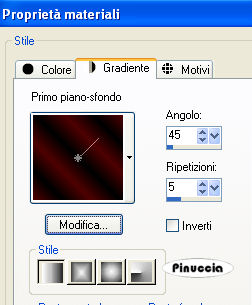 qui puoi trovare qualche risposta ai tuoi dubbi. Se l'argomento che ti interessa non è presente, ti prego di segnalarmelo. Per tradurre questo tutorial ho usato PSP X. Occorrente: Materiale qui L'immagine della ballerina è stata trovata in rete. Il tube dei violini è di Suzi Sgai. Non aprire danseres.gif in PSP. Ti servirà per lo script. Filtri: FM Tile Tools qui ![]() Se non vuoi sentire la musica premi il tasto ESC Imposta il colore di primo piano con #4f0000, e il colore di sfondo con #000000 (nero). Passa il colore di primo piano a Gradiente di primo piano/sfondo con i seguenti settaggi: ![]() 1. Apri una nuova immagine trasparente 600 x 450 pixels, e riempila con il gradiente.Attiva lo strumento Spostamento e sposta l'immagine a destra di 25 pixels.(tenendo premuto il tasto Ctrl, 2 clic con la freccia a destra e, usando soltanto la freccia 5 clic a destra: sull'uso dello strumento Spostamento abbinato alle frecce della tastiera, vedi qui) ![]() 2. Livelli>Nuovo livello raster. Riempi il livello con il gradiente.Clicca con la bacchetta magica sulla parte destra,![]() e premi sulla tastiera il tasto CANC ![]() Selezione>Deseleziona. 3. Livelli>Duplica. Immagine>Rifletti. 4. Livelli>Unisci>Unisci tutto. 5. Immagine>Aggiungi bordatura, 1 pixels, simmetriche, con il colore bianco. Seleziona il bordo bianco con la bacchetta magica ![]() Imposta il colore di primo piano con un motivo oro: ![]() se non hai un motivo oro, prendilo qui Riempi la selezione con il motivo oro.6. Immagine>Aggiungi bordatura, 3 pixels, simmetriche, con il colore di primo piano. 7. Immagine>Aggiungi bordatura, 1 pixels, simmetriche, con il colore bianco. Seleziona il bordo bianco con la bacchetta magica ![]() e riempilo con il motivo oro.8. Immagine>Aggiungi bordatura, 20 pixels, simmetriche, con il colore di primo piano. Cambia i settaggi del gradiente. ![]() Riempi la selezione con il gradiente.Selezione>Deseleziona. 9. Immagine>Aggiungi bordatura, 1 pixels, simmetriche, con il colore bianco. Seleziona il bordo bianco con la bacchetta magica ![]() e riempilo con il motivo oro.10. Apri il tube muziek e vai a Modifica>Copia. Torna al tuo lavoro e vai a Modifica>Incolla come nuovo livello. Spostalo in basso a sinistra.11. Effetti>Plugins>FM Tile Tools - Blend Emboss, con i settaggi standard - 2 volte. ![]() 12. Apri il tube della ballerina (non la gif), e vai a Modifica>Copia. Torna al tuo lavoro e vai a Modifica>Incolla come nuovo livello. Spostalo a destra.13. Il tube non ha una buona qualità, per questo attiva lo strumento Gomma con i seguenti settaggi:![]() e cancella i bordini bianchi dal vestito e i puntini dalle braccia (ma soltanto se hai la mano ferma). 15. Apri il tube muzieknote, e vai a Modifica>Copia. Torna al tuo lavoro e vai a Modifica>Incolla come nuovo livello. Spostalo in alto a sinistra.Ripeti Modifica>Incolla come nuovo livello e sposta più in basso e a destra delle precedenti.Se vuoi, aggiungi il tuo nome e/o il tuo watermark. 16. Livelli>Unisci>Unisci tutto e salva in formato jpg. Per realizzare lo script ti occorre anche un'immagine di sfondo. Per realizzare lo script - che trovi nel materiale (perchè il sito è chiuso) puoi seguire i soliti preliminari descritti alla fine di questo tutorial, e sostituire le immagini, con le dovute variazioni, come spiegato nei precedenti tutorial. Se hai problemi o dubbi, o trovi un link non funzionante, o anche soltanto per un saluto, scrivimi. 13 Agosto 2009 |