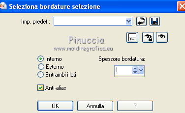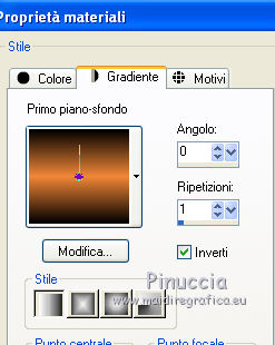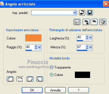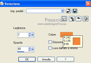 qui puoi trovare qualche risposta ai tuoi dubbi. Se l'argomento che ti interessa non è presente, ti prego di segnalarmelo. Per tradurre questo tutorial ho usato PSP X. Occorrente: Materiale qui Il tube della farfalla è di Brigitte-Marion. Filtri: Simple qui ![]() Imposta il colore di primo piano con #f28737, e il colore di sfondo con #000000 (nero). Passa il colore di primo piano a Gradiente di primo piano/sfondo, con i seguenti settaggi: ![]() 1. Apri una nuova immagine trasparente 700 x 500 pixels, e riempila con il gradiente.2. Selezione>Seleziona tutto. Selezione>Modifica>Contrai - 100 pixels. Selezione>Inverti. 3. Effetti>Plugins>Simple - Diamonds. Modifica>Ripeti Diamonds. 4. Regola>Messa a fuoco>Metti a fuoco - 2 volte. Mantieni selezionato. 5. Livelli>Nuovo livello raster. Riempi con il gradiente.Abbassa l'opacità di questo livello al 65%. 6. Effetti>Effetti 3D>Sfalsa ombra, con il colore nero. ![]() Ripeti l'Effetto Sfalsa ombra, cambiando verticale e orizzontale con -5. 6. Selezione>Inverti. Livelli>Unisci>Unisci visibile - mantieni selezionato. 7. Effetti>Effetti di immagine>Angolo arricciato. ![]() 8. Selezione>Seleziona tutto. Selezione>Modifica>Contrai - 35 pixels. Selezione>Inverti. 9. Livelli>Nuovo livello raster. Riempi con il gradiente.10. Effetti>Effetti di trama>Veneziana. ![]() 11. Selezione>Modifica>Seleziona bordature selezione. ![]() 13. Livelli>nuovo livello raster. Riempi con il colore di primo piano.non esitare a usare lo zoom o la rotellina del mouse per ingrandire l'immagine,e poter riempire correttamente lo spazio ristretto dei bordi. Selezione>Deseleziona. 14. Apri il tube con la stella - "ster" - e vai a Modifica>Copia. Torna al tuo lavoro e vai a Modifica>Incolla come nuovo livello. Sposta la stella sull'angolo arricciato.15. Apri il tube della farfalla e vai a Modifica>Copia. Torna al tuo lavoro e vai a Modifica>Incolla come nuovo livello. Spostalo al centro.16. Effetti>Effetti 3D>Sfalsa ombra. ![]() Regola>Messa a fuoco>Metti a fuoco. L'immagine principale è terminata. Per lo script ti occorre anche un'immagine di sfondo. Per realizzare lo script - che trovi qui puoi seguire i soliti preliminari descritti alla fine di questo tutorial, e sostituire le immagini, con le dovute variazioni, come spiegato nei precedenti tutorial. Se hai problemi o dubbi, o trovi un link non funzionante, o anche soltanto per un saluto, scrivimi. 9 Luglio 2011 |