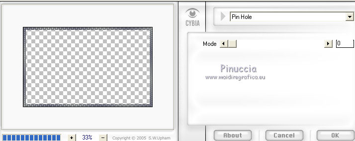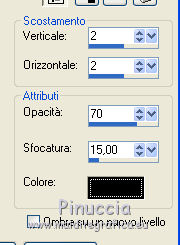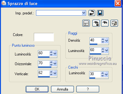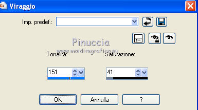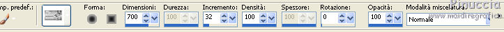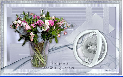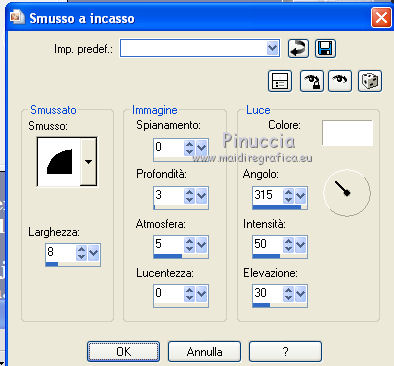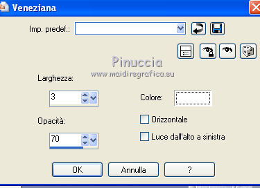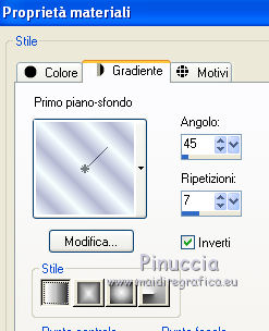 qui puoi trovare qualche risposta ai tuoi dubbi. Se l'argomento che ti interessa non è presente, ti prego di segnalarmelo. Per tradurre questo tutorial ho usato PSP X. Occorrente: Materiale qui I tubes sono di MarieL e Jeannette. Filtri: Greg's Factory Output qui Cybia Screenworks qui FM Tile Tools qui ![]() Metti il pennello Dark corner nella cartella Pennelli. Attenzione, il pennello è composto da due files che non devono essere separati. Vedi gli appunti sui pennelli qui Imposta il colore di primo piano con #b4b8d3, e il colore di sfondo con #f6ffff. 1. Apri una nuova immagine trasparente 700 x 400 pixels, e riempila con il colore di primo piano.2. Livelli>Nuovo livello raster. Attiva lo strumento Pennello ![]() cerca e seleziona il pennello Dark corner - dimensione 700, ![]() e applicalo al centro dell'immagine, cliccando con il tasto destro del mouse per usare il colore di sfondo. L'altezza del pennello supera i 400 pixels della tua immagine, per questo il risultato potrebbe essere diverso dal mio. Se il tuo psp non supporta pennelli superiori a 500 pixels, imposta i settaggi del pennello a 500, e - una volta applicato - premi il tasto D per attivare lo strumento Deformazione ![]() e tira il pennello per tutta la larghezza dell'immagine. ![]() Livelli>Unisci>Unisci visibile. 3. Effetti>Plugins>FM Tile Tools - Blend Emboss - 2 volte con i settaggi standard. ![]() 4. Clicca con la bacchetta magica nella parte sinistra per selezionarla.Se hai difficoltà ad usare la bacchetta, eventualmente puoi usare lo strumento Selezione a mano libera ![]() e tracciare una selezione pressappoco come nell'esempio. ![]() 5. Effetti>Plugins>Greg's Factory Output II - Pool shadow. ![]() ricorda che, se non vuoi aggiungere nuovi filtri ai tuoi Percorsi Files, questo filtro è identico al Pool Shadow di Tramages e al Cross shadow di Graphics Plus Selezione>Deseleziona. 6. Immagine>Aggiungi bordatura, 1 pixel, simmetriche, con il colore di primo piano. Immagine>Aggiungi bordatura, 20 pixels, simmetriche, con il colore di sfondo. Seleziona questo bordo con la bacchetta magica ![]() Passa il colore di primo piano a Gradiente. ![]() Riempi la selezione con il gradiente.7. Effetti>Effetti di trama>Veneziana. ![]() Regola>Messa a fuoco>Metti a fuoco. Selezione>Deseleziona. 8. Immagine>Aggiungi bordatura, 3 pixels, simmetriche, con il colore di sfondo. Selezione>Seleziona tutto. Selezione>Modifica>Contrai - 3 pixels. Selezione>Inverti. 9. Effetti>Effetti 3D>Smusso a incasso. ![]() Selezione>Deseleziona. 10. Immagine>Aggiungi bordatura, 15 pixels, simmetriche, con il colore di primo piano. Seleziona questo bordo con la bacchetta magica ![]() e riempilo con il gradiente.Livelli>Nuovo livello raster. Riempi nuovamente con il gradiente.11. Effetti>Plugins>Cybia - Screenworks - Pin Hole. ![]() Abbassa l'opacità di questo livello al 40%. Selezione>Deseleziona. Livelli>Unisci>Unisci visibile. 12. Apri il tube Mariel_2006_10Octobre_ArcZ01t". Elimina il livello del watermark. Immagine>Rifletti. Immagine>Ruota per gradi - 10 gradi a destra. ![]() 13. Attiva lo strumento Cambio Colore ,e clicca sull'anello esterno con il tasto destro del mouse per usare il colore di sfondo. Se stai usando PSP X o versioni precedenti, non avrai questo strumento. Puoi usare altri strumenti come Trasforma in destinazione, o il viraggio, ma non otterresti un risultato ottimale. Se vuoi, usa il tube già "trattato" prendendolo qui. 14. Modifica>Copia. Torna al tuo lavoro e vai a Modifica>Incolla come nuovo livello. Spostalo in basso a destra, pressappoco come nel mio esempio.15. Effetti>Effetti 3D>Sfalsa ombra. ![]() 16. Attiva il livello inferiore. 17. Effetti>Effetti di illuminazione>Sprazzo di luce. ![]() 18. Apri il tube Mariel_smoke e vai a Modifica>Copia. Torna al tuo lavoro e vai a Modifica>Incolla come nuovo livello. Regola>Tonalità e saturazione>Viraggio. ![]() Spostalo in basso.19. Apri il tube "bouquet" e vai a Modifica>Copia. Torna al tuo lavoro e vai a Modifica>Incolla come nuovo livello. Spostalo in basso a sinistra.![]() Livelli>Unisci>Unisci visibile. 20. Immagine>Aggiungi bordatura, 3 pixels, simmetriche, con il colore di sfondo. Selezione>Seleziona tutto. Selezione>Modifica>Contrai - 3 pixels. Selezione>Inverti. 21. Effetti>Effetti 3D>Smusso a incasso, con i settaggi precedenti. Selezione>Deseleziona. L'immagine principale è terminata. Per lo script ti occorre anche un'immagine di sfondo, e la gif della farfalla che dovrai inserire nello script 3 volte. Per realizzare lo script di Jeannette - che trovi nel materiale - puoi seguire i soliti preliminari descritti alla fine di questo tutorial, e sostituire le immagini, con le dovute variazioni, come spiegato nei precedenti tutorial. Se hai problemi o dubbi, o trovi un link non funzionante, o anche soltanto per un saluto, scrivimi. 9 Luglio 2011 |