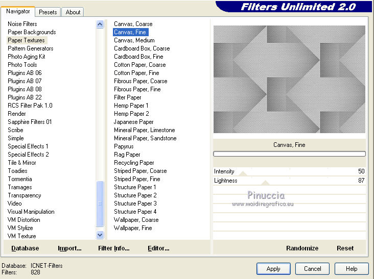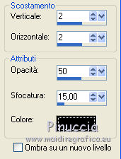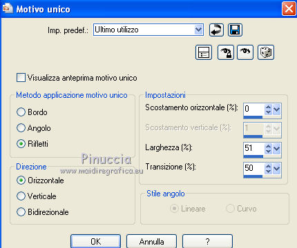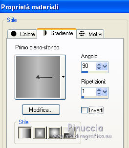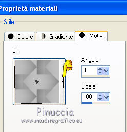 qui puoi trovare qualche risposta ai tuoi dubbi. Se l'argomento che ti interessa non è presente, ti prego di segnalarmelo. Per tradurre questo tutorial ho usato PSP X. Occorrente: Materiale qui I tubes sono di Marion. Filtri: Simple qui Filters Unlimited 2.0 qui ![]() Imposta il colore di primo piano con #808080, e il colore di sfondo con #c0c0c0. Passa il colore di primo piano a Gradiente, con i seguenti settaggi. ![]() 1. Apri il tube con la freccia "pijl". Attiva lo strumento Bacchetta magica e clicca sulla parte nera per selezionarla.Riempi la selezione con il gradiente.2. Livelli>Nuovo livello raster. Livelli>Disponi>Porta sotto. Riempi con il colore di sfondo.Livelli>Unisci>Unisci visibile. 3. Effetti>Plugins>Simple - Half Wrap. Effetti>Plugins>Simple - Quick Tile. Minimizza l'immagine. Passa il colore di primo piano a Motivi e cerca l'immagine nella lista dei motivi disponibili. ![]() 4. Apri una nuova immagine trasparente 700 x 500 pixels, e riempila con il motivo di primo piano.5. Effetti>Effetti di bordo>Aumenta. 6. Effetti>Plugins>Filters Unlimited - Paper Textures - Canvas Fine. ![]() 7. Apri il tube con la donna e vai a Modifica>Copia. Torna al tuo lavoro e vai a Modifica>Incolla come nuovo livello. Spostalo a sinistra, pressappoco come nel mio esempio.![]() 8. Regola>Tonalità e saturazione>Viraggio. ![]() 9. Effetti>Effetti 3D>Sfalsa ombra: ![]() Regola>Messa a fuoco>Metti a fuoco. 10. Apri il tube con l'uomo e vai a Modifica>Copia. Torna al tuo lavoro e vai a Modifica>Incolla come nuovo livello. Spostalo a destra.11. Regola>Tonalità e saturazione>Viraggio. ![]() Effetti>Effetti 3D>Sfalsa ombra: ![]() Regola>Messa a fuoco>Metti a fuoco. 12. Controlla che tutto sia correttamente posizionato. Livelli>Unisci>Unisci visibile. 13. Duplica l'immagine con la combinazione di tasti maiuscola+D. Immagine>Rifletti. Salva le due immagini come "immagine sinistra" e "immagine destra". 14. Attiva la piccola immagine che hai usato per creare il motivo di primo piano. ![]() Effetti>Plugins>Filters Unlimited 2.0 - Paper Texture - Canvas Fine, con i settaggi precedenti. ![]() 15. Effetti>Effetti di immagine>Motivo unico. ![]() Salva l'immagine come sfondo per lo script. Adesso hai tutto ciò che ti occorre per realizzare lo script. Per realizzare lo script - che trovi qui puoi seguire i soliti preliminari descritti alla fine di questo tutorial, e sostituire le immagini, con le dovute variazioni, come spiegato nei precedenti tutorial. Se hai problemi o dubbi, o trovi un link non funzionante, o anche soltanto per un saluto, scrivimi. 9 Luglio 2011 |